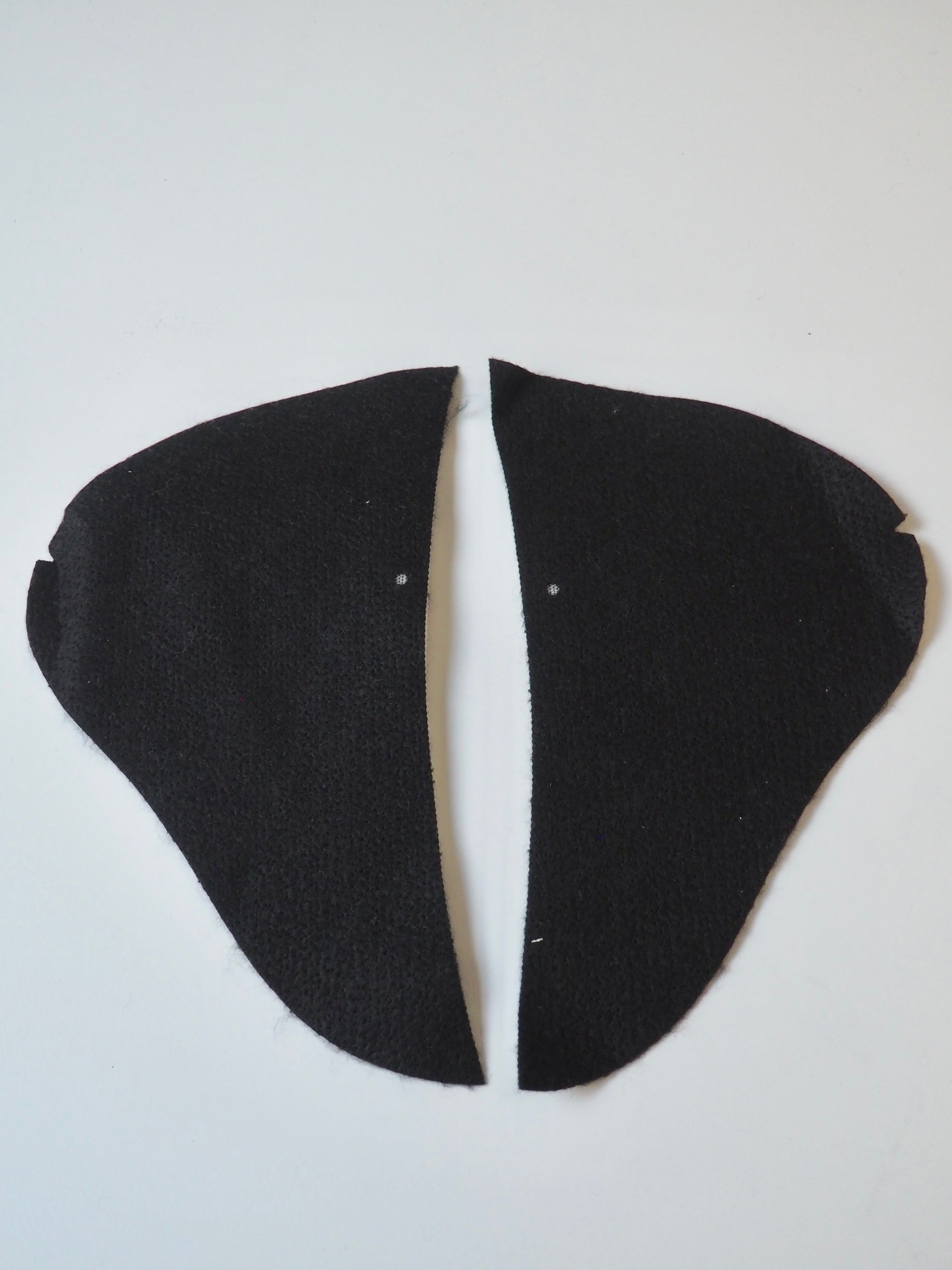 This ex-designer trim is a pair of shoulder pads. They are made up of two layers of structured felt around a canvas layer and several layers of shaped wadding in the centre. The layers have been needlepunched together to ensure a rigid supportive structure. They are a large elongated triangular shape which could also be adjusted for the desired fit and effect. Perfect to add shape to the shoulder of a jacket or staple winter coat!