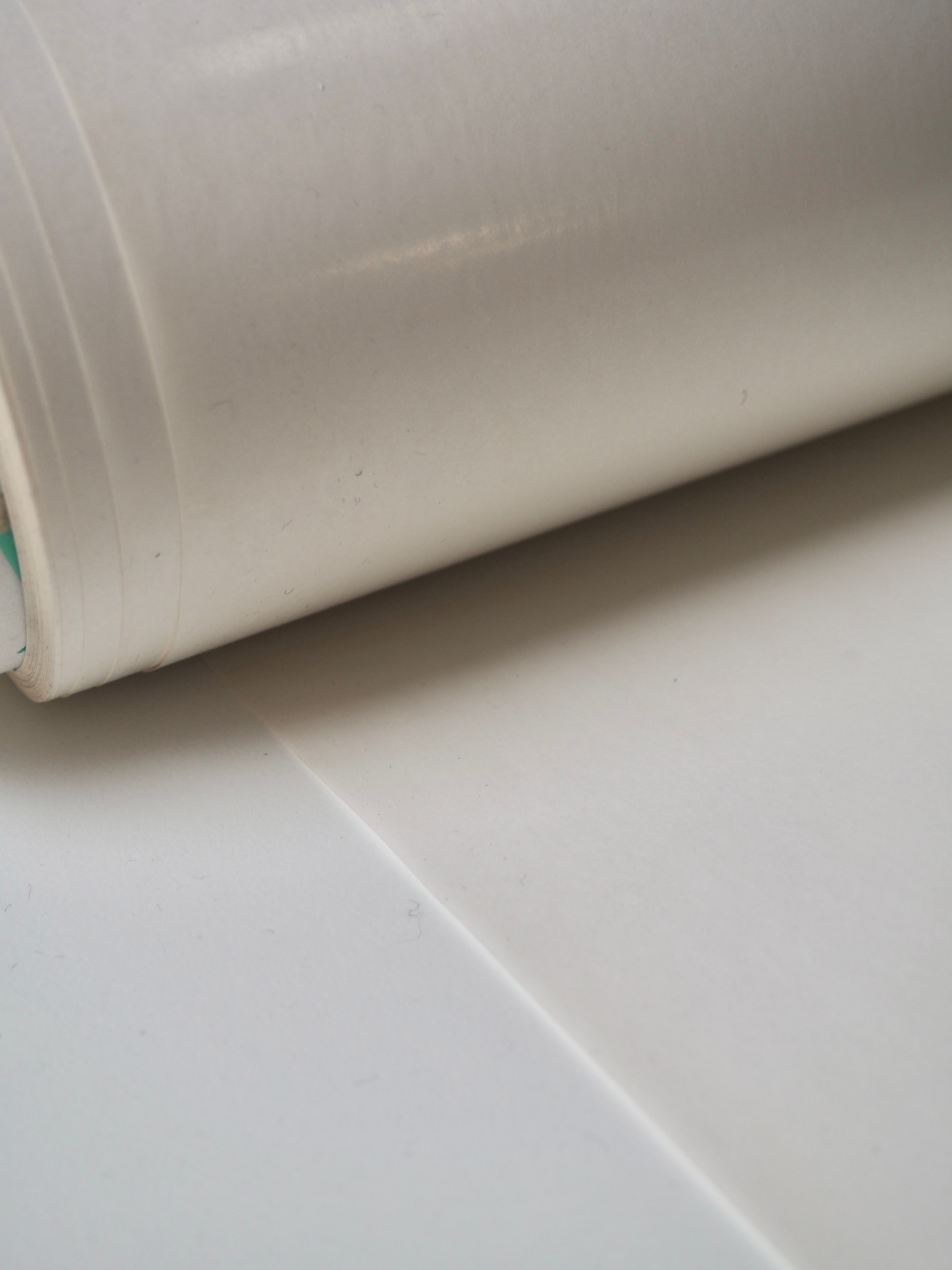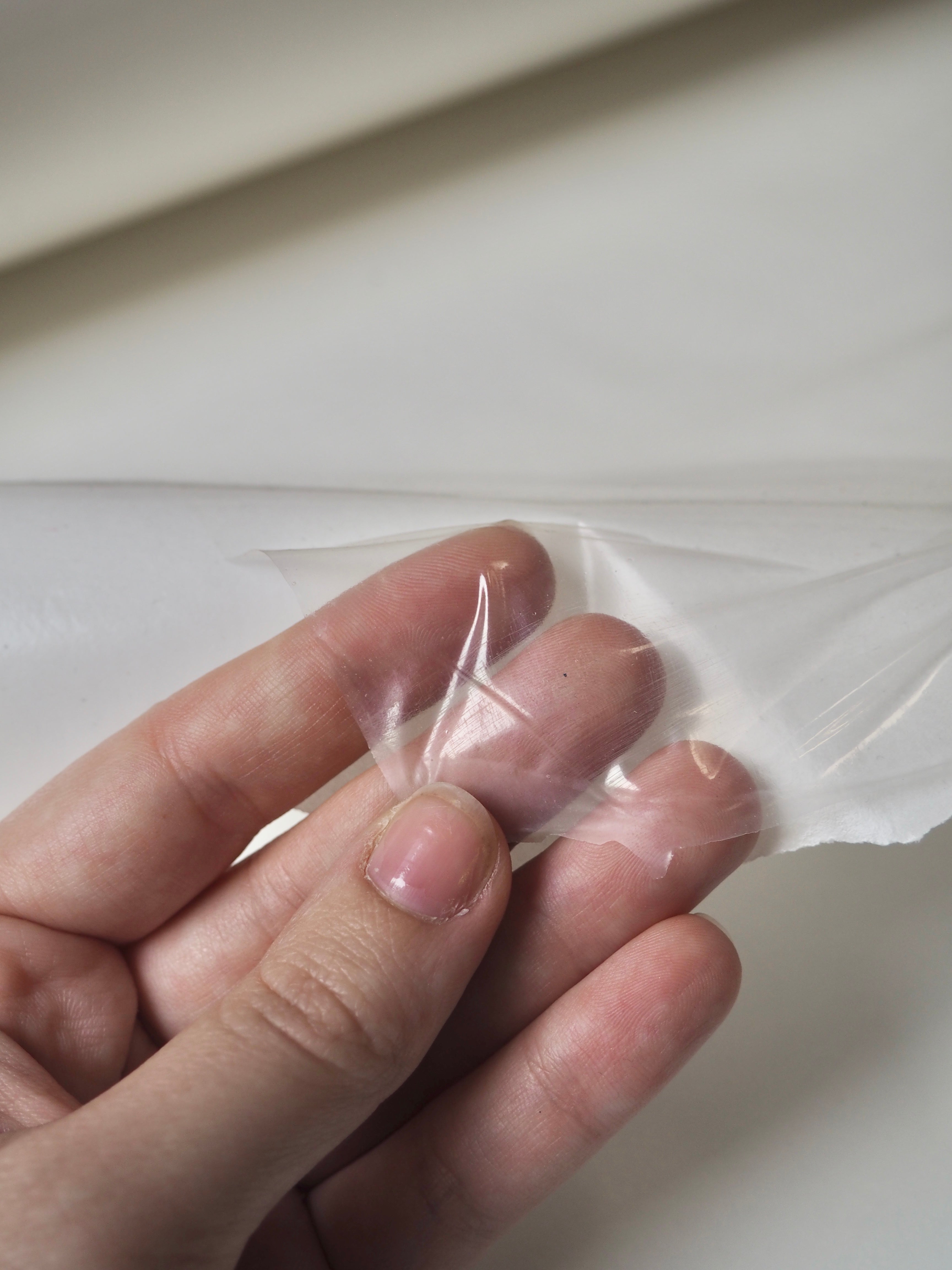 This ex-designer fabric is a translucent polyurethane. It's very lightweight and sheer, with a slightly sticky feeling handle. Has a drapier movement. It's backed with a plastic coated paper that isn't attached for easier transport/storage. It's great for technical projects!