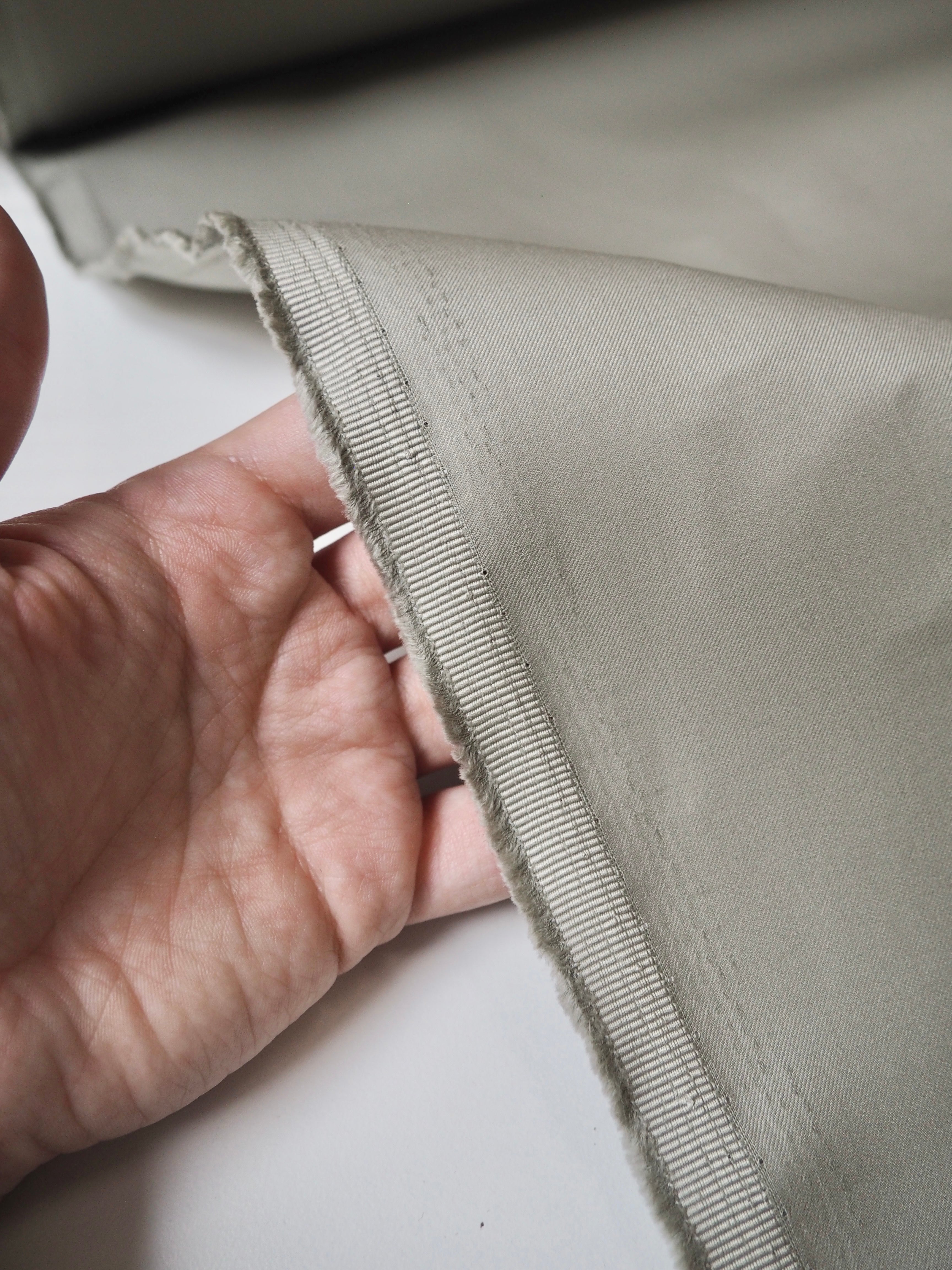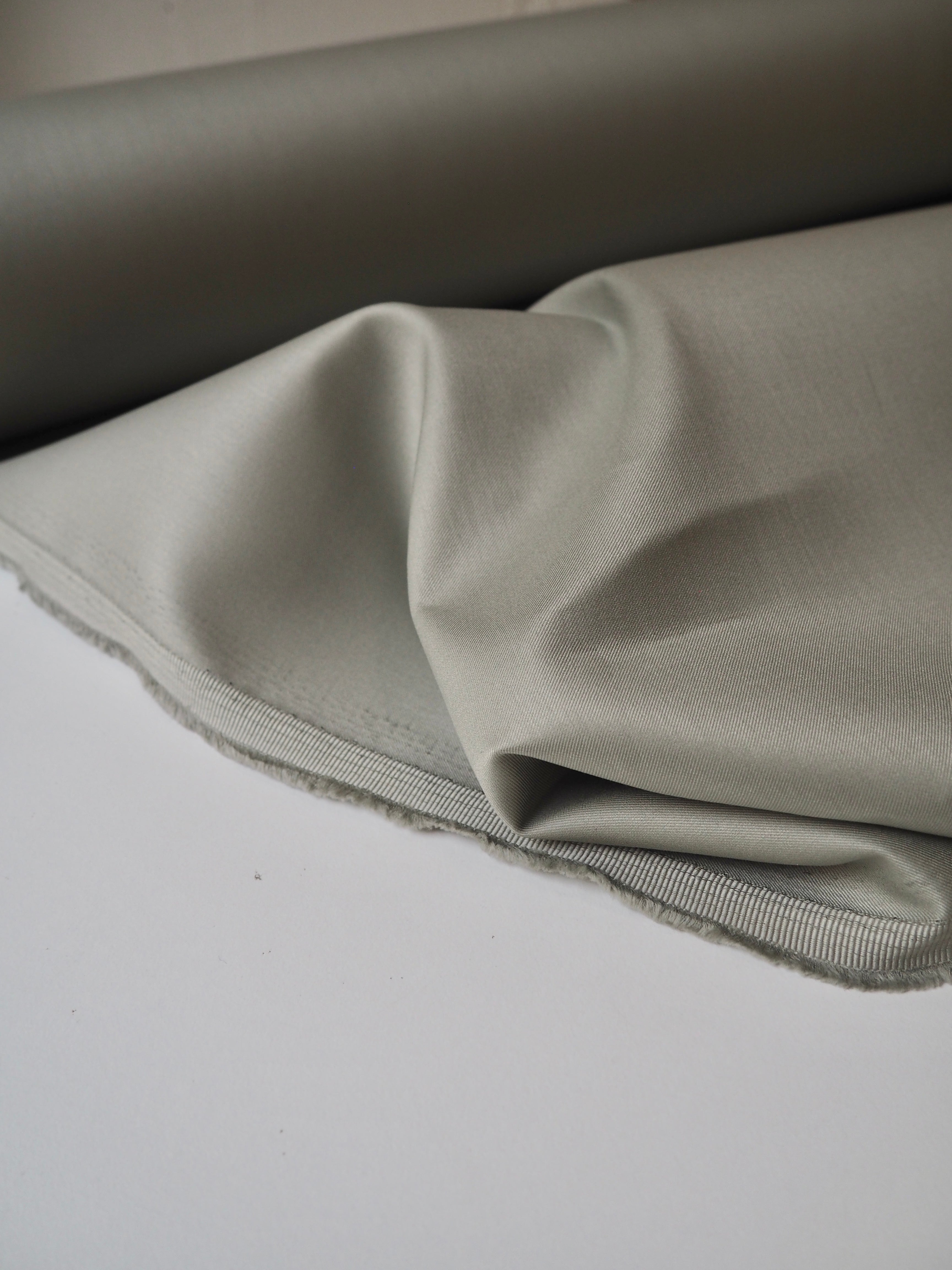 This ex-designer fabric is a double cotton twill. In a pale grey-ish eucalyptus colour. It's double faced, with a very structured handle and sateen finish on both sides. It's medium to heavy weight, with a lovely soft feel. We love this for jacket!