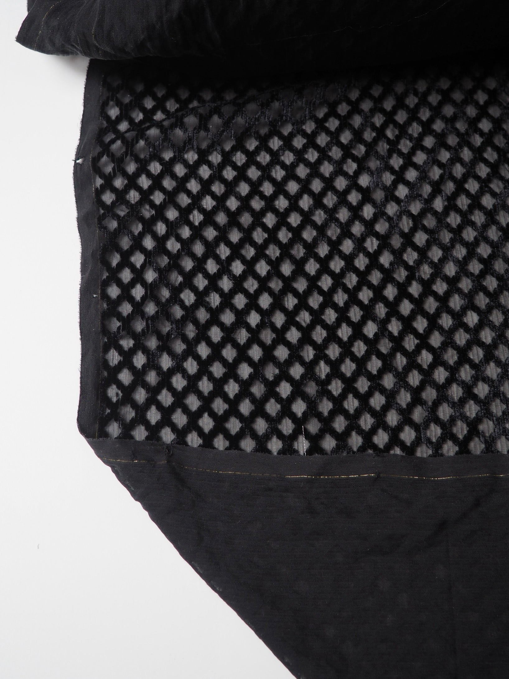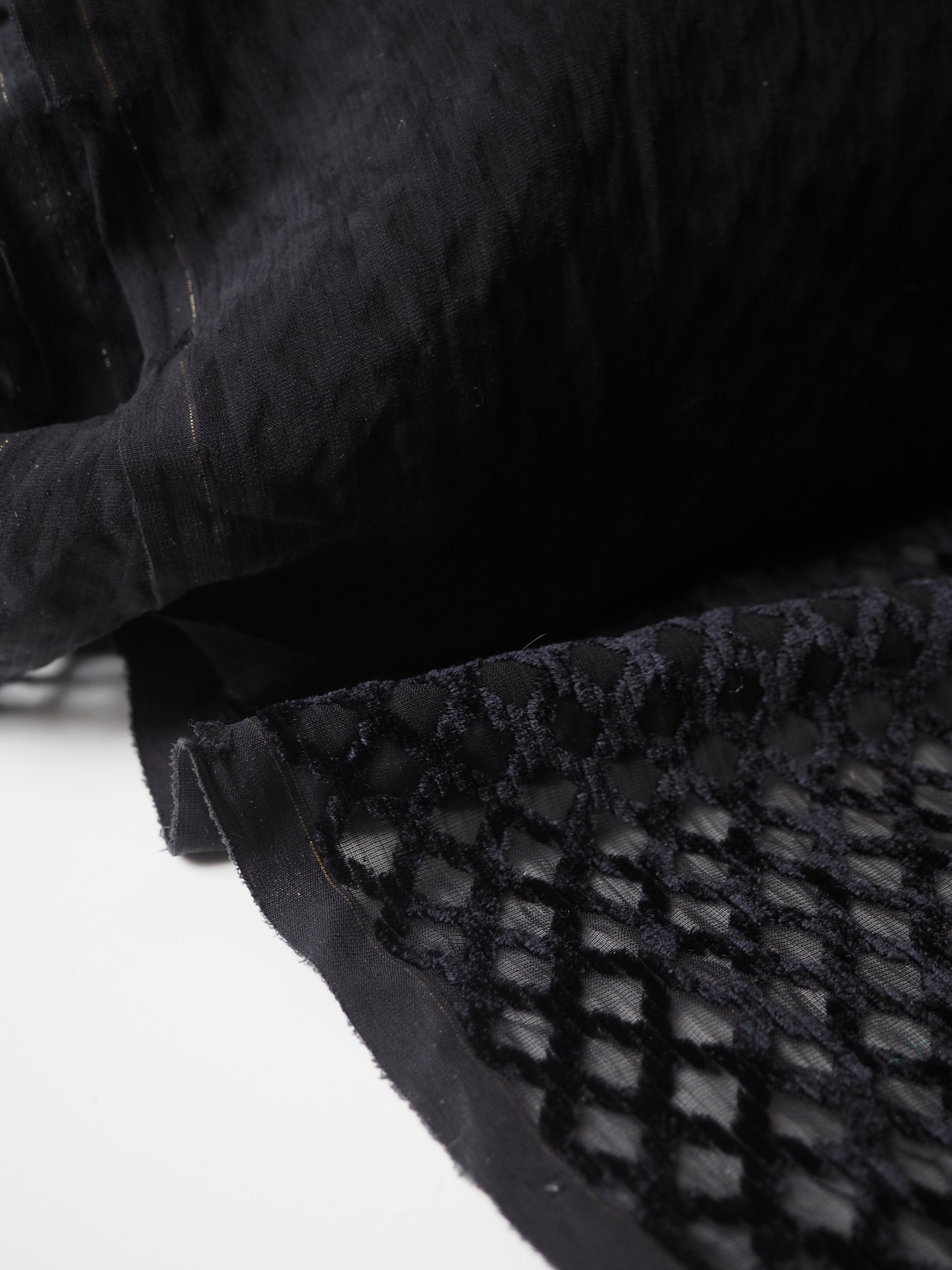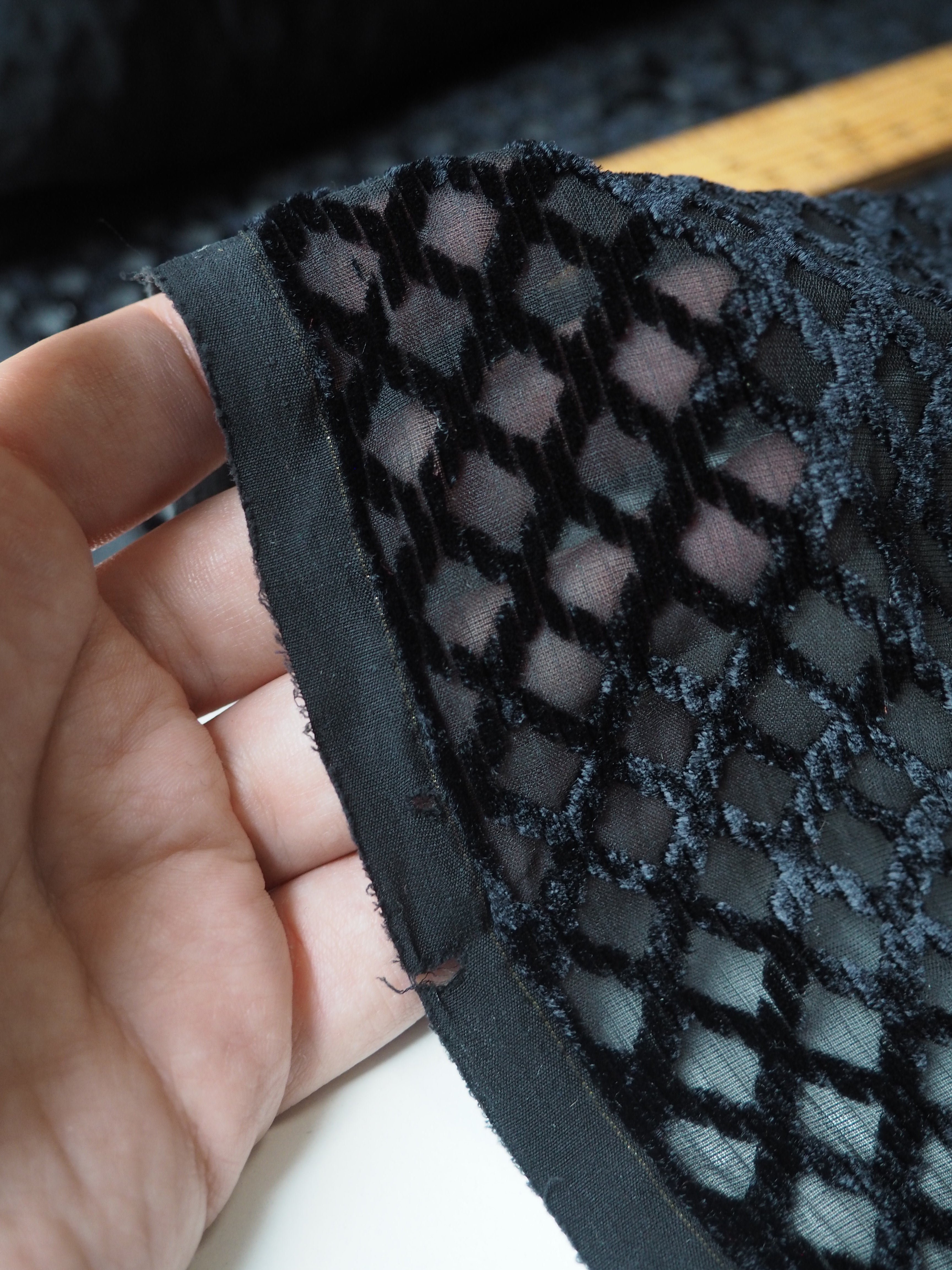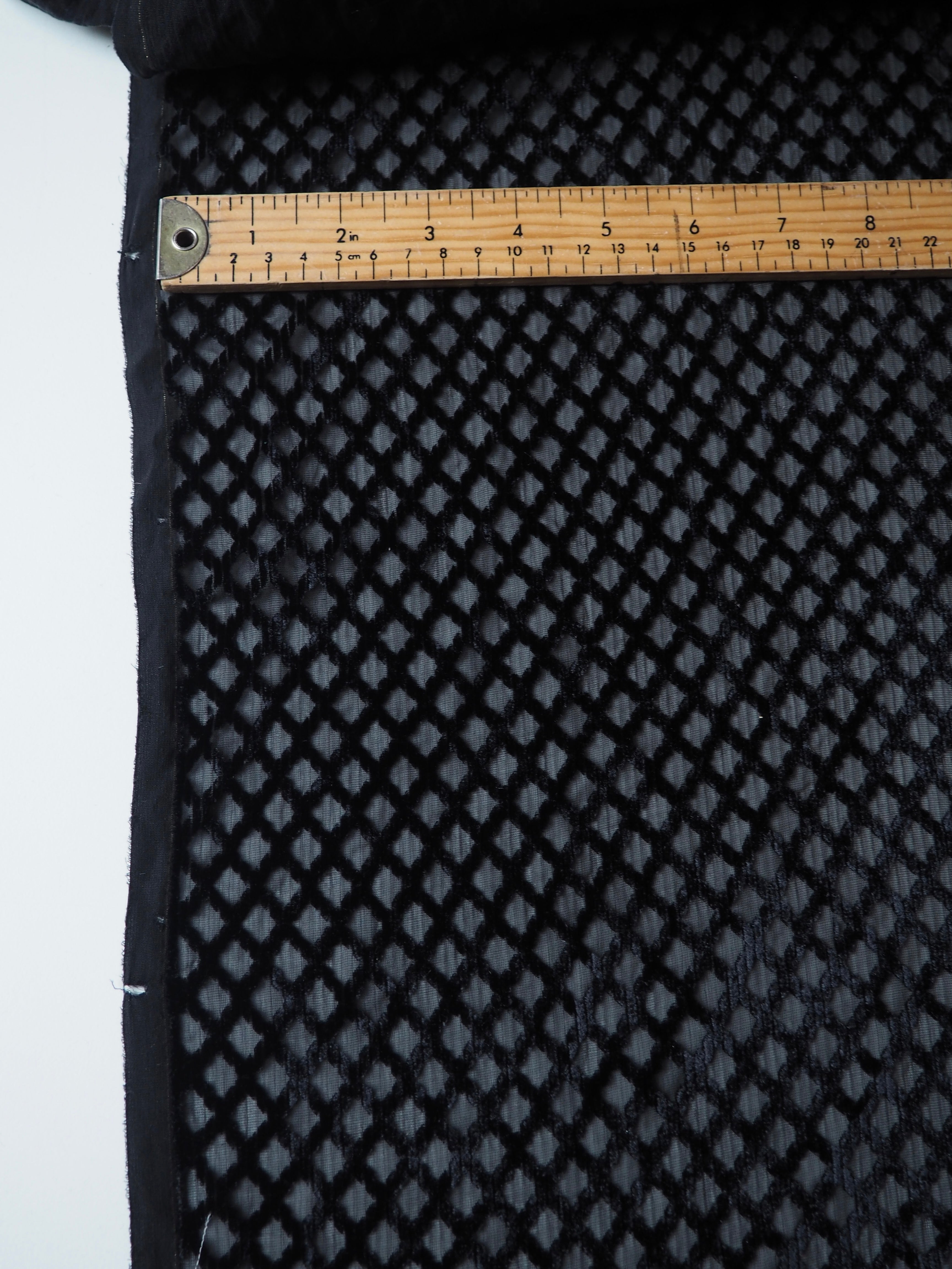 This ex-designer fabric is a beautiful chiffon. Black velvet diamond lattices cover the cloth, with a sheer chiffon opposite. It has such a luxurious silk/viscose handle! Very slinky and semi-sheer, with an incredible drape and fantastic movement. It has a lovely shine to finish off. Would look amazing as a blouse or as the overlay of a fancy dress!