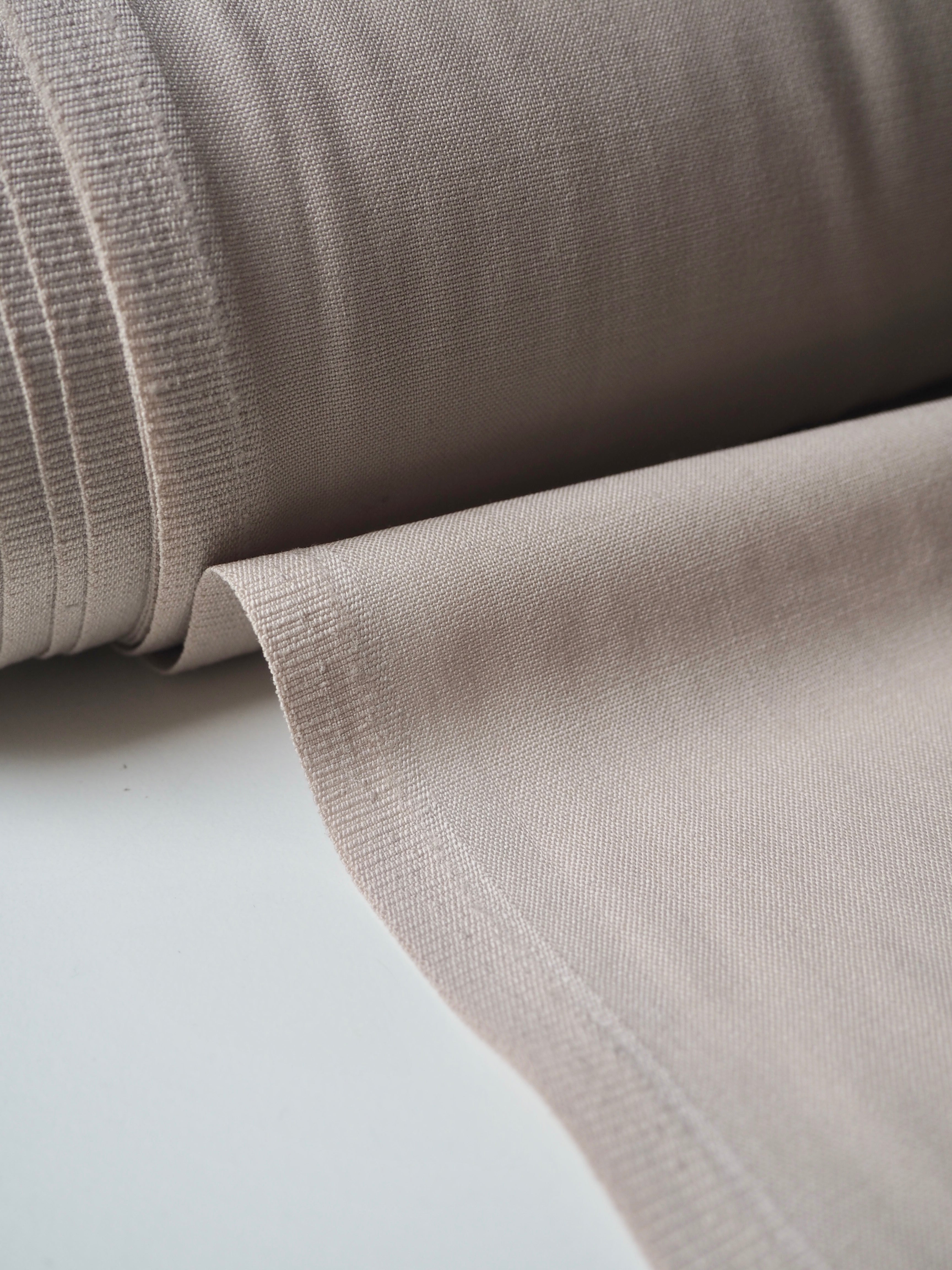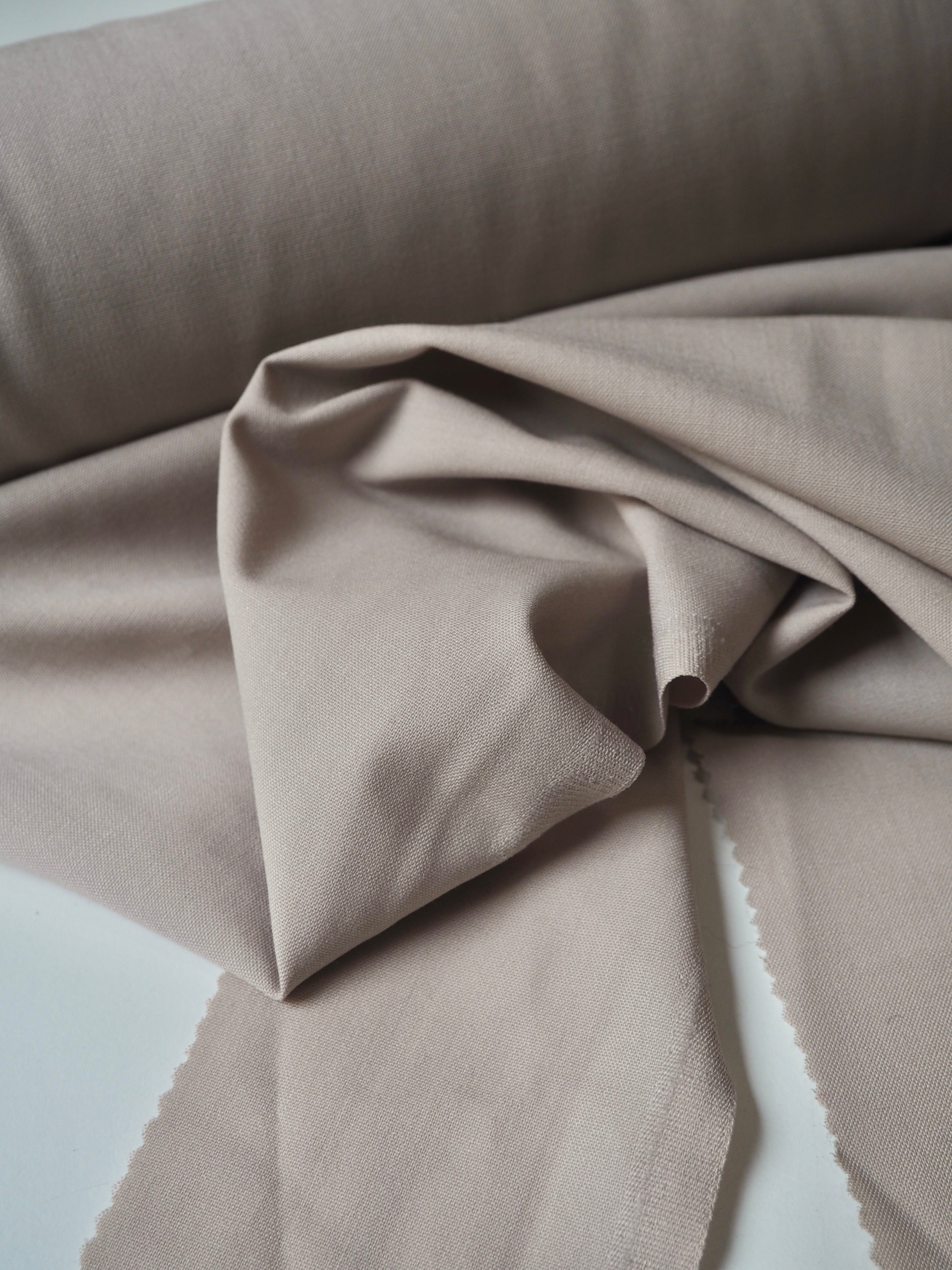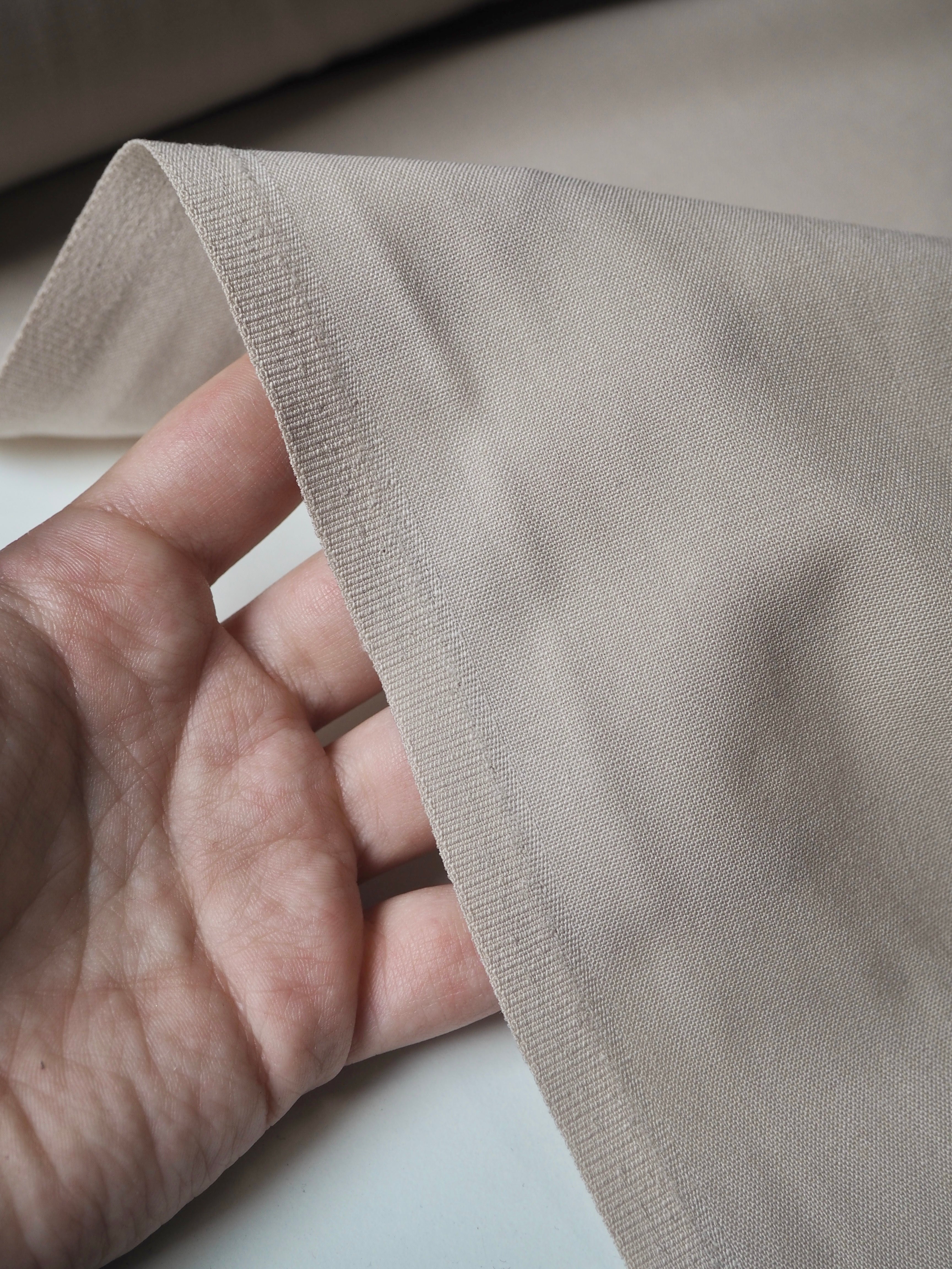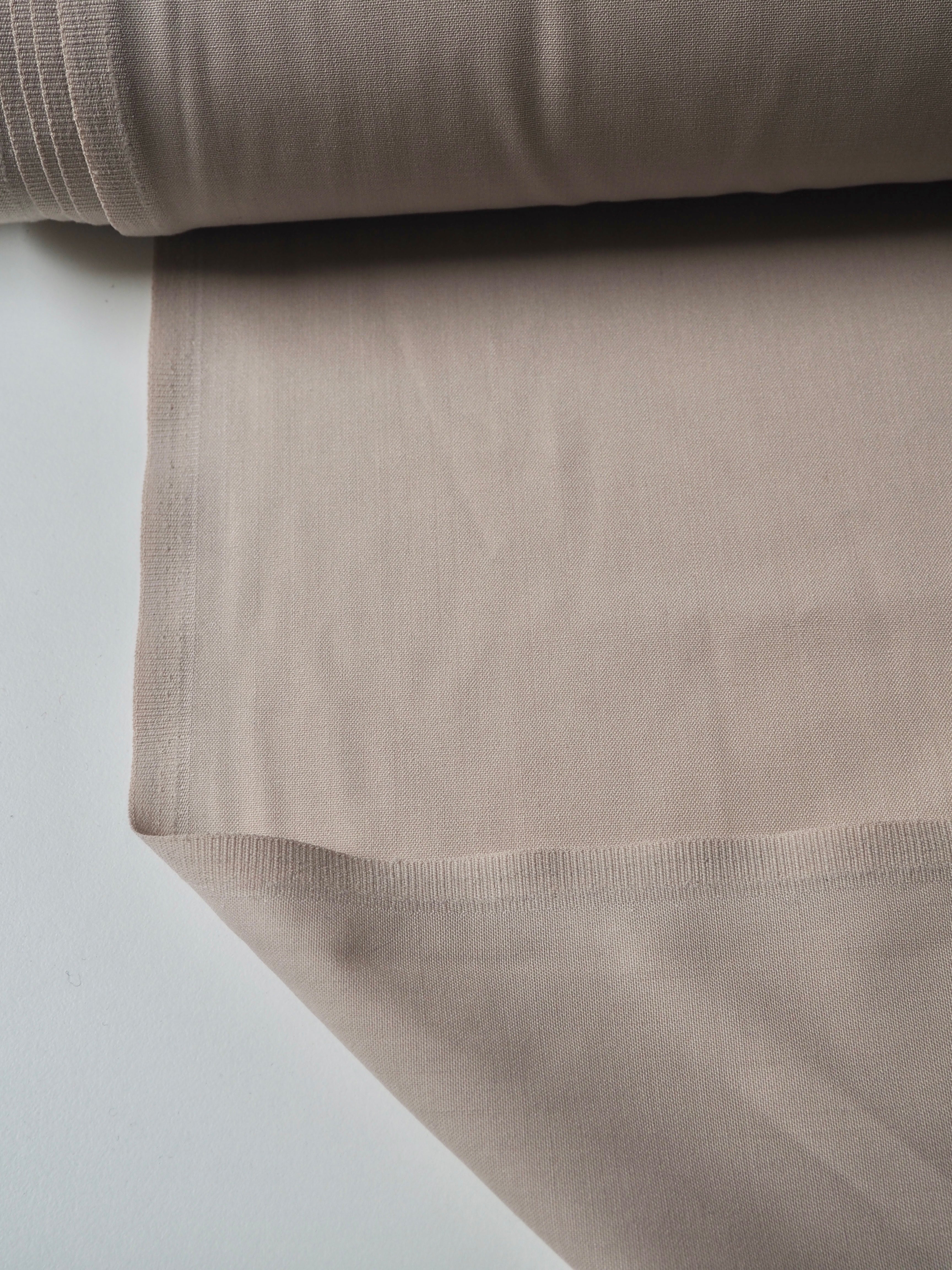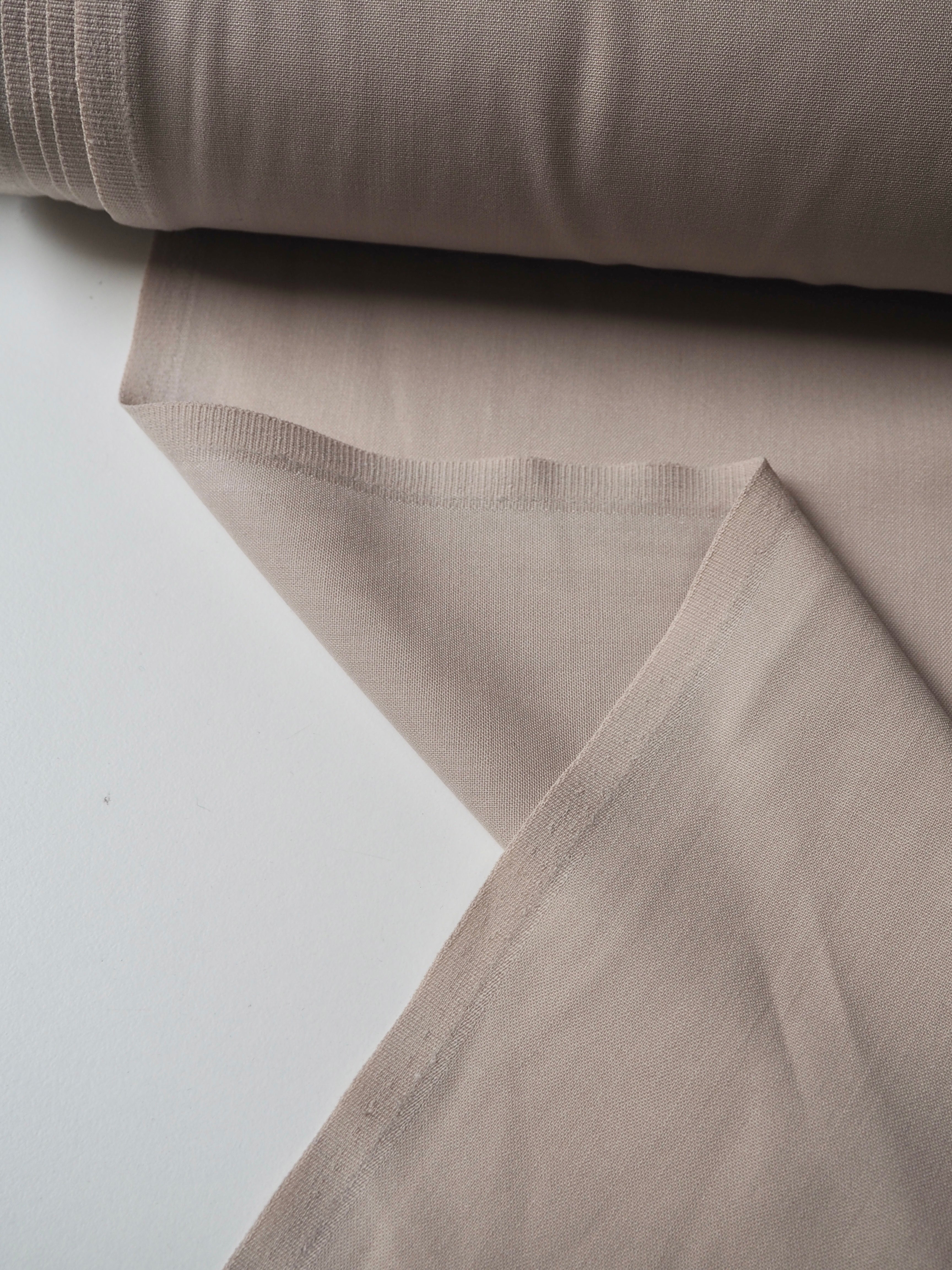 This ex-designer fabric is a wool suiting. It's in a classic beige shade with a plain weave. It's blended with polyester, which gives it extra strength. Fully opaque. Light to medium weight, quite warm, with a nice drape and lovely handle. Perfect for trousers!