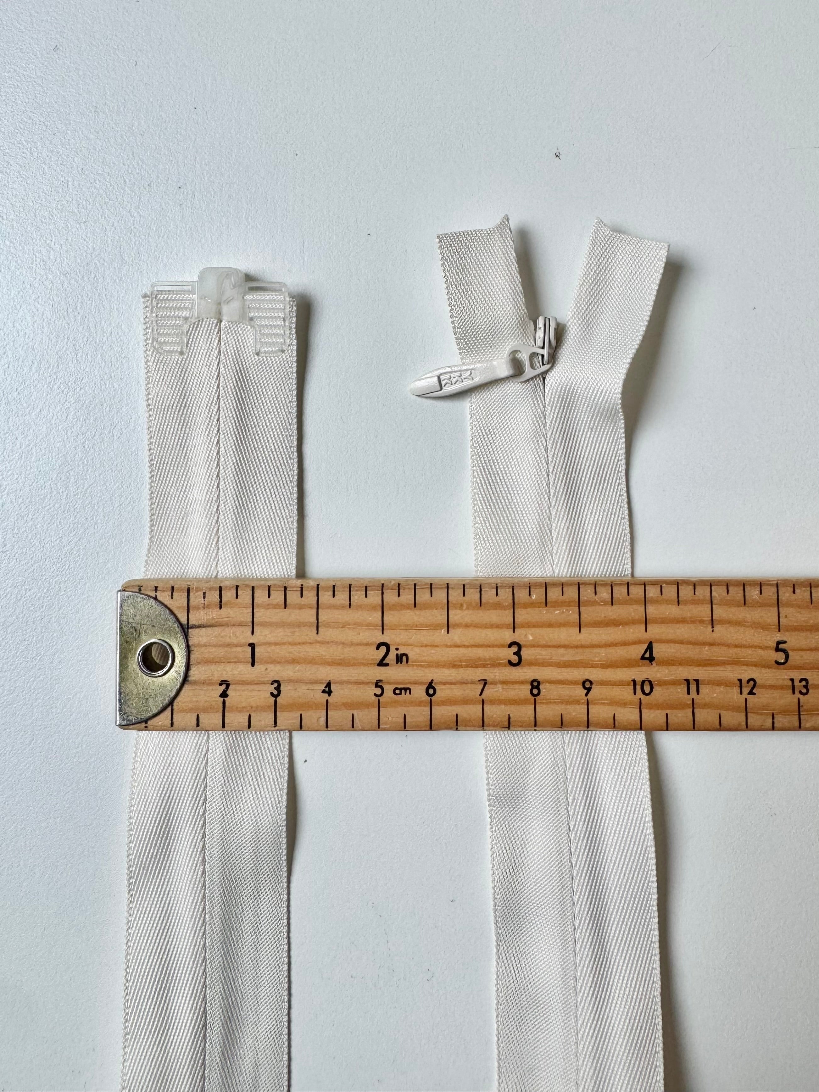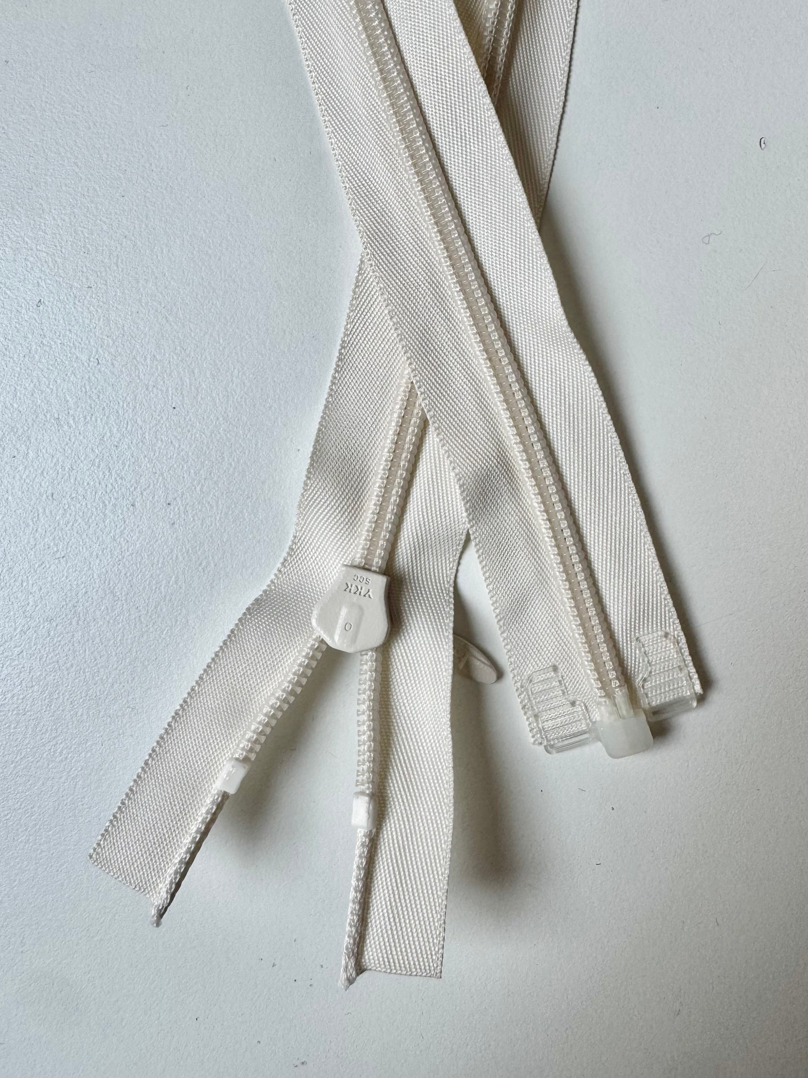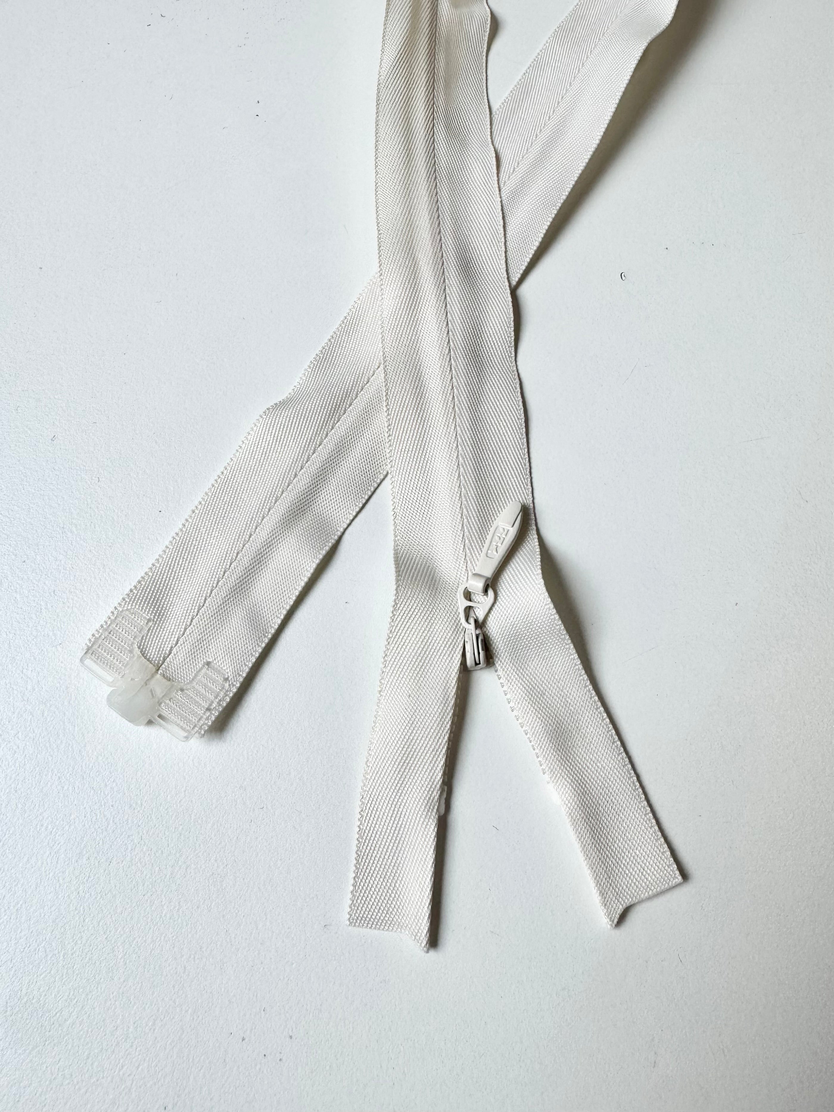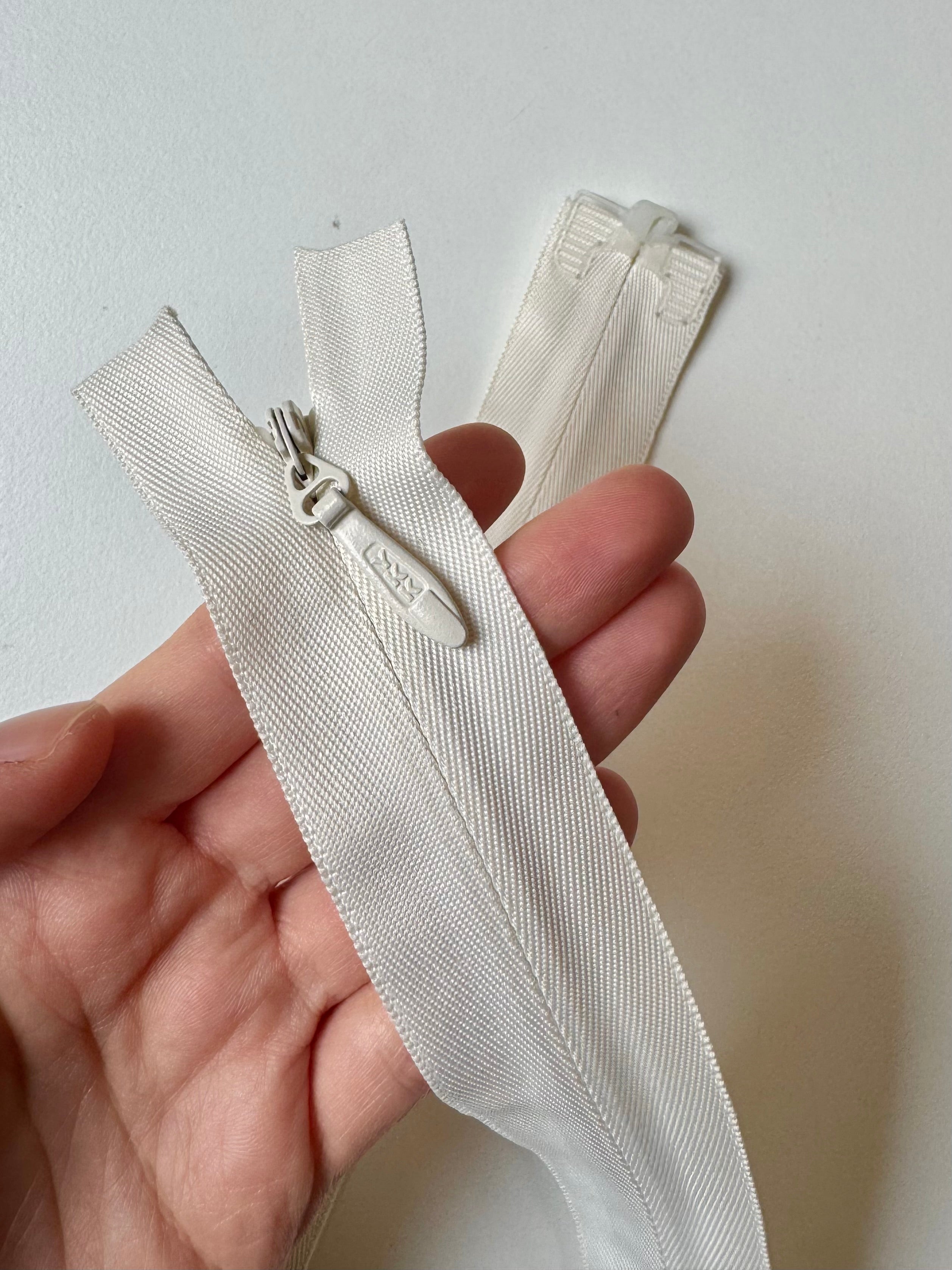 Ex-designer deadstock zips sourced from one of our favourite London based designers. YKK invisible zip. Tonal plastic teeth, metal pull and 3.2cm extra wide zip tape. Perfect for using as a hidden closure! These zips are open ended with a plastic stopper at the end.
