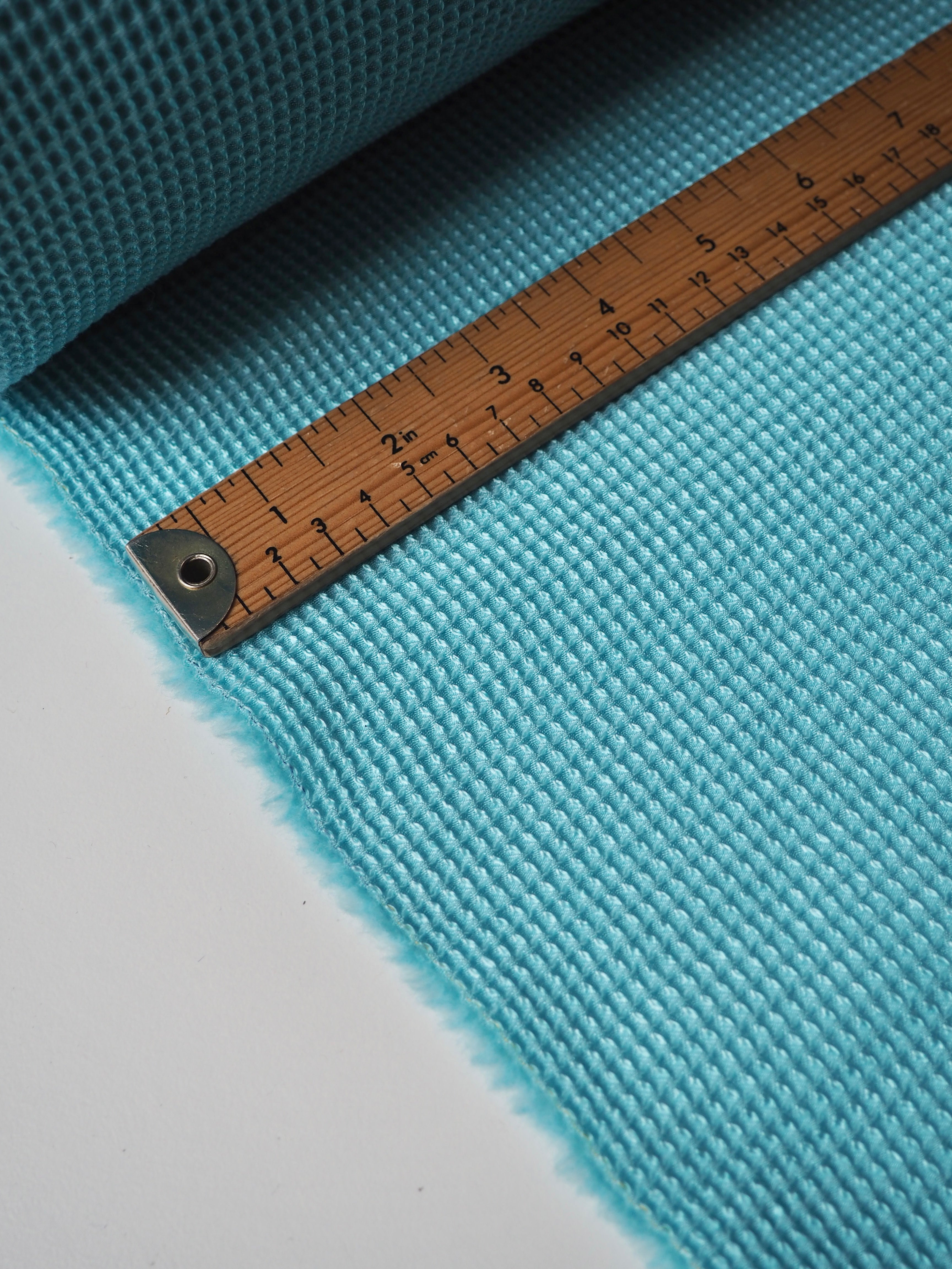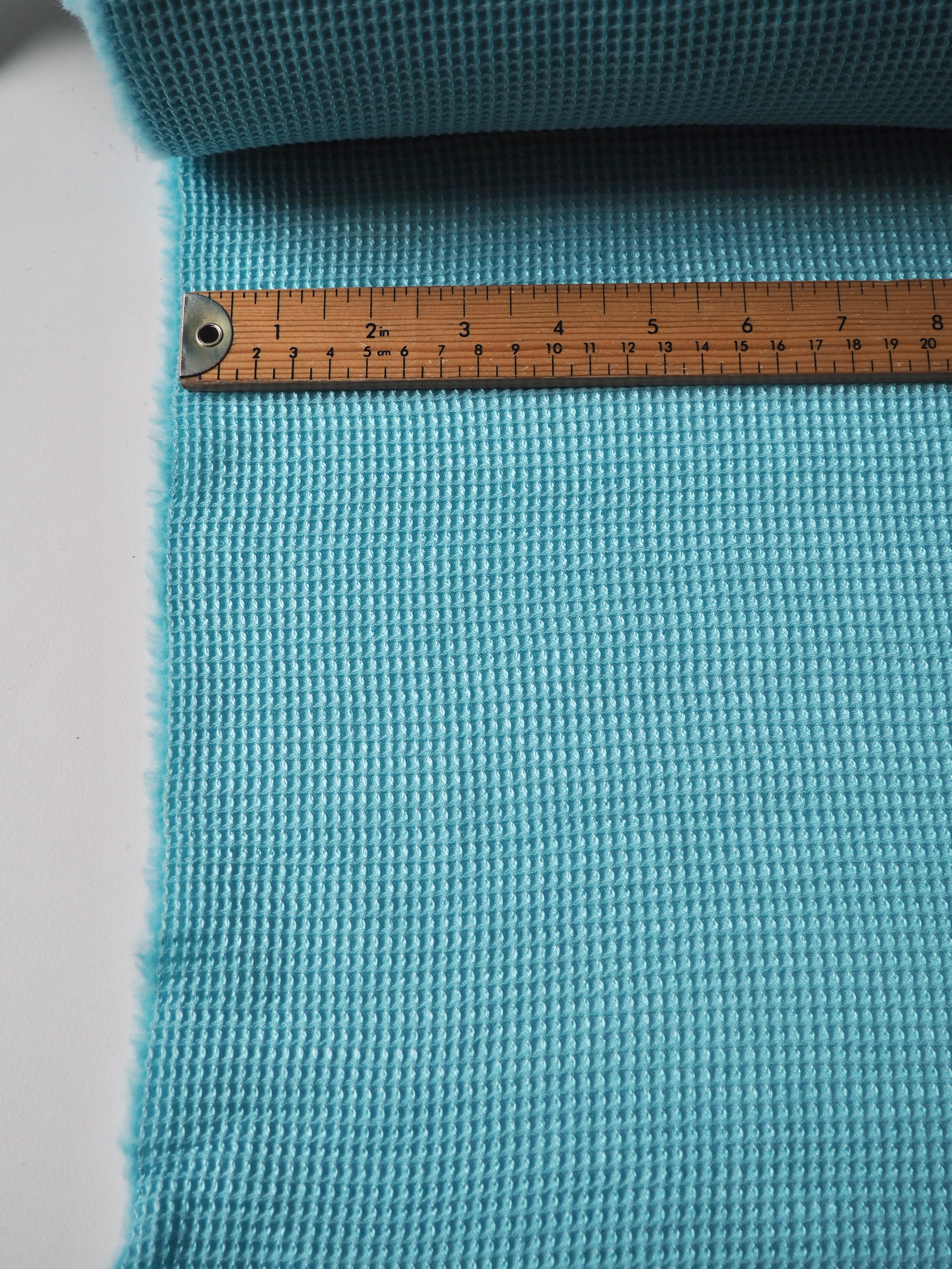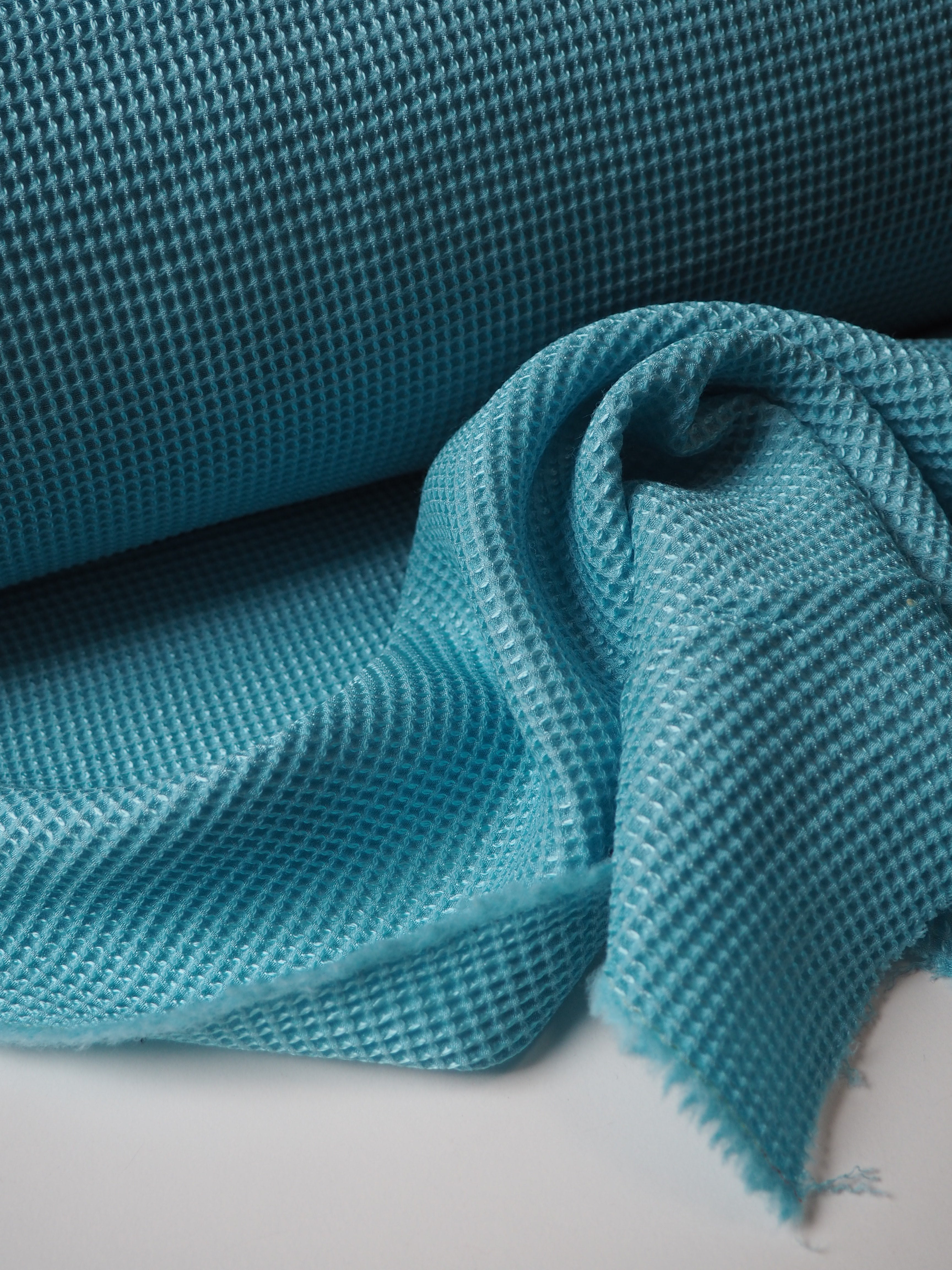 This ex-designer fabric is a jacquard. It's a unique gridded honeycomb-like weave that gives it an interesting depth. It's light to medium weight and sponge-y in texture. Opaque and has a soft structure to play with. The slight silk fibre blend gives it a lovely sheen finish, and the wool blend gives it warmth and cosiness. Would be lovely in a boxy top or dress!