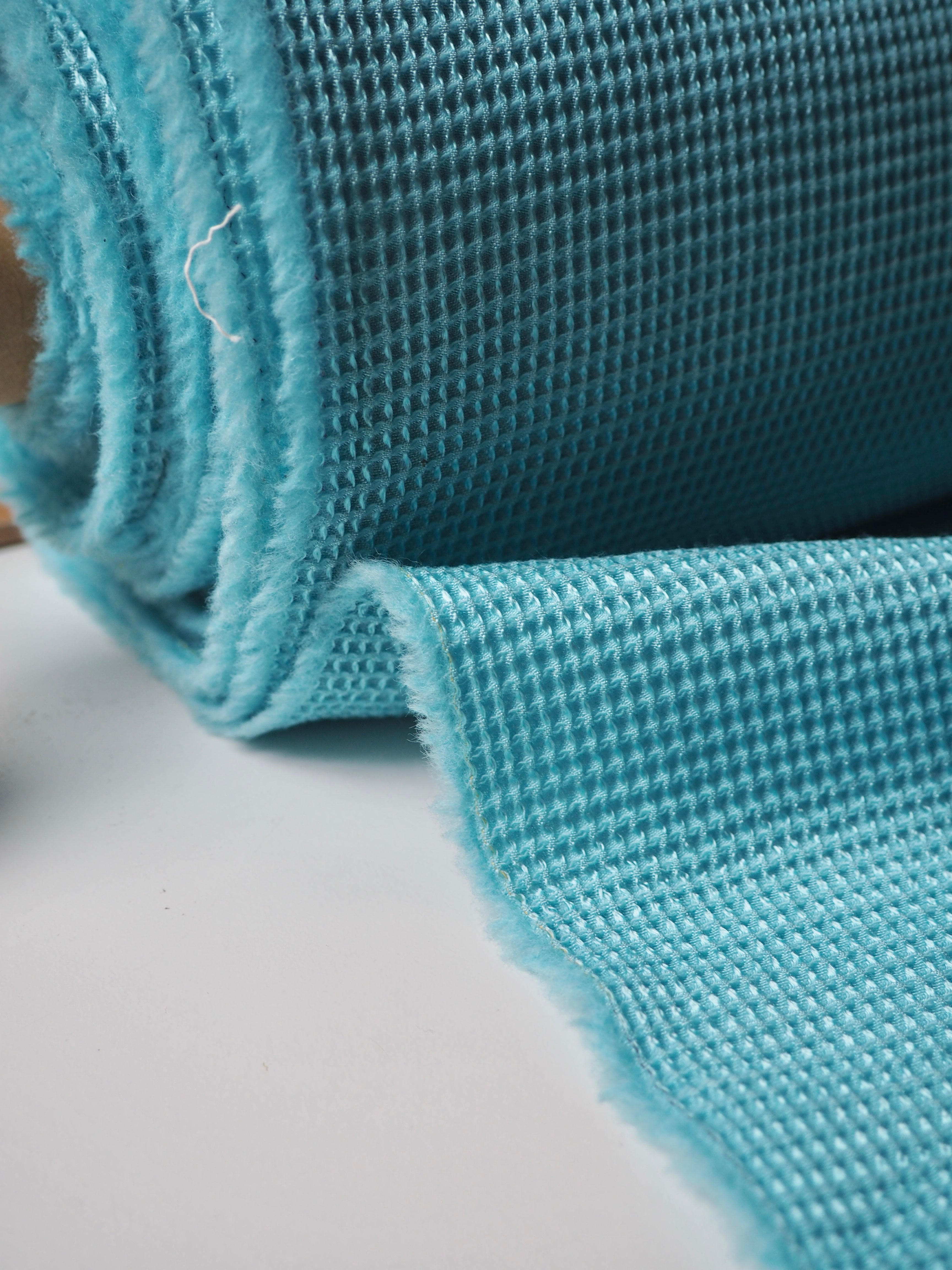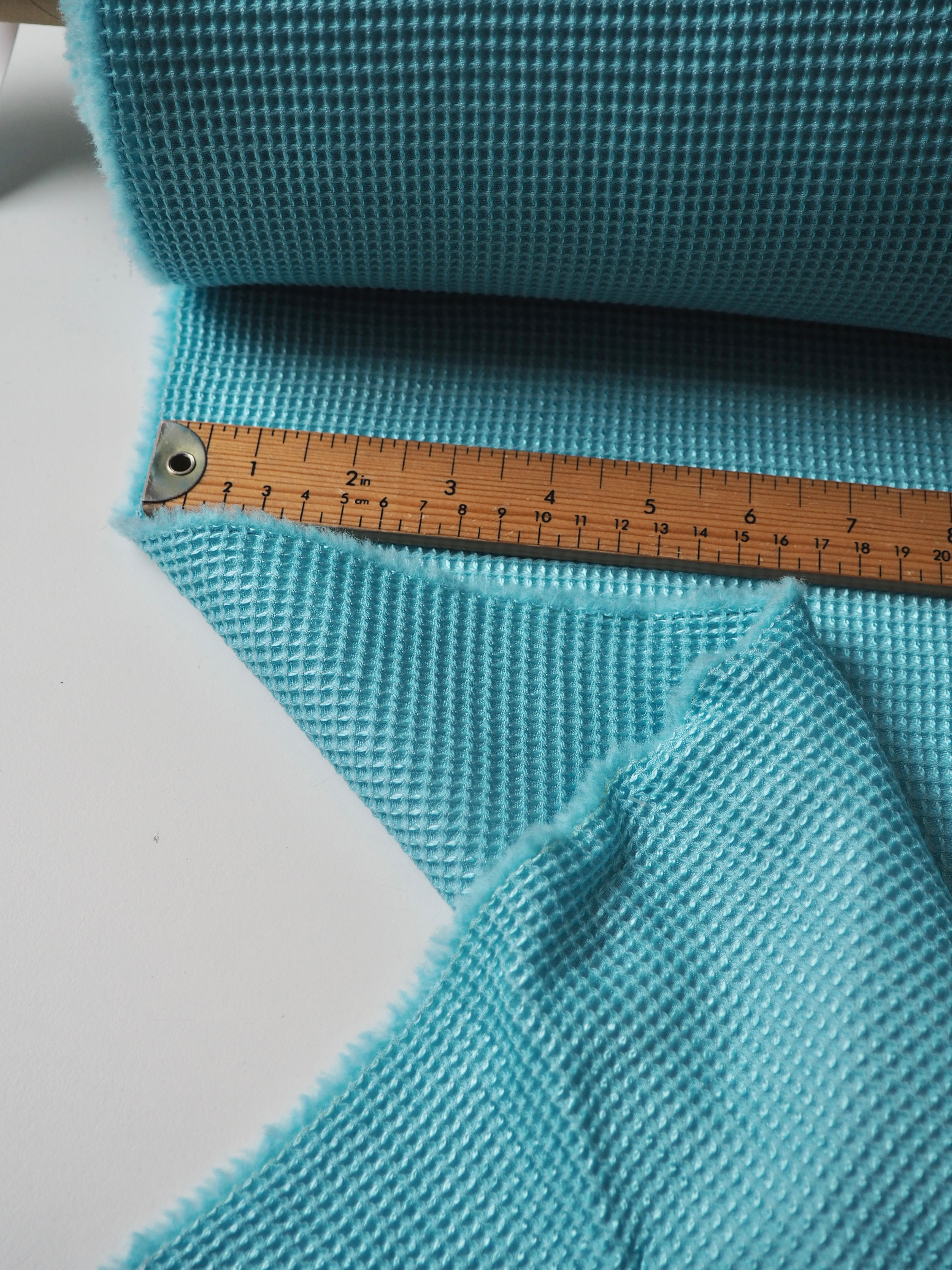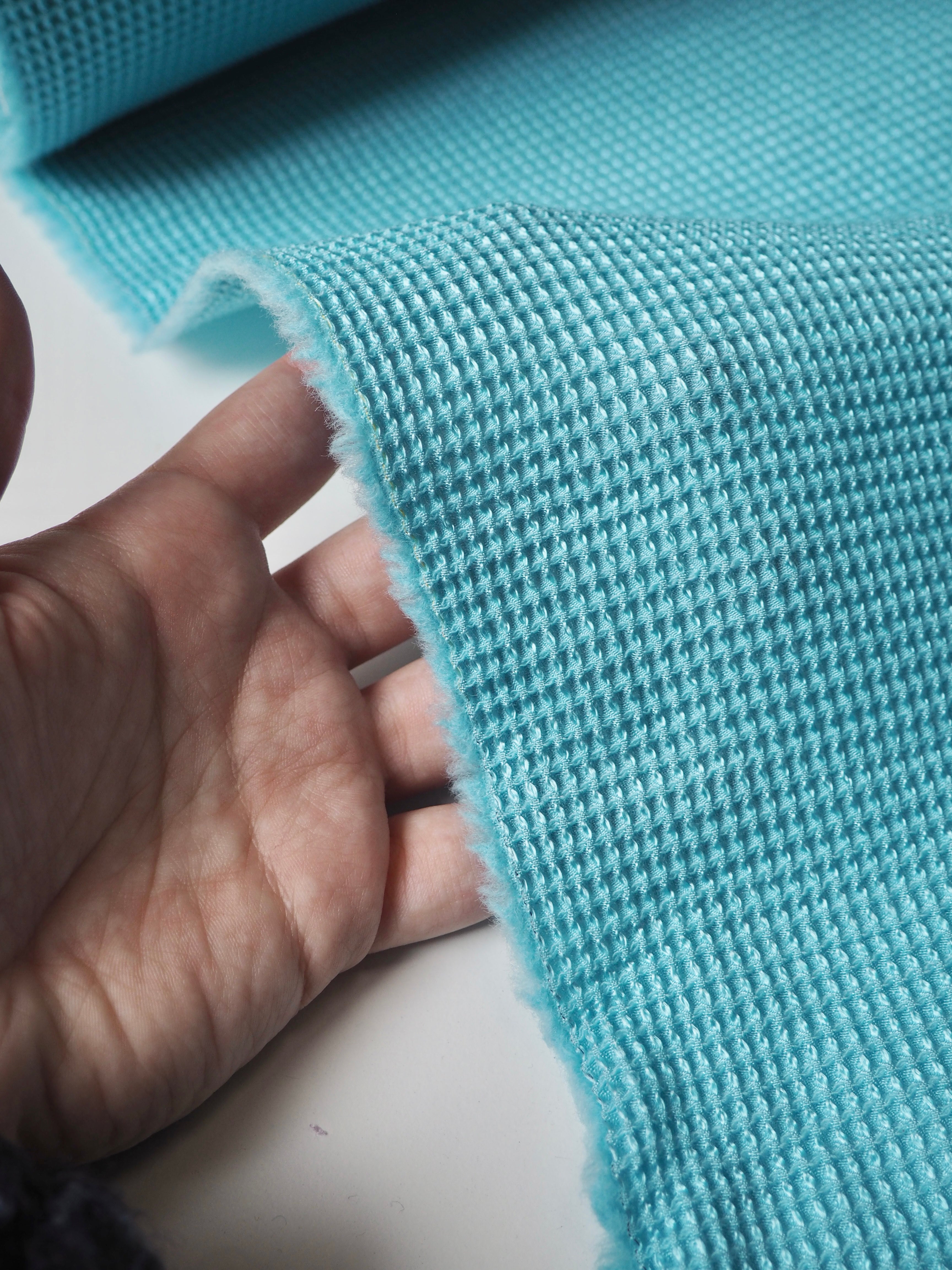 This ex-designer fabric is a jacquard. It's a unique gridded honeycomb-like weave that gives it an interesting depth. It's light to medium weight and sponge-y in texture. Opaque and has a soft structure to play with. The slight silk fibre blend gives it a lovely sheen finish, and the wool blend gives it warmth and cosiness. Would be lovely in a boxy top or dress!