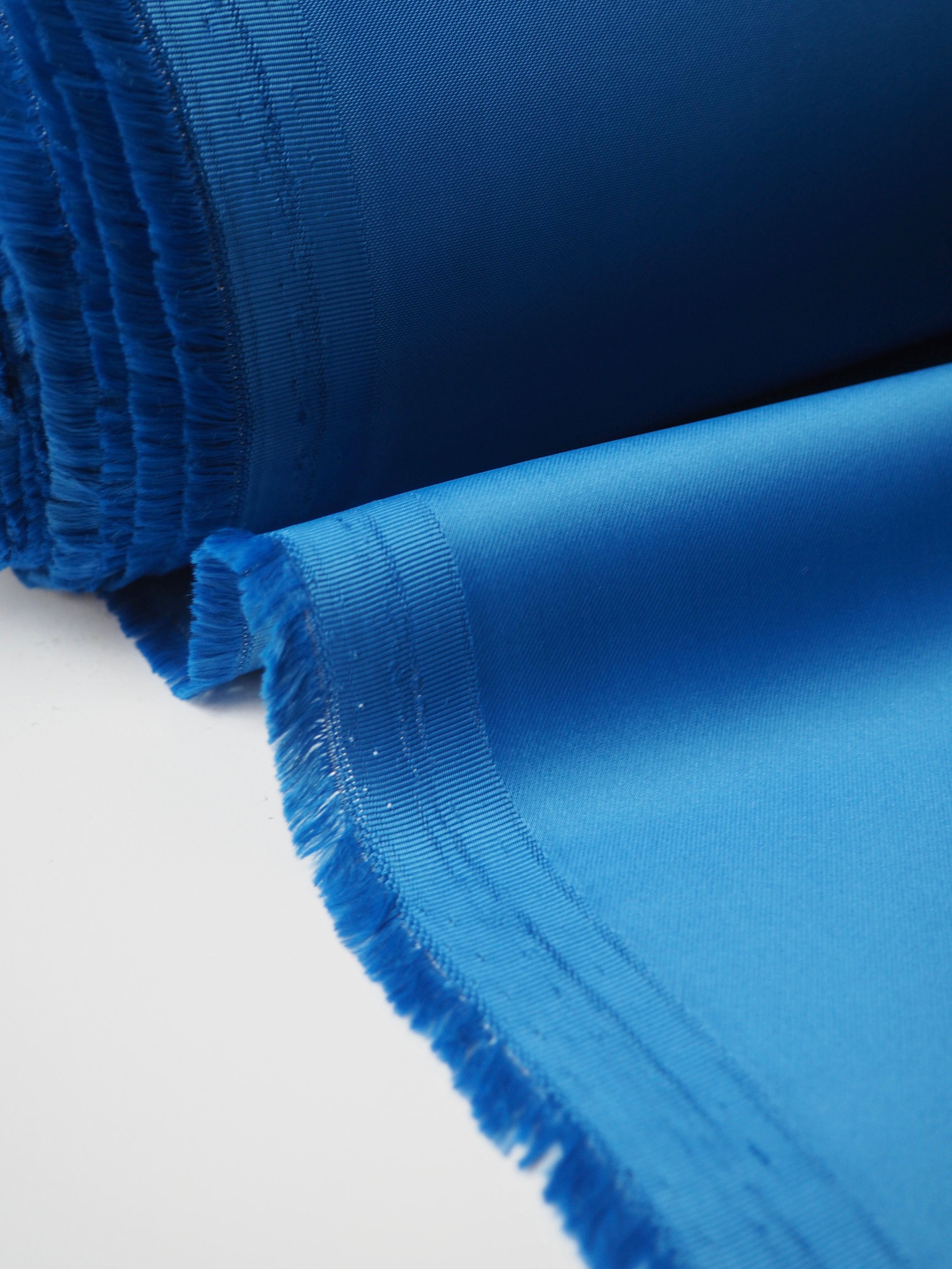 This ex-designer fabric is a heavy satin. It's in a rich azure blue shade, with a heavy, denser weight. It has a smooth satin topside, and a slightly more textured, almost twill-like reverse. Has a heavy drape and good movement, and a lovely satin sheen on the topside. It's a more technical weight that suits tailored projects or home projects!