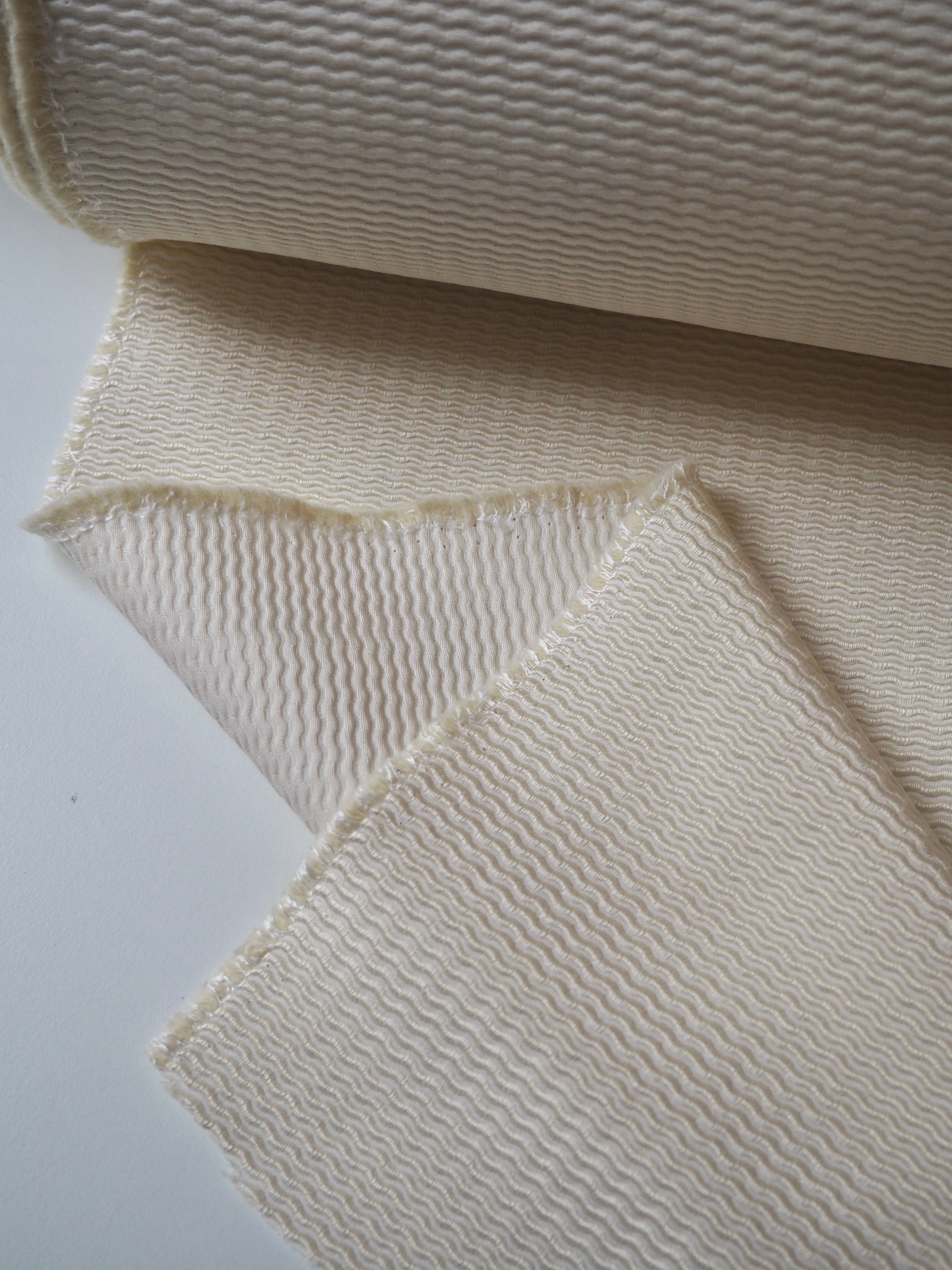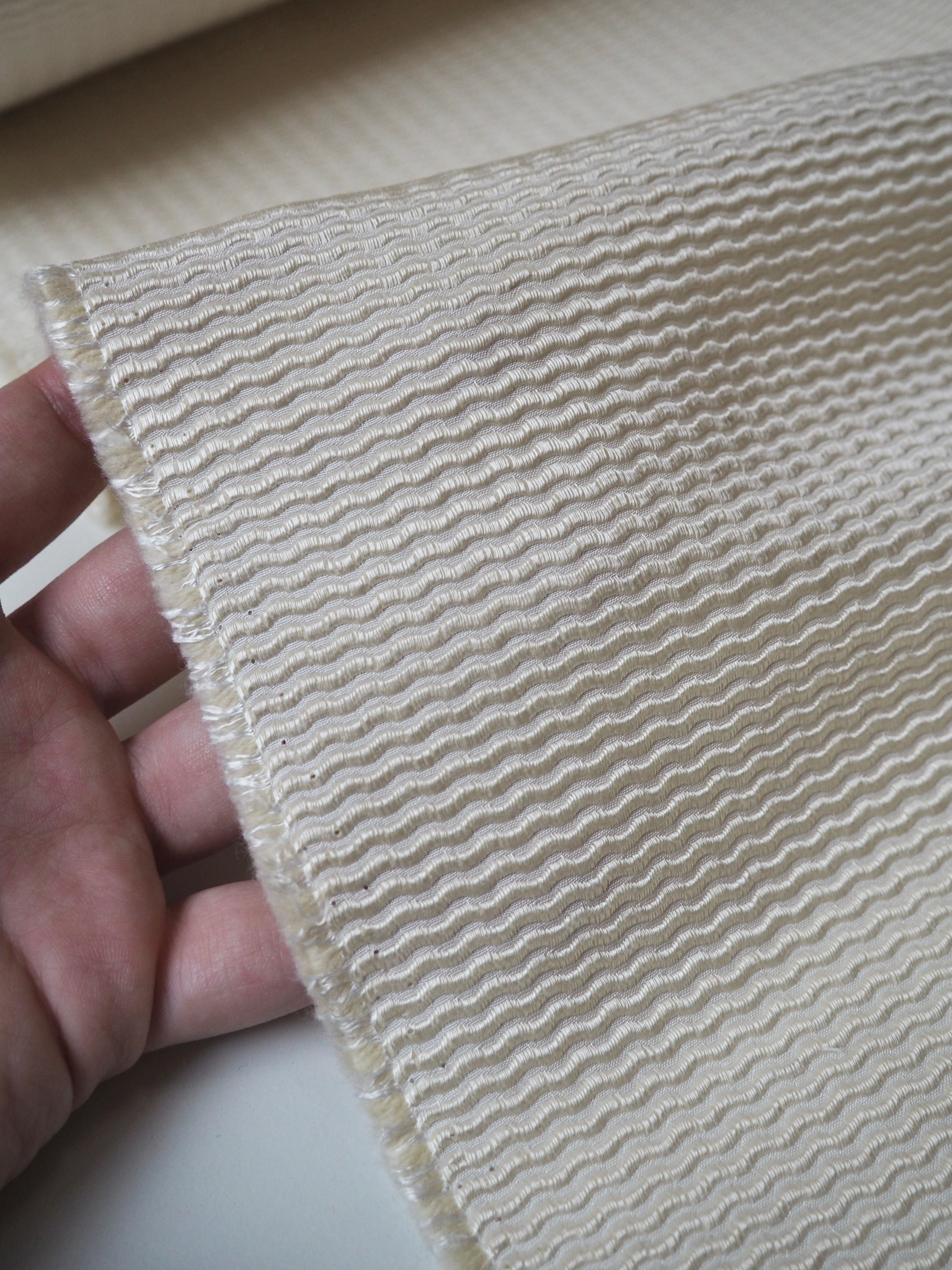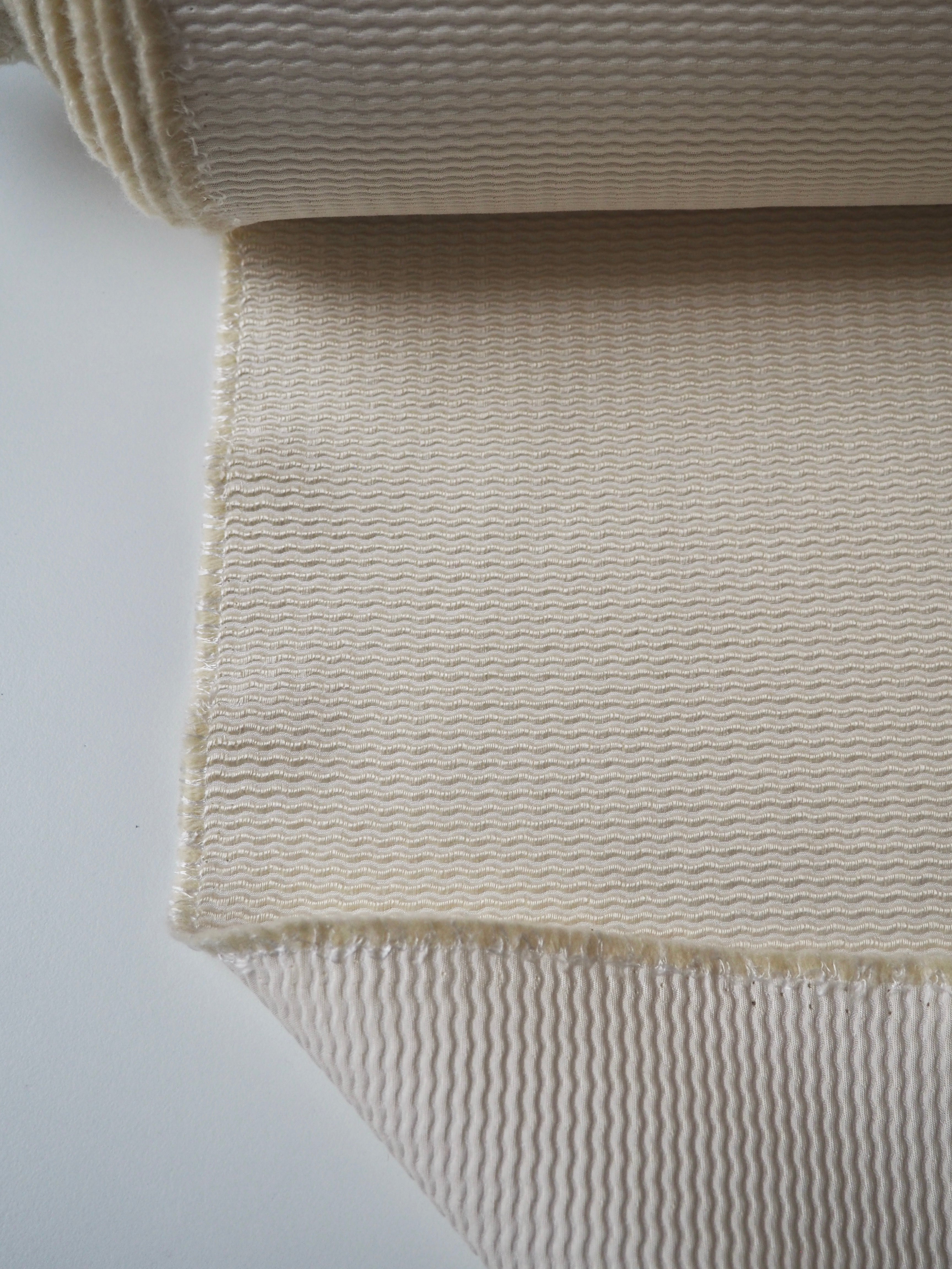 This ex-designer fabric is a jacquard. It's a unique small wave weave that give it an interesting depth. It's medium weight with a sturdy handle and great texture. Opaque and has a great structure to play with. The wool and viscose fibre blend gives it a lovely sheen finish. Would be great on a structured jacket and furnishings! This cloth has a subtle imprinted wave when reflected in the light across the whole roll. We don't believe it affects the integrity of the cloth, but it is visible.