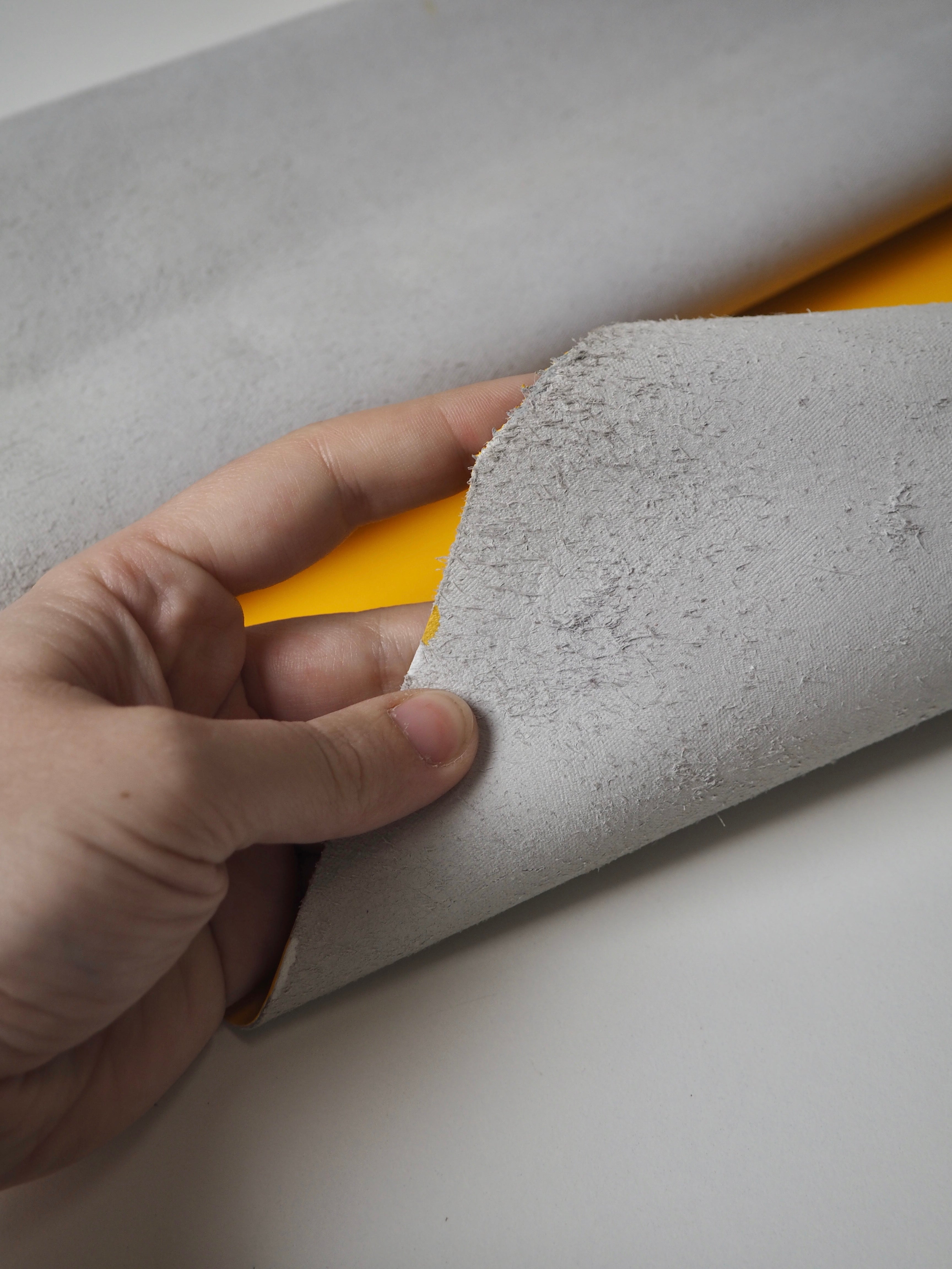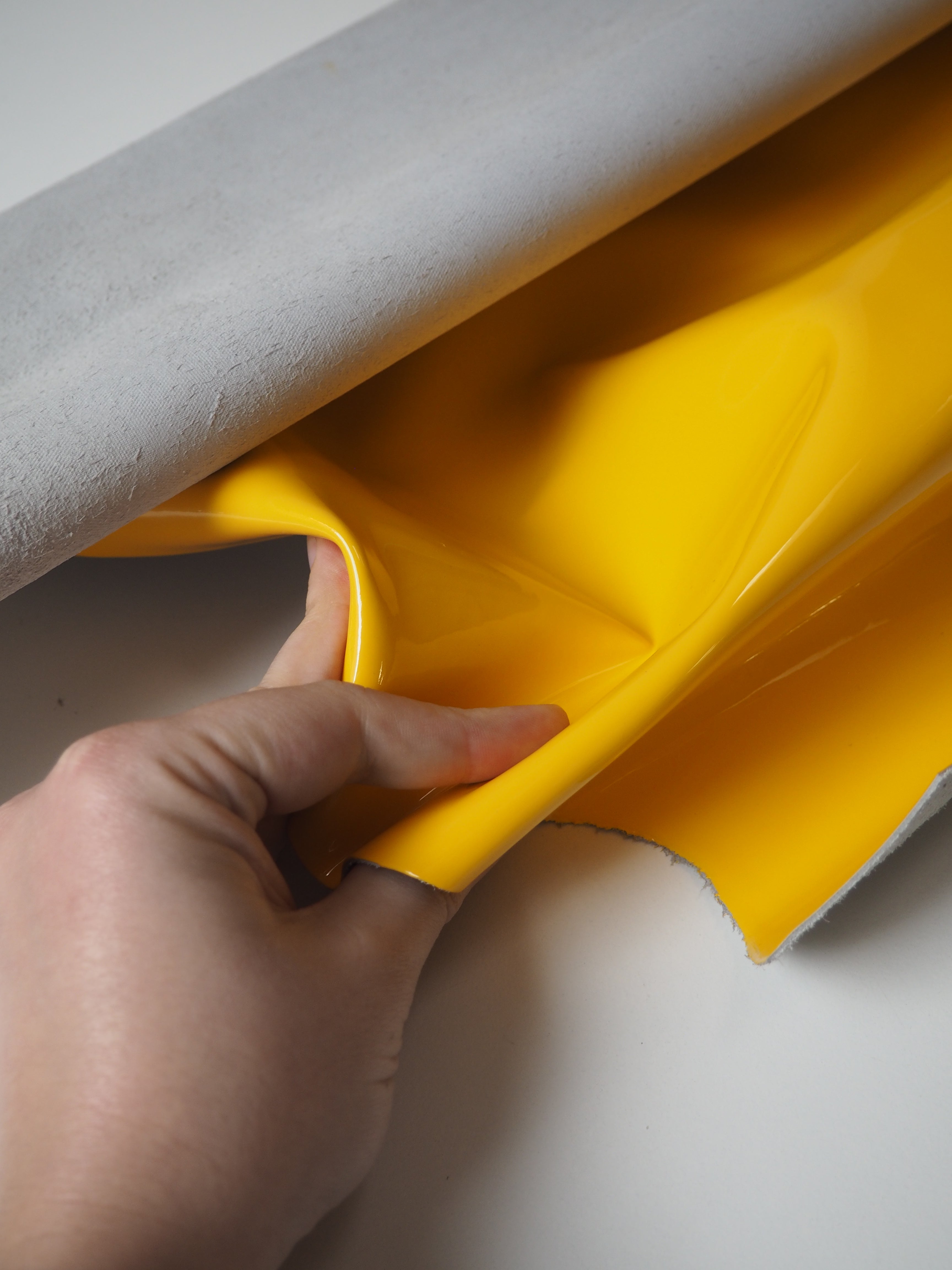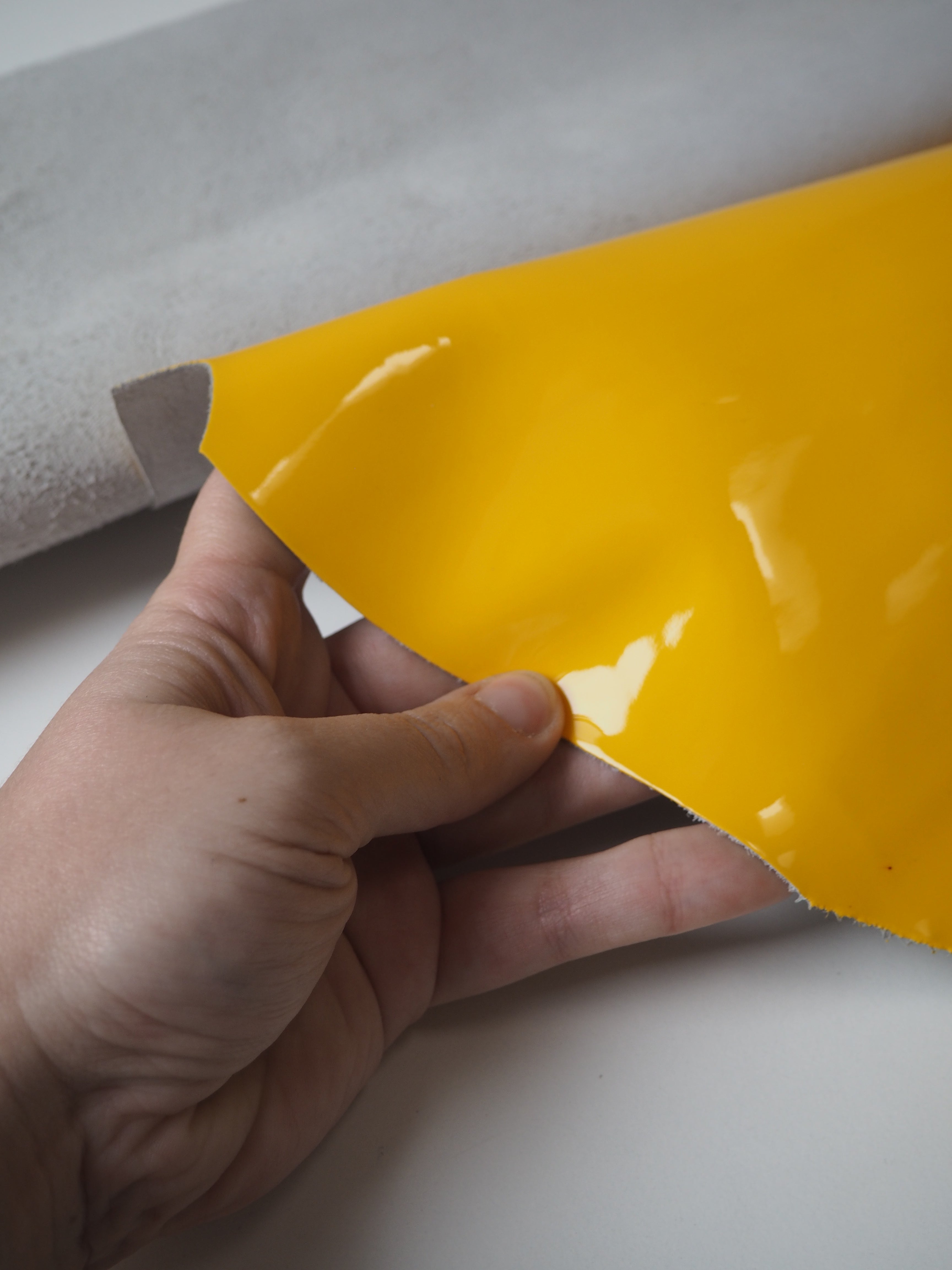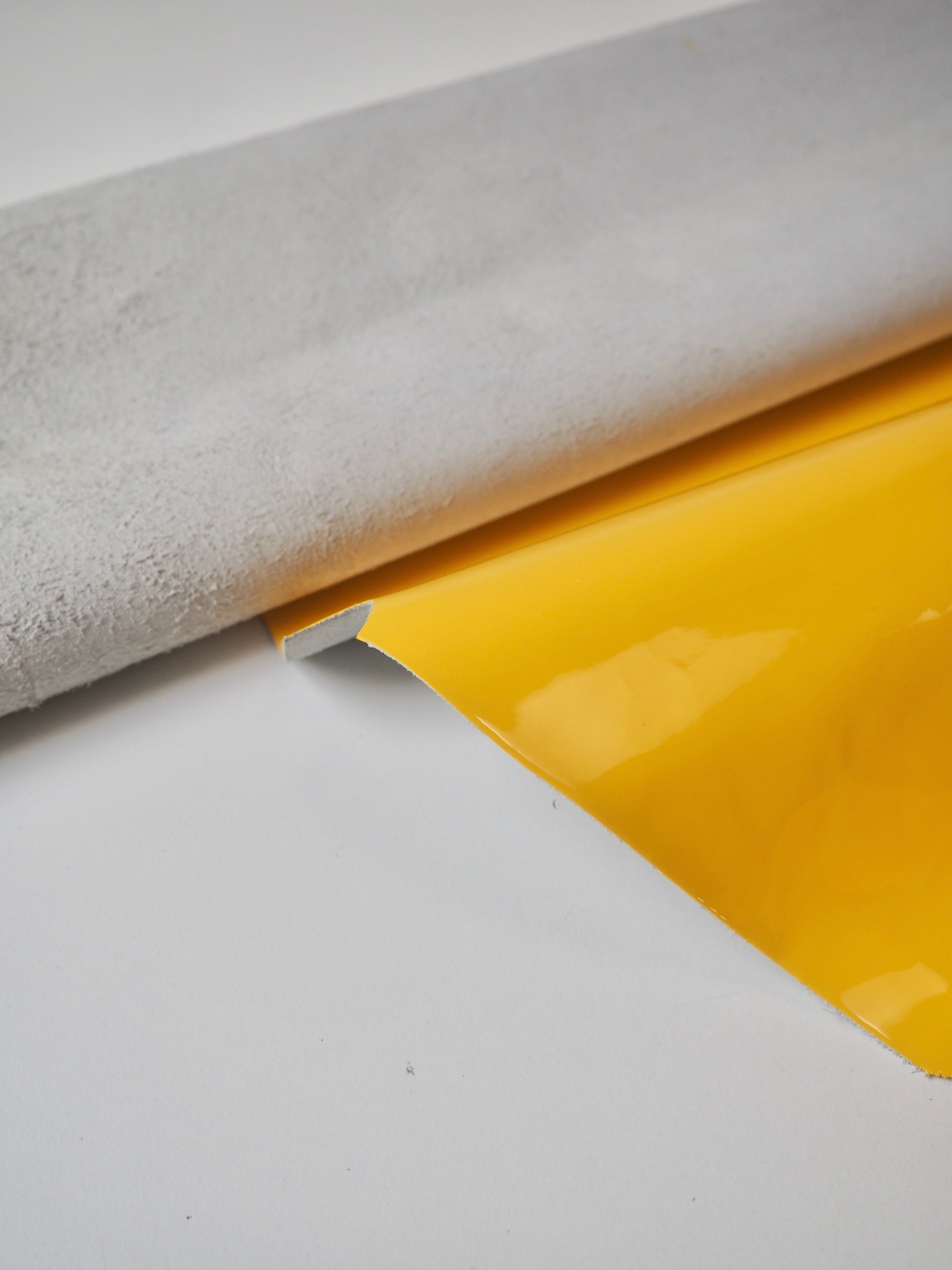 This ex-designer leather is a calfskin. It's a yellow leather with an extra shiny patent finish. Has a good structure, and is light to medium weight. We would love to see this made up into a bag or purse!