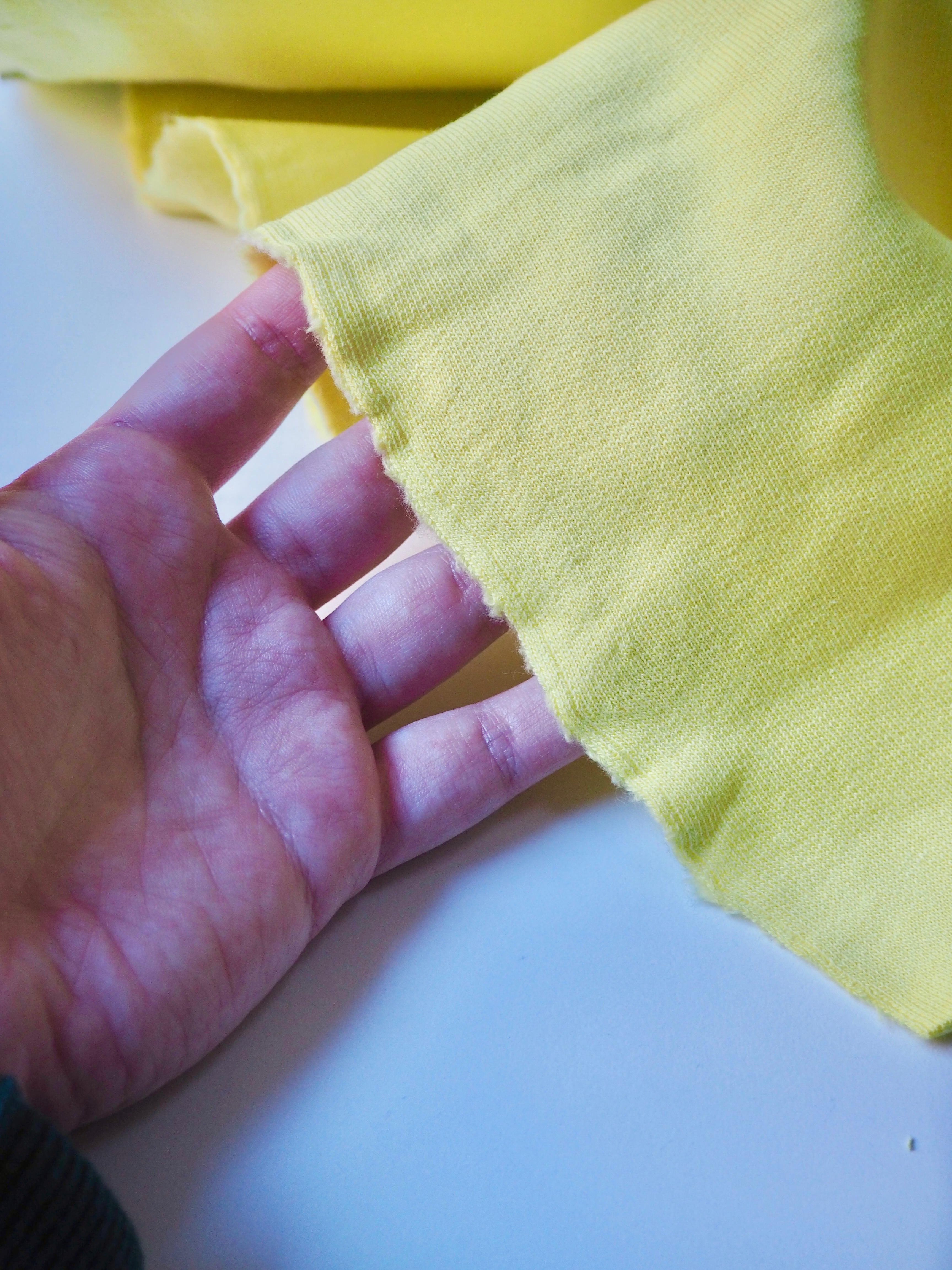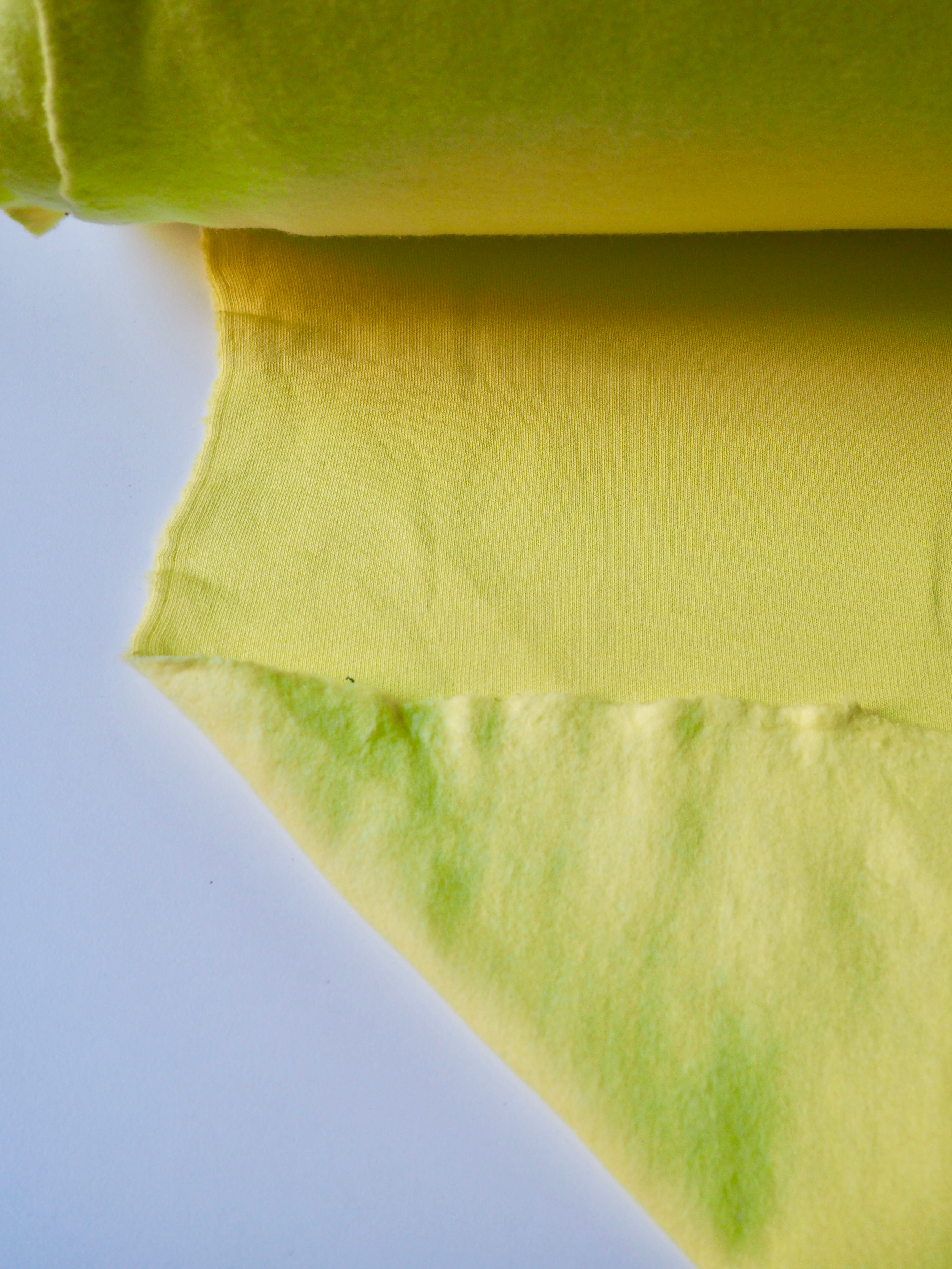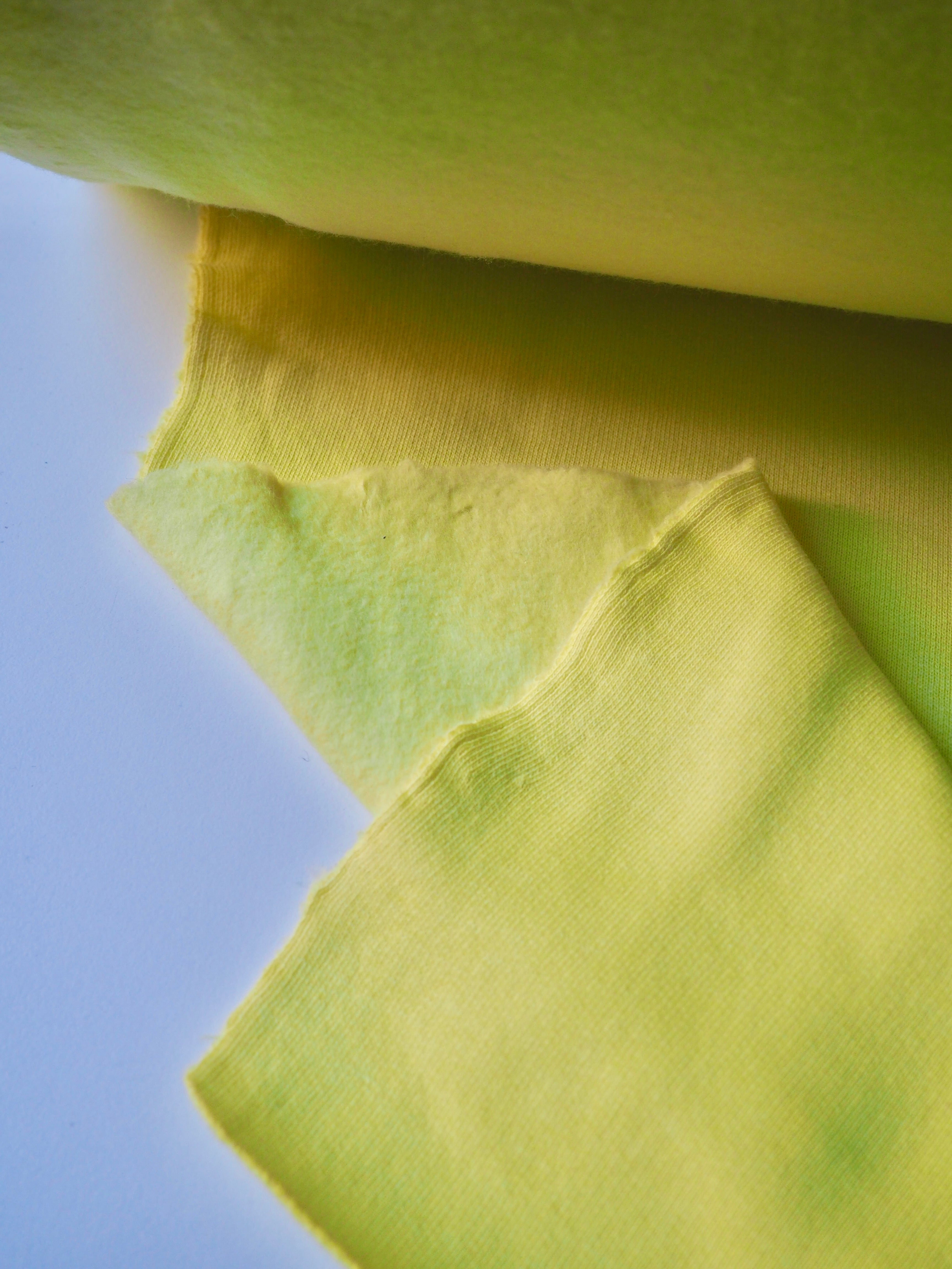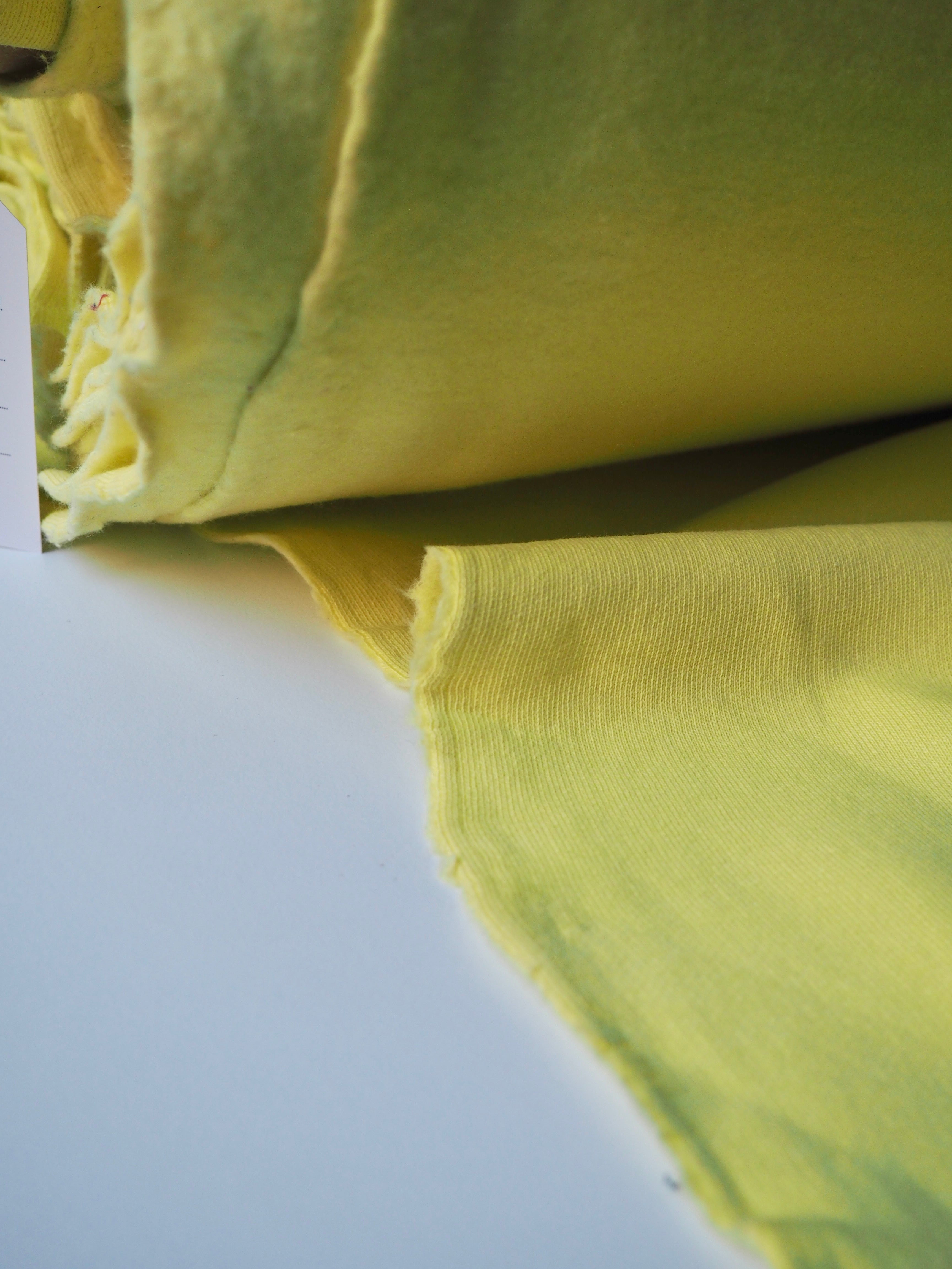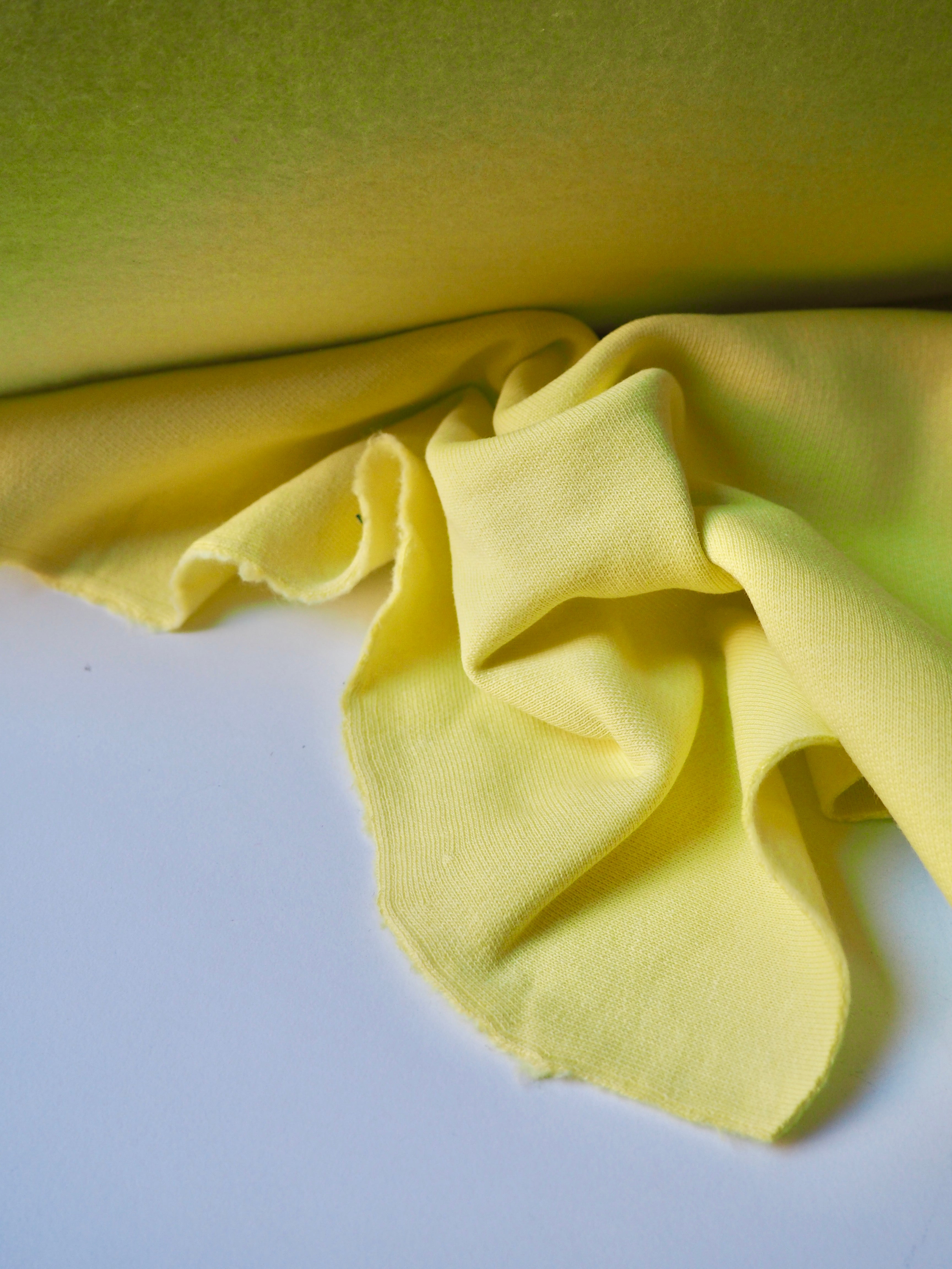 This ex-designer fabric is a super soft jersey. It has a plain jersey right side and super soft, fleece reverse. Medium weight with a gentle 10% stretch. It's quite dense and is opaque. Has a slight structure. Perfectly cosy for sweatshirts and joggers! From British designer Stalf Studio.