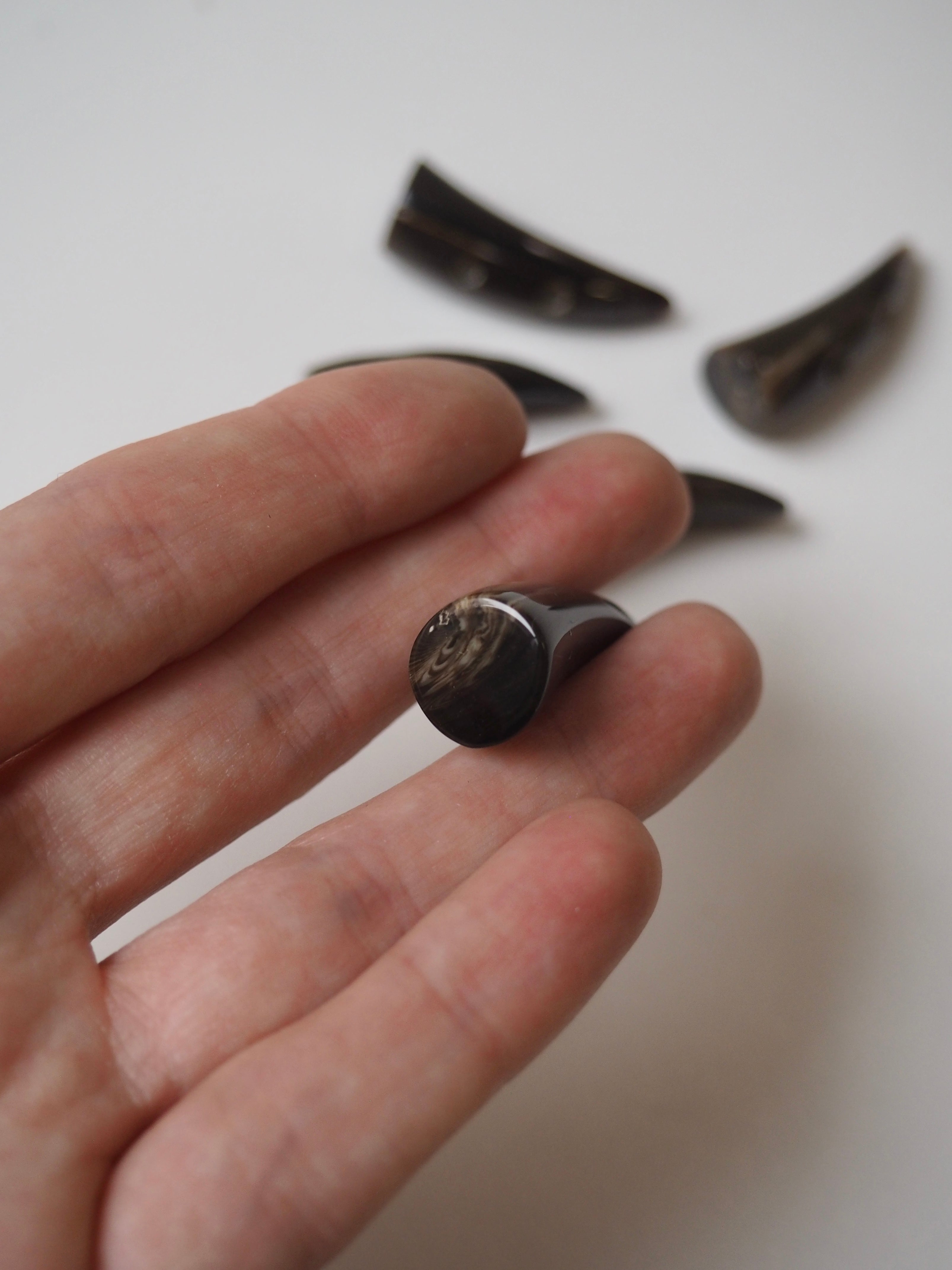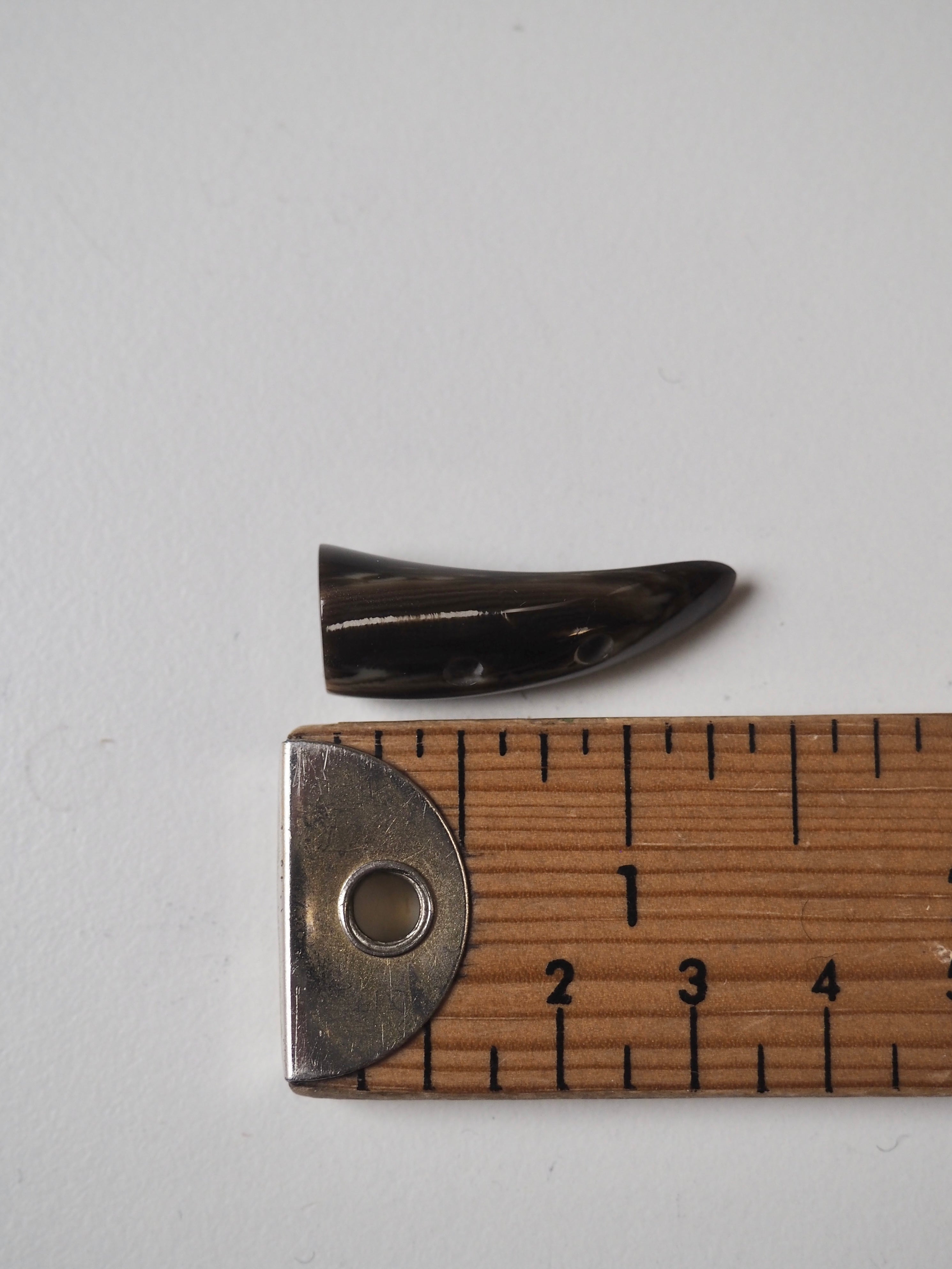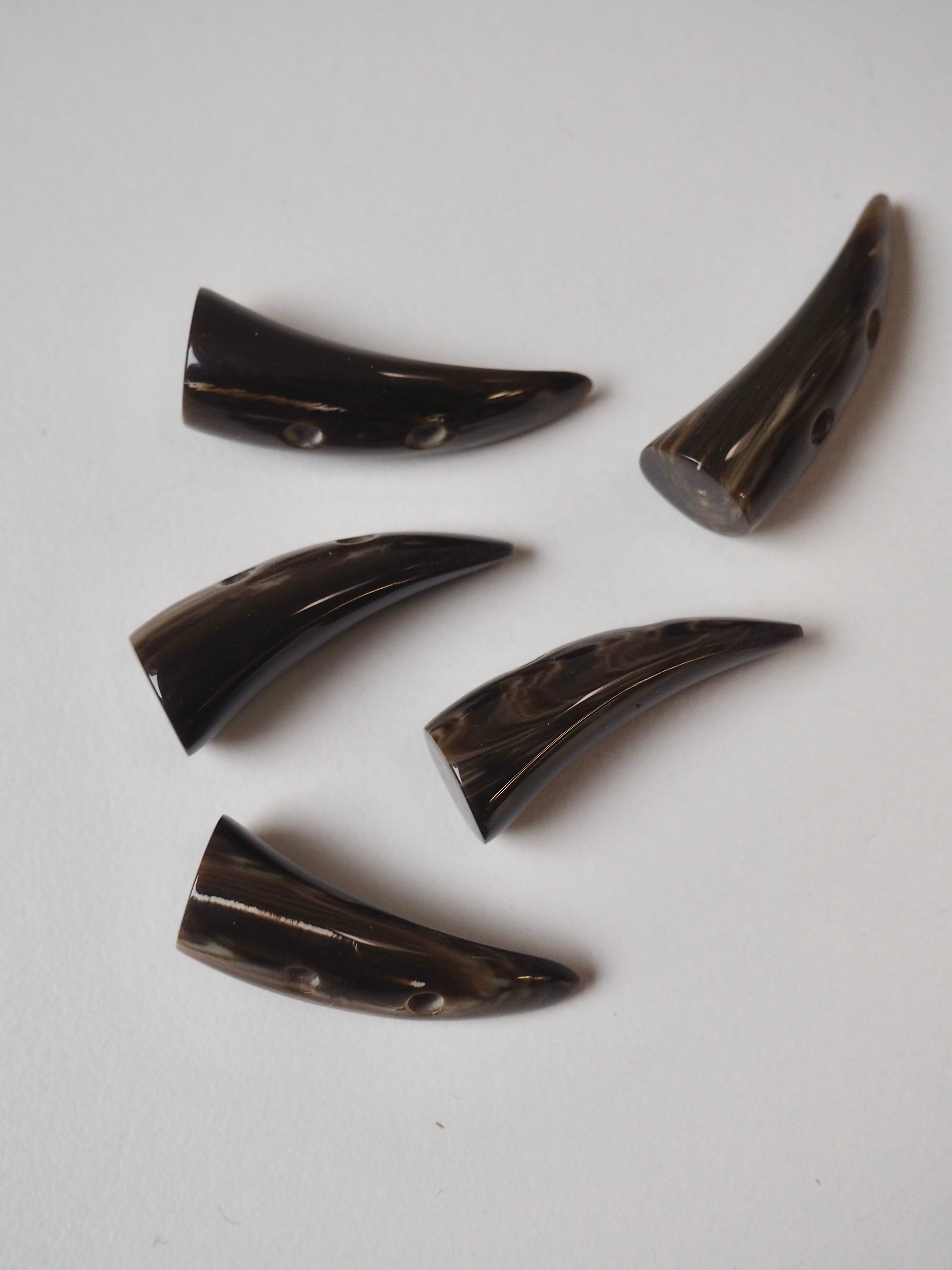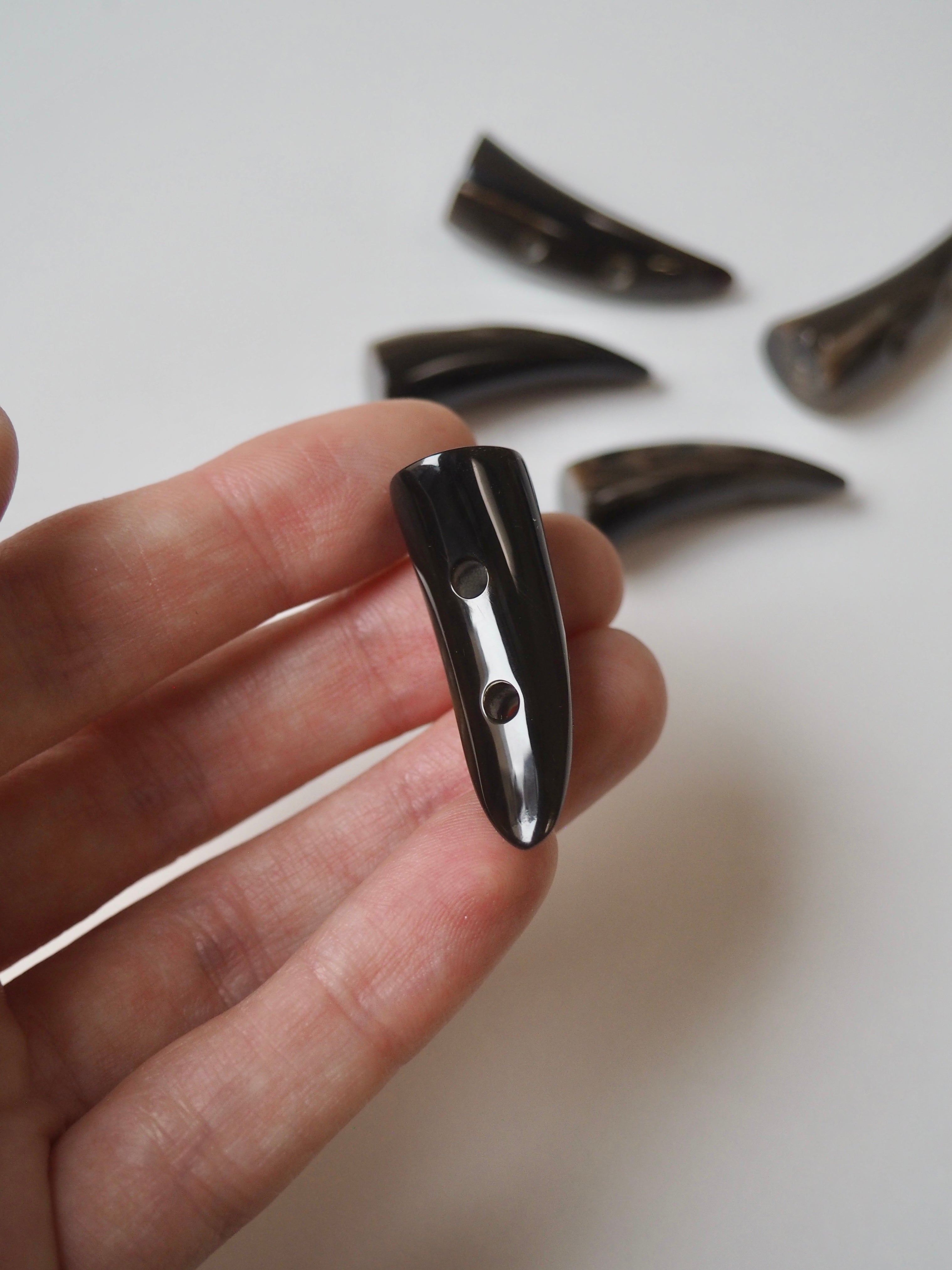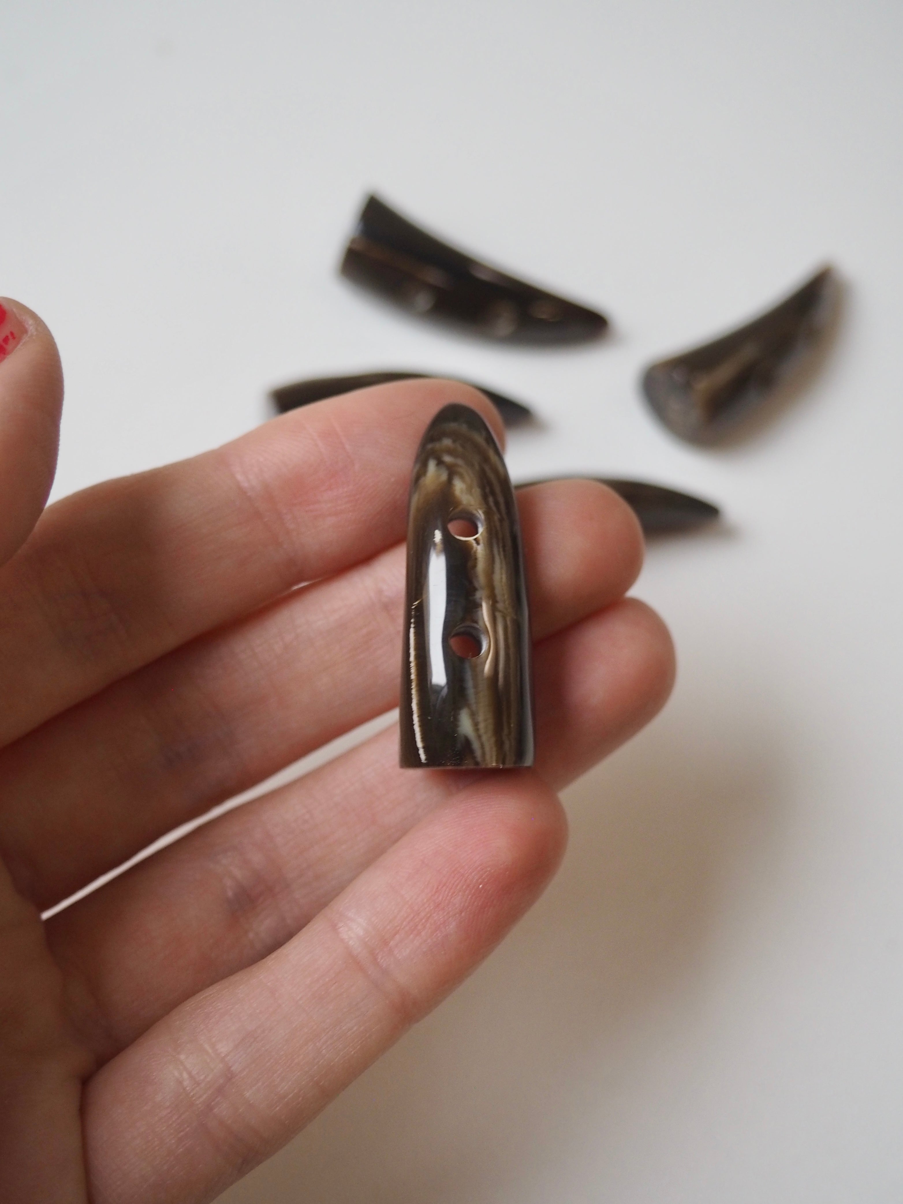 This ex-designer fastening is a horn duffle toggle. It's dark brown marled with cream with a shiny finish. Very smooth and chic. Great for adding a unique finish around a cord. Really high quality, would look amazing on a coat!