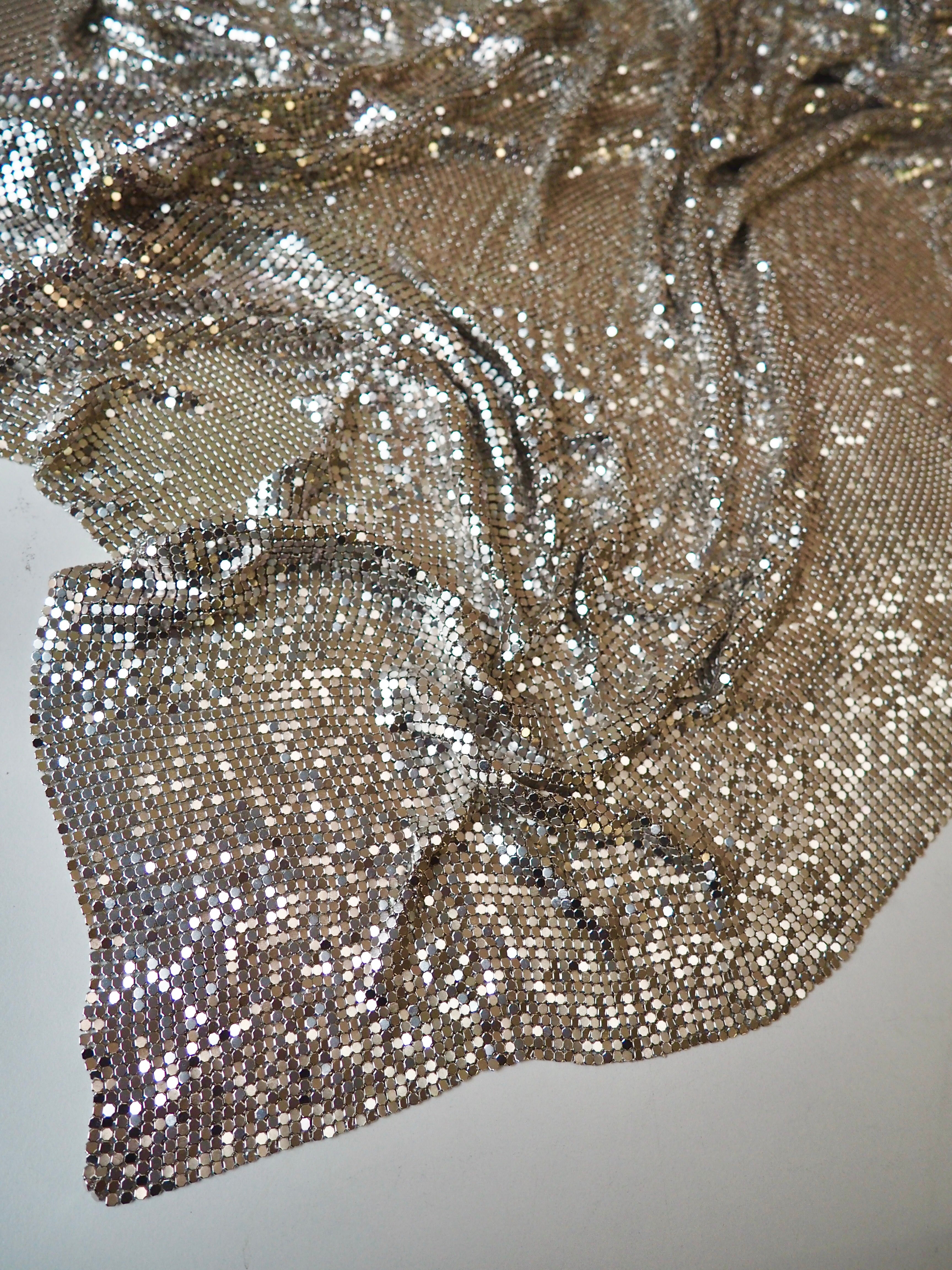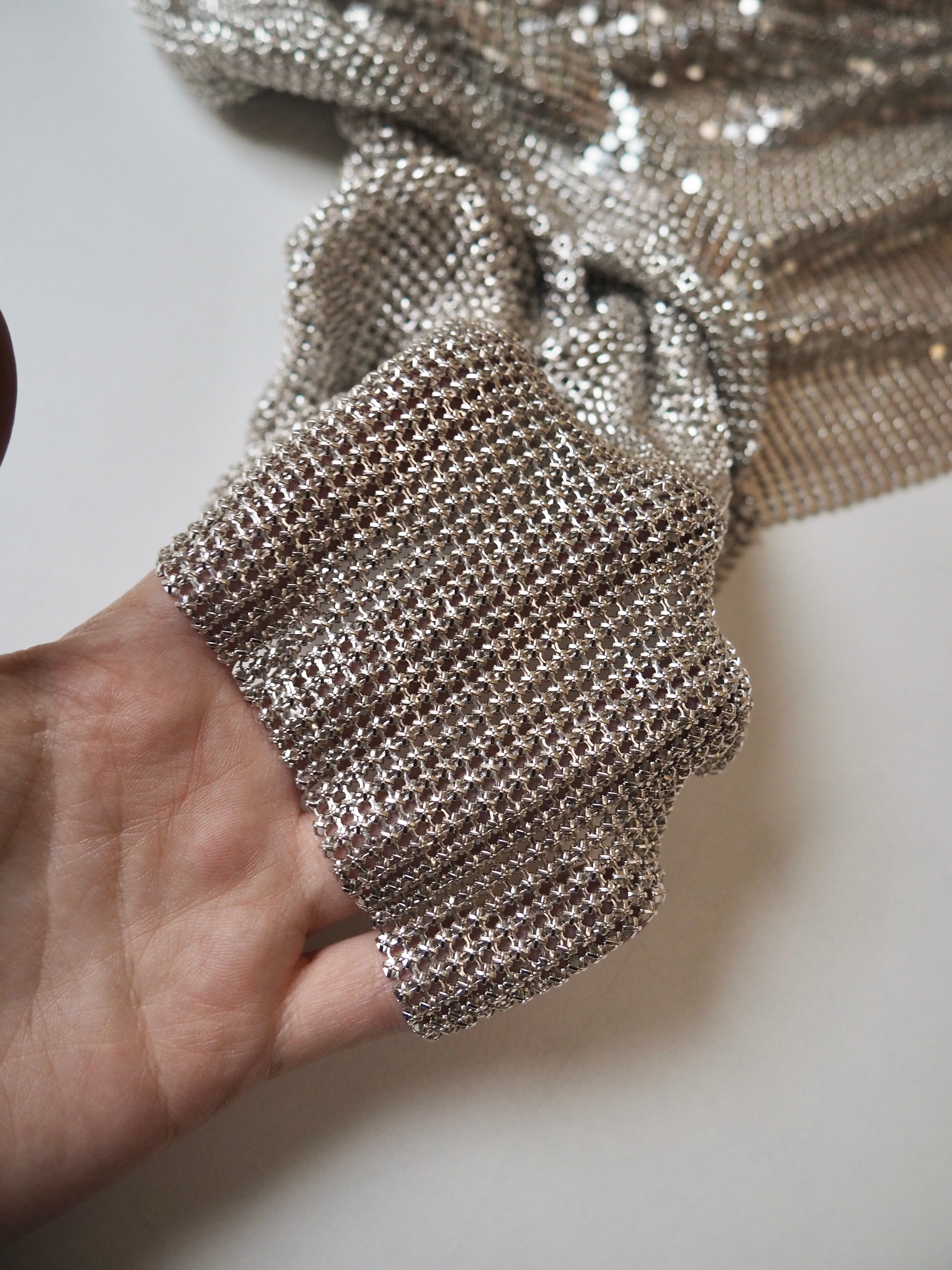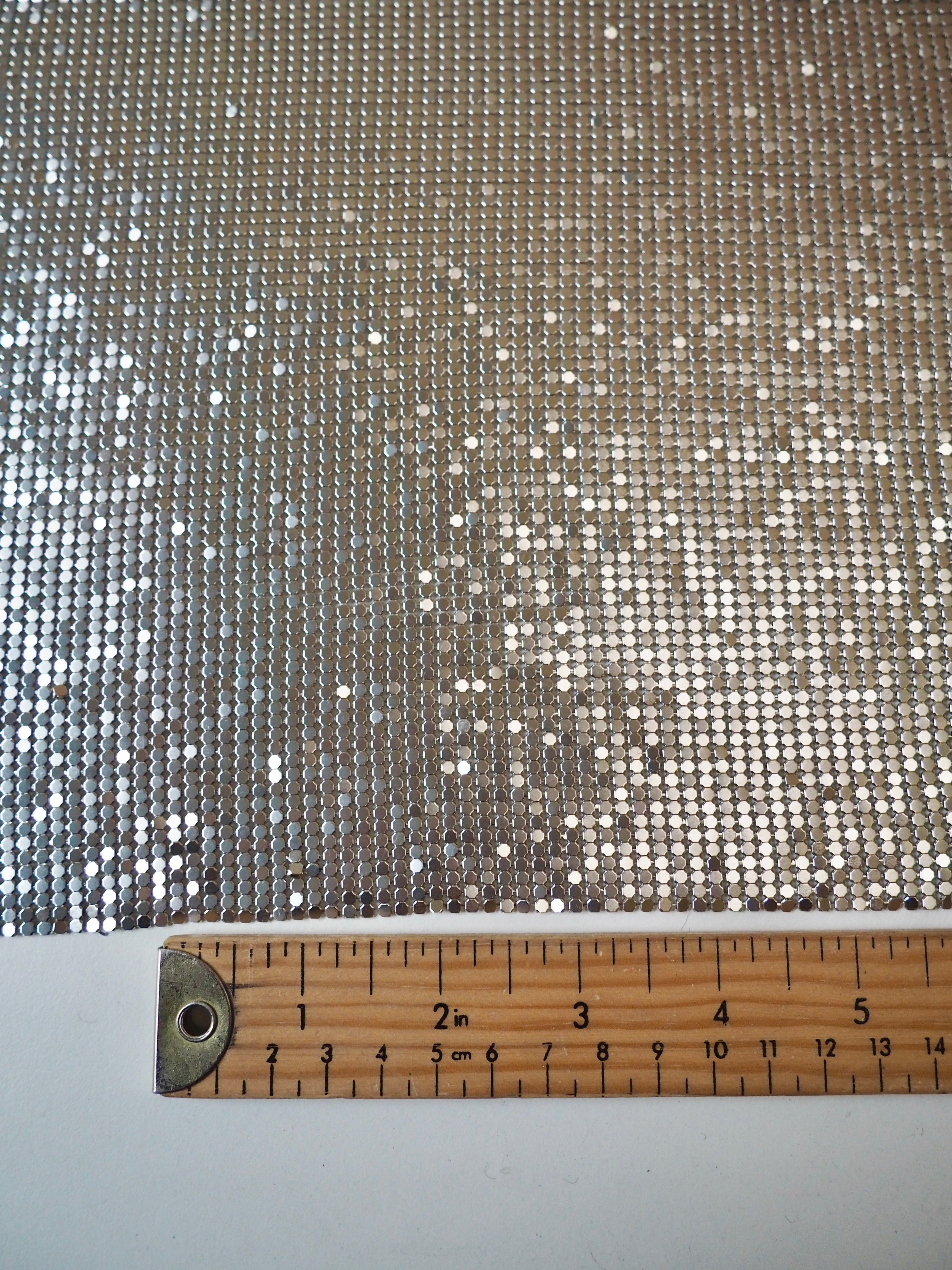 This ex-designer trim is a gorgeous silver chainmail with an opalescent effect that is caught in the light. Bright silver shiny beadlike chains are meshed together with a matching backing. Very drapey and medium weight, with great movement. Can be linked with separating the chains and reattaching with pliers, or with hand sewing. We are seeing very 90s chainmail halter tops, mini skirts, and small evening bags!