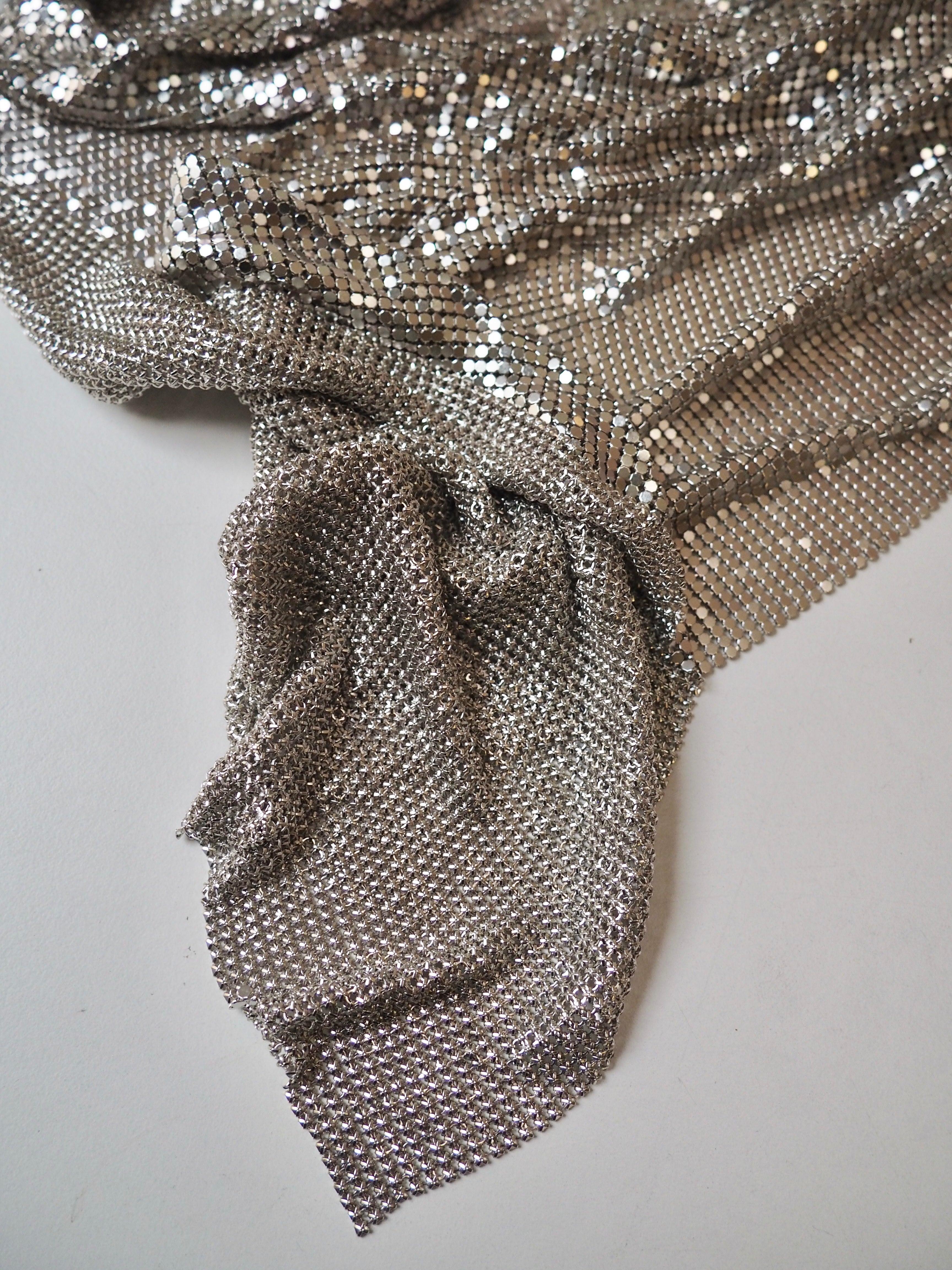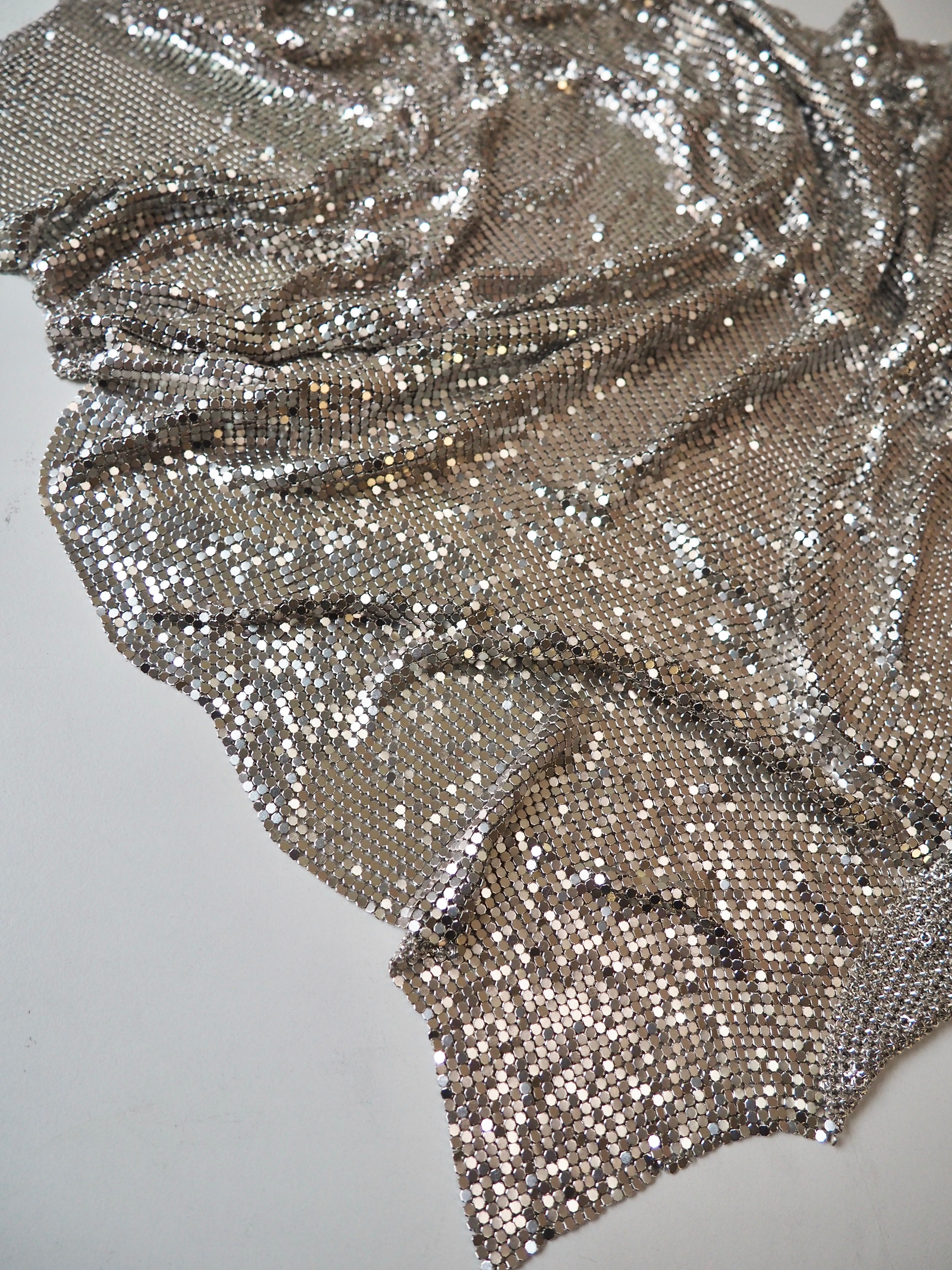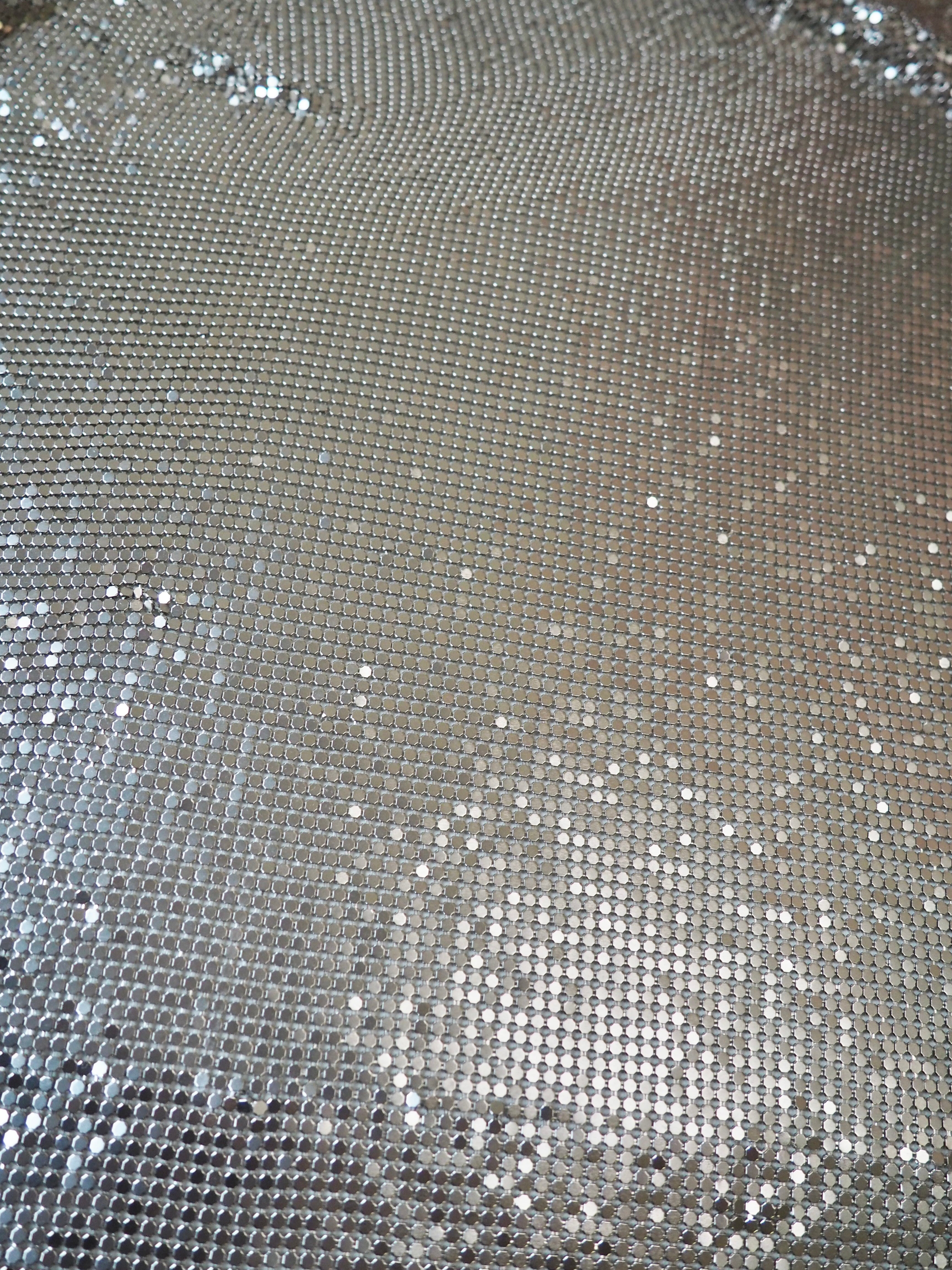 This ex-designer trim is a gorgeous silver chainmail with an opalescent effect that is caught in the light. Bright silver shiny beadlike chains are meshed together with a matching backing. Very drapey and medium weight, with great movement. Can be linked with separating the chains and reattaching with pliers, or with hand sewing. We are seeing very 90s chainmail halter tops, mini skirts, and small evening bags!