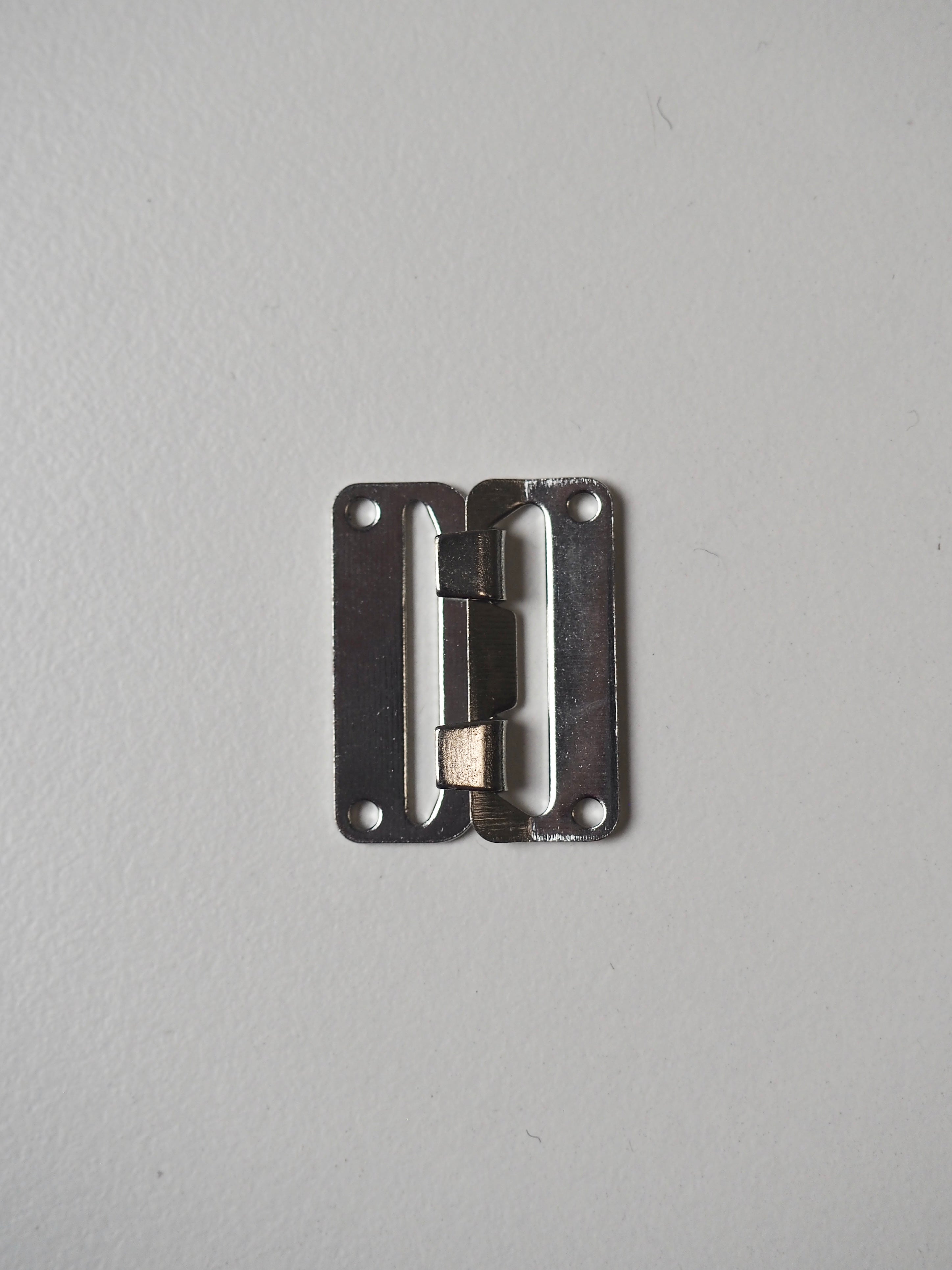 This ex-designer hardware is a hook and bar. It has a shiny silver finish with two hooks. Perfect for a closure on a pair of trousers, a jacket, or a coat.