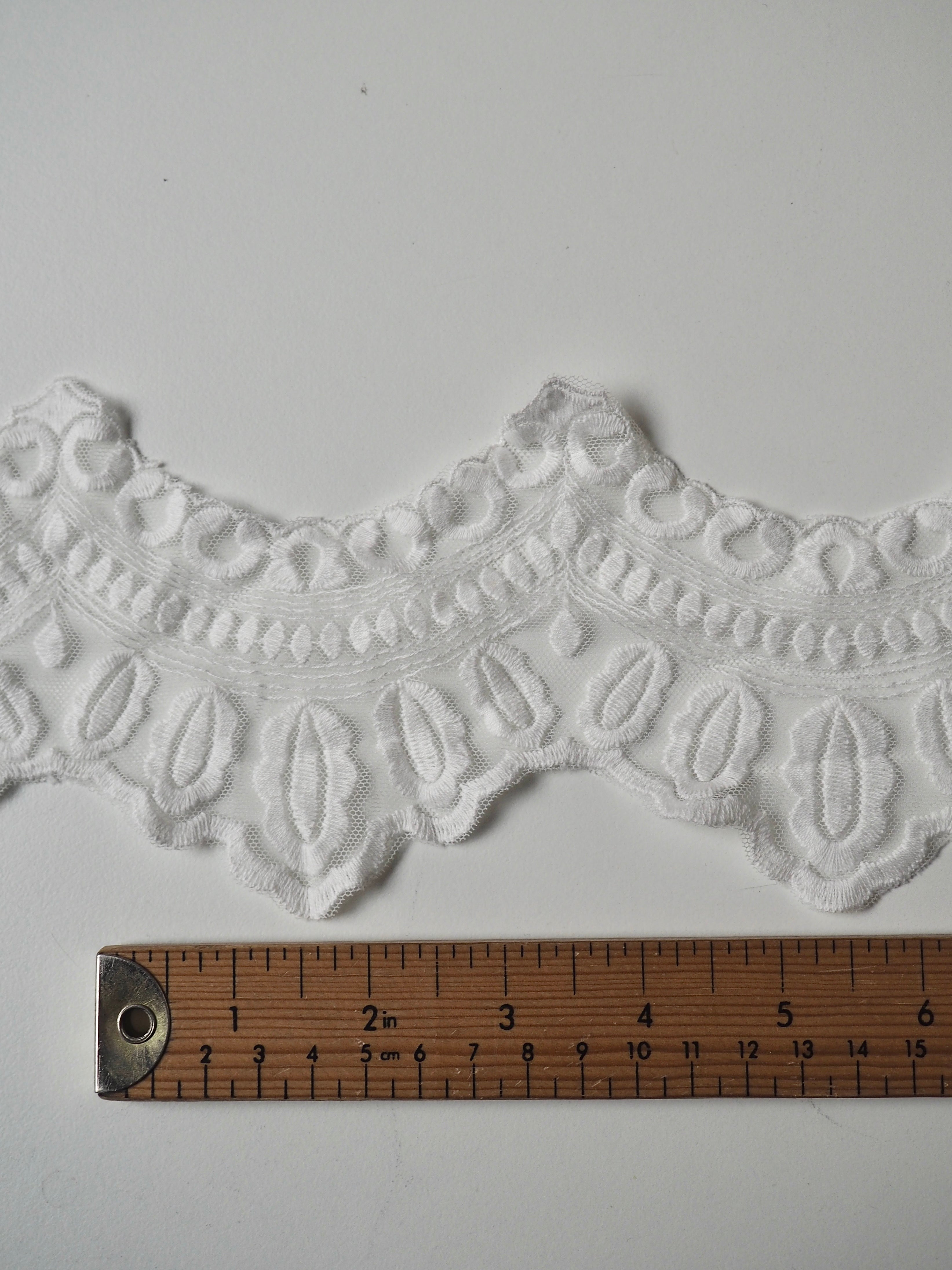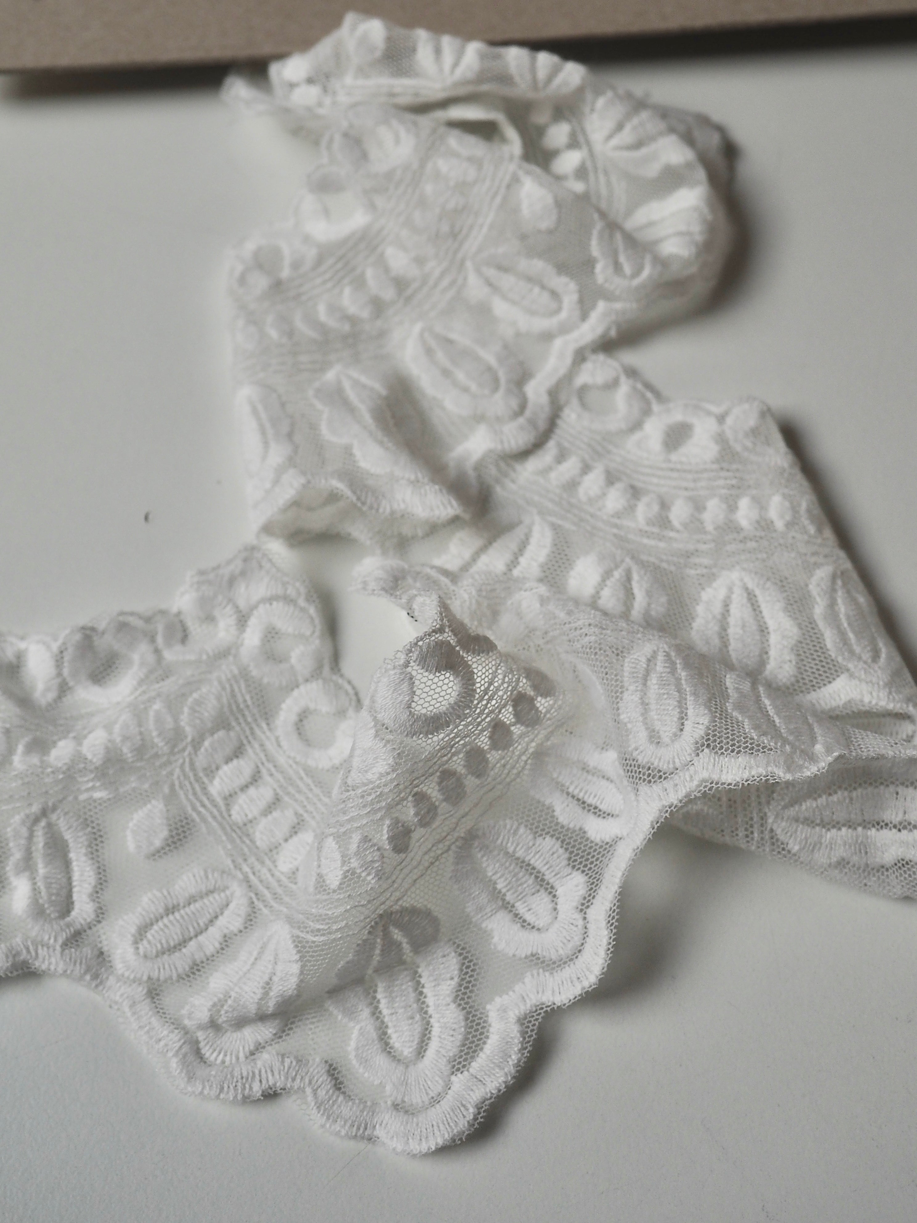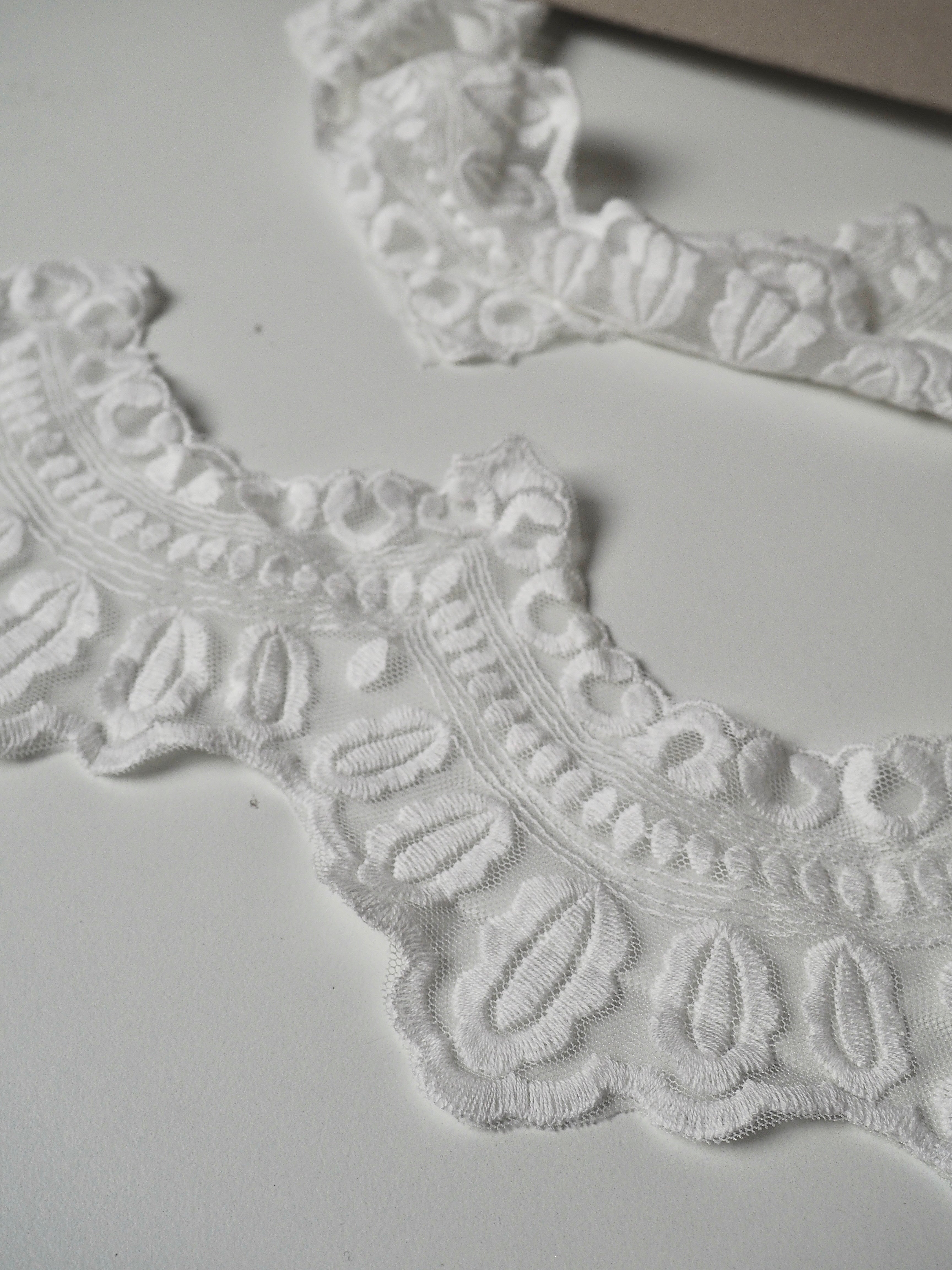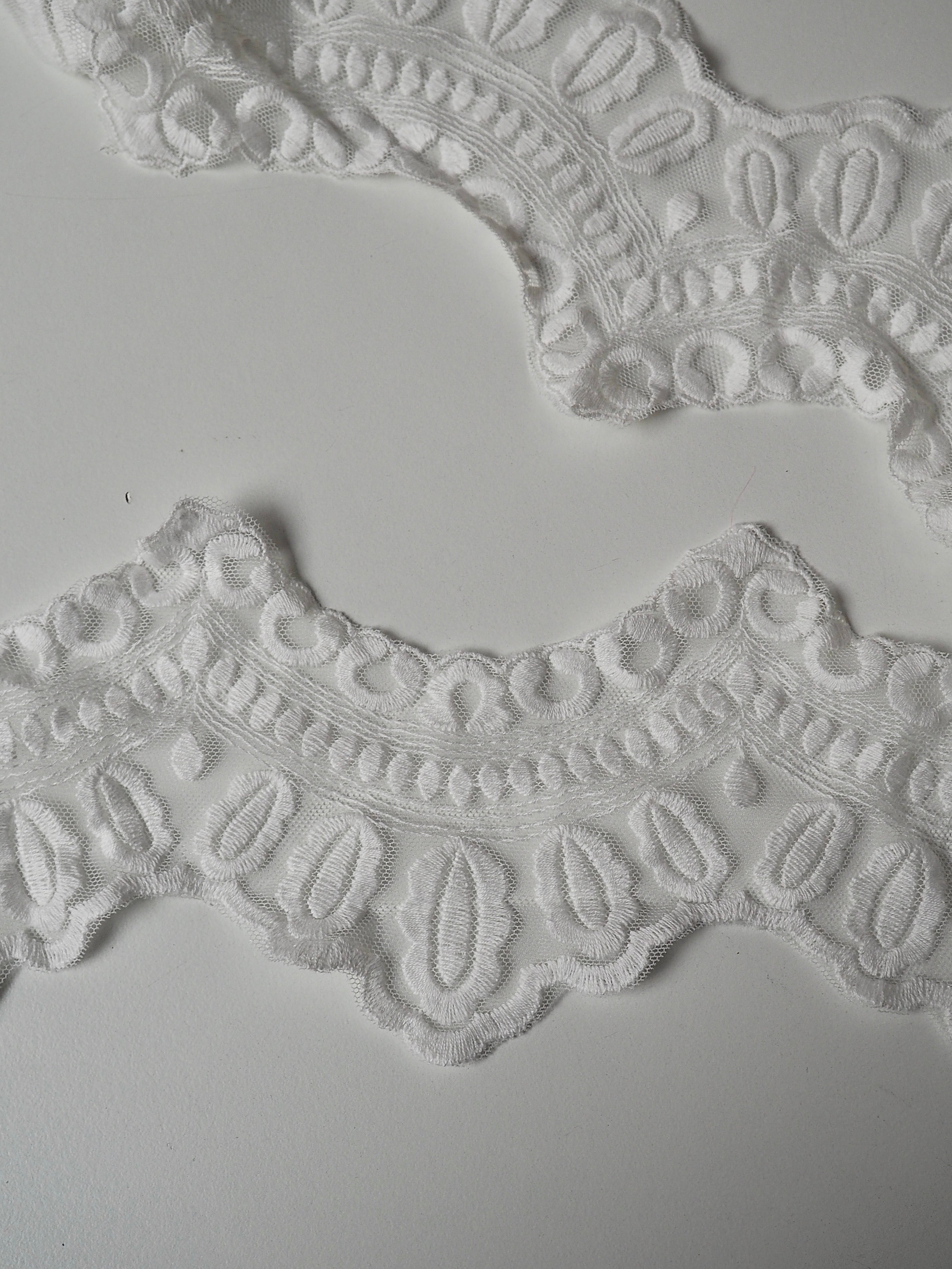 This is a scalloped trim with beautiful abstract floral motifs. It is made of embroidered cotton on a soft tulle base. Would look great as an inlay or could be appliquéd on. Perfect for garments or lingerie, particularly bridal! All our trim is deadstock left over from when a designer has finished sampling their collection.