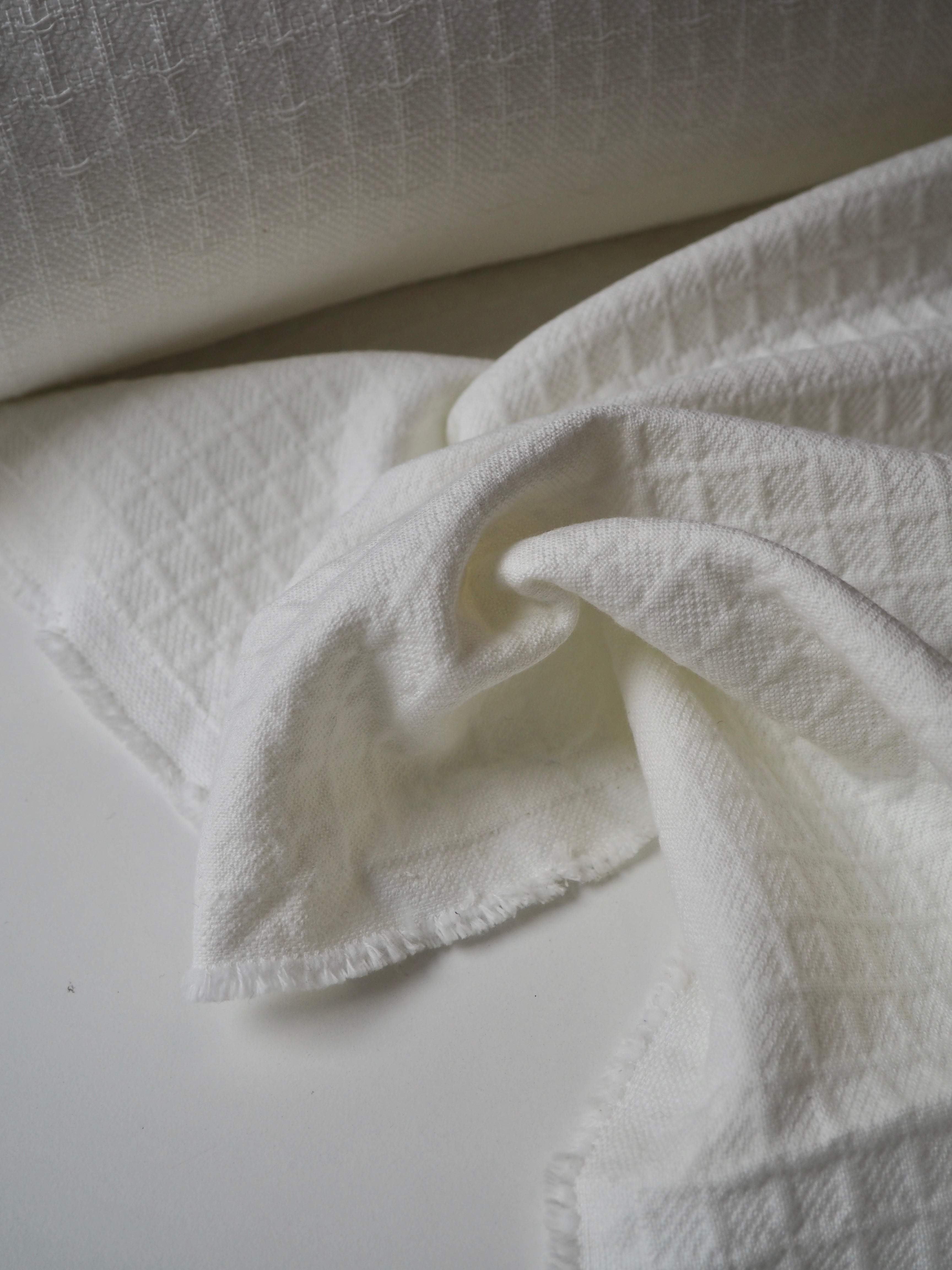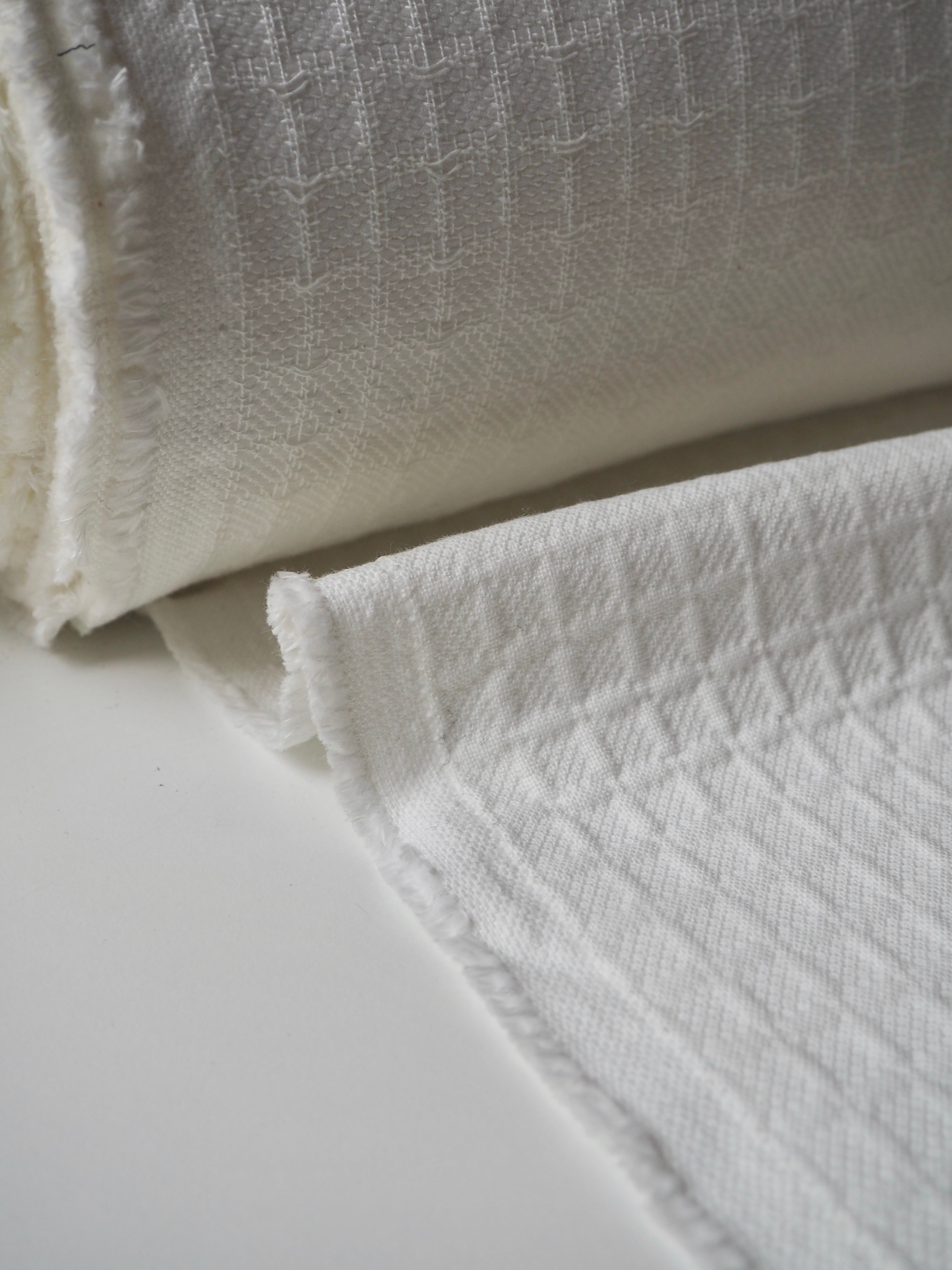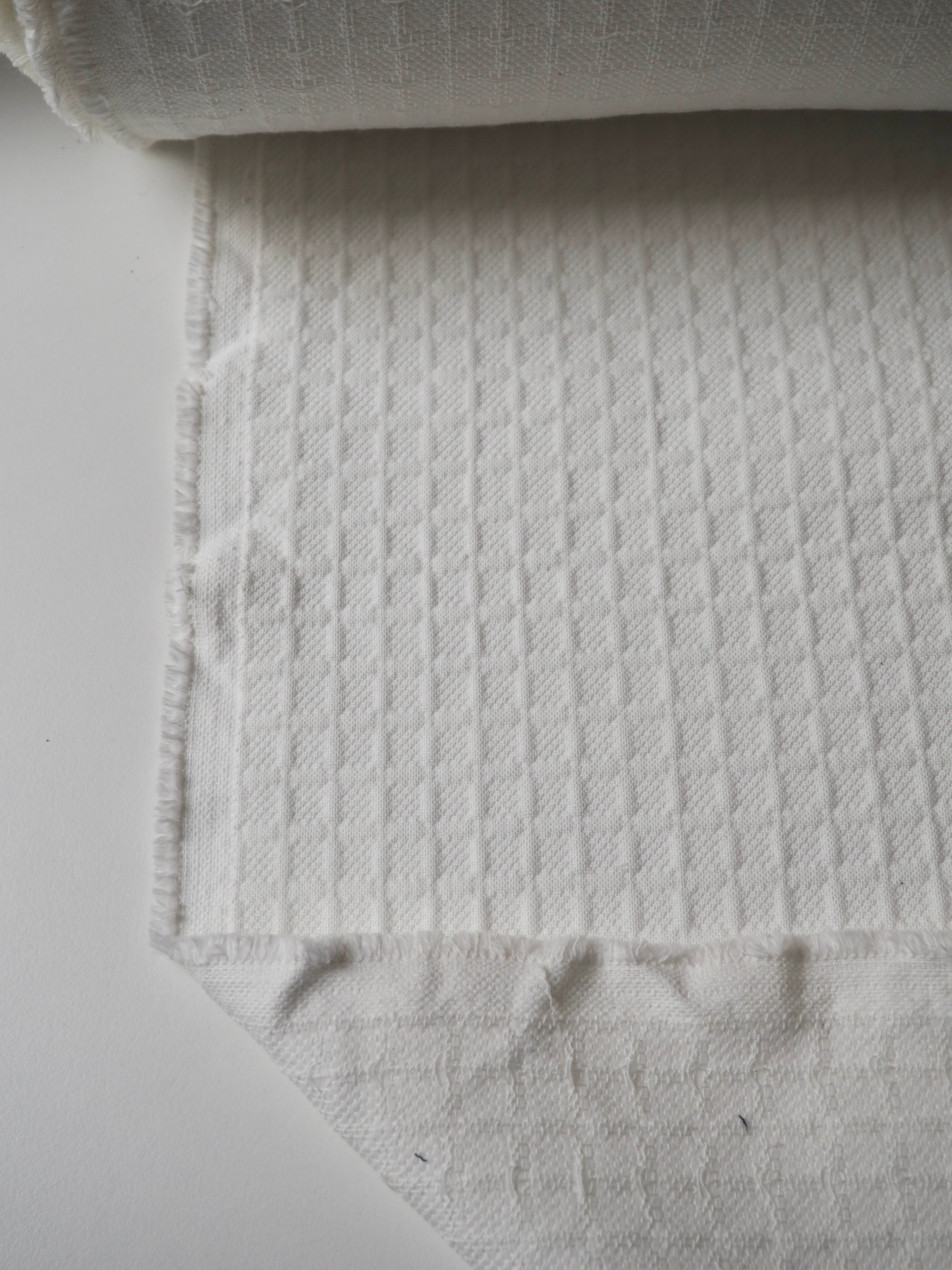 This ex-designer fabric is a cloqué. It's a white, slightly ivory, colour, in a subtle gridded cloqué weave. It has a bouncy, soft handle. It's light to medium weight and opaque, with a beautiful gentle structure. Would love to see a dress or top!