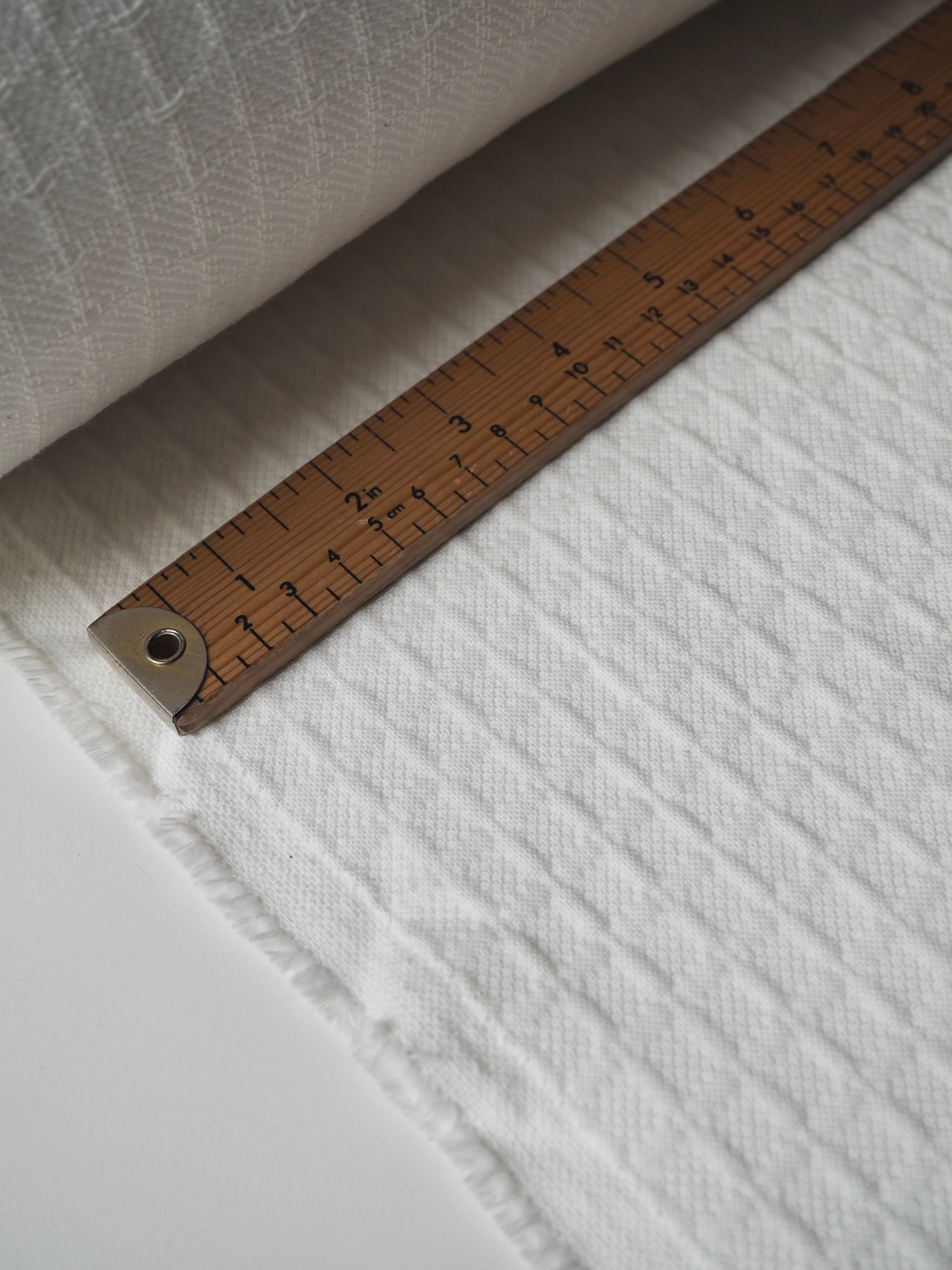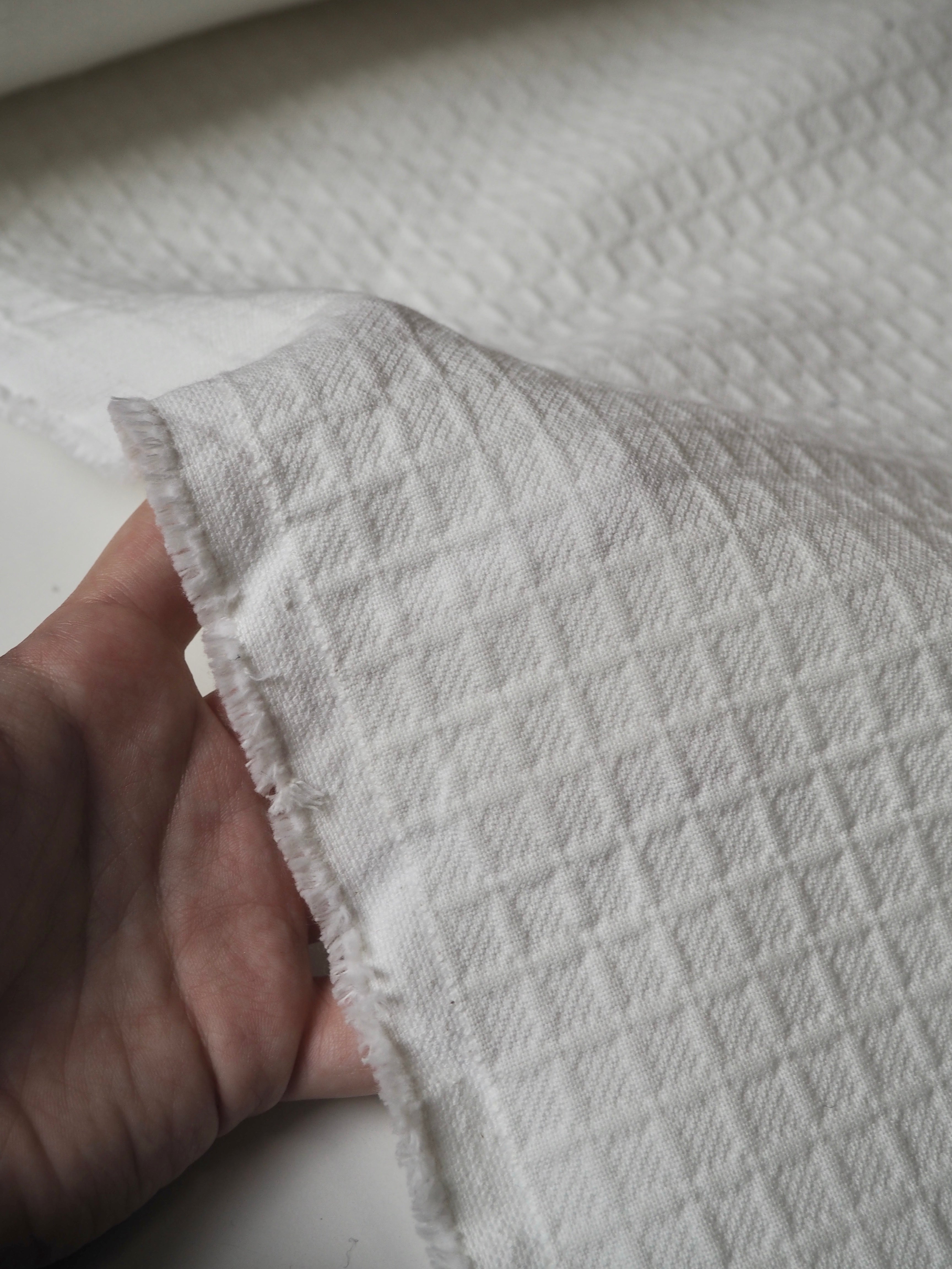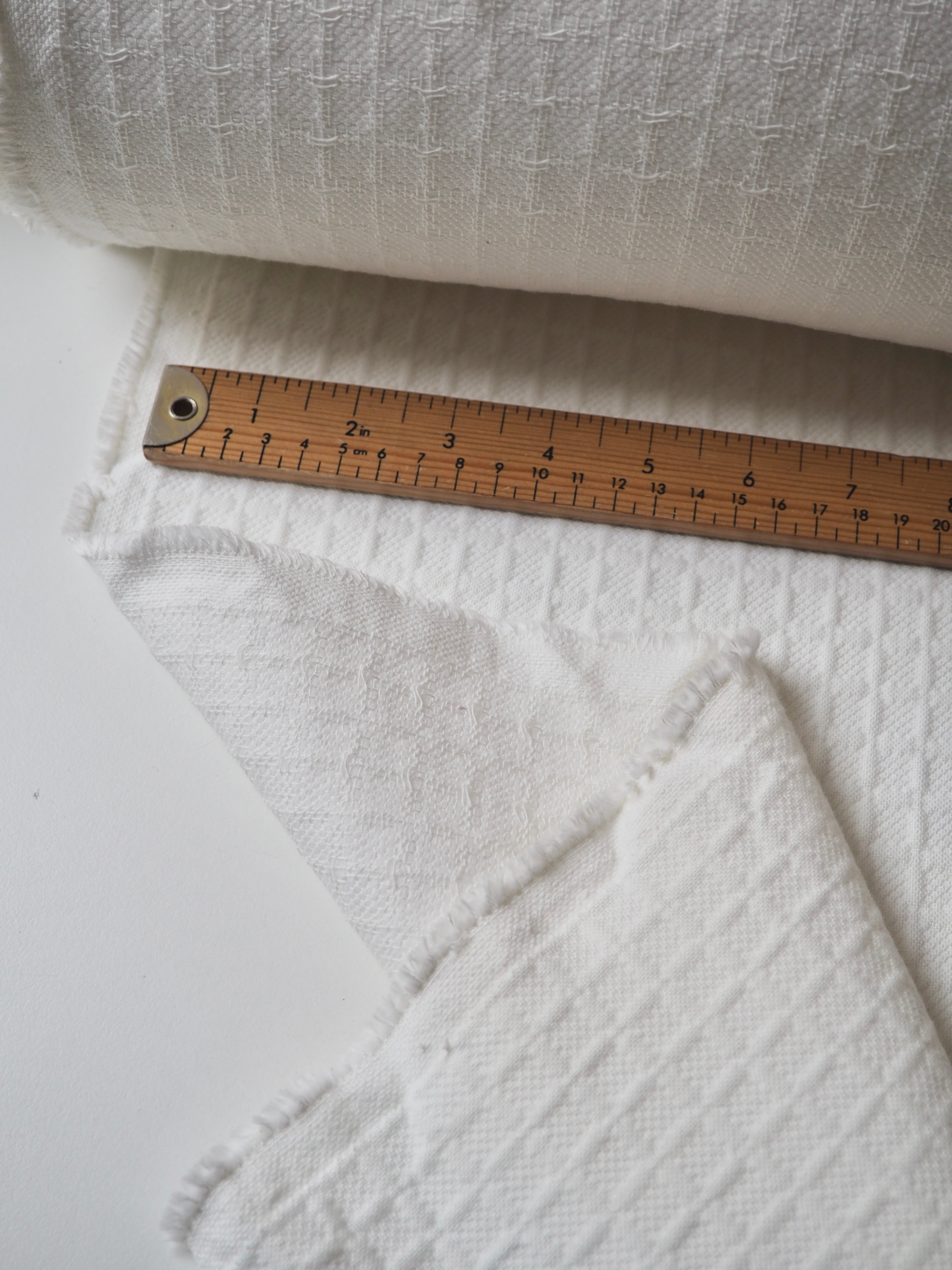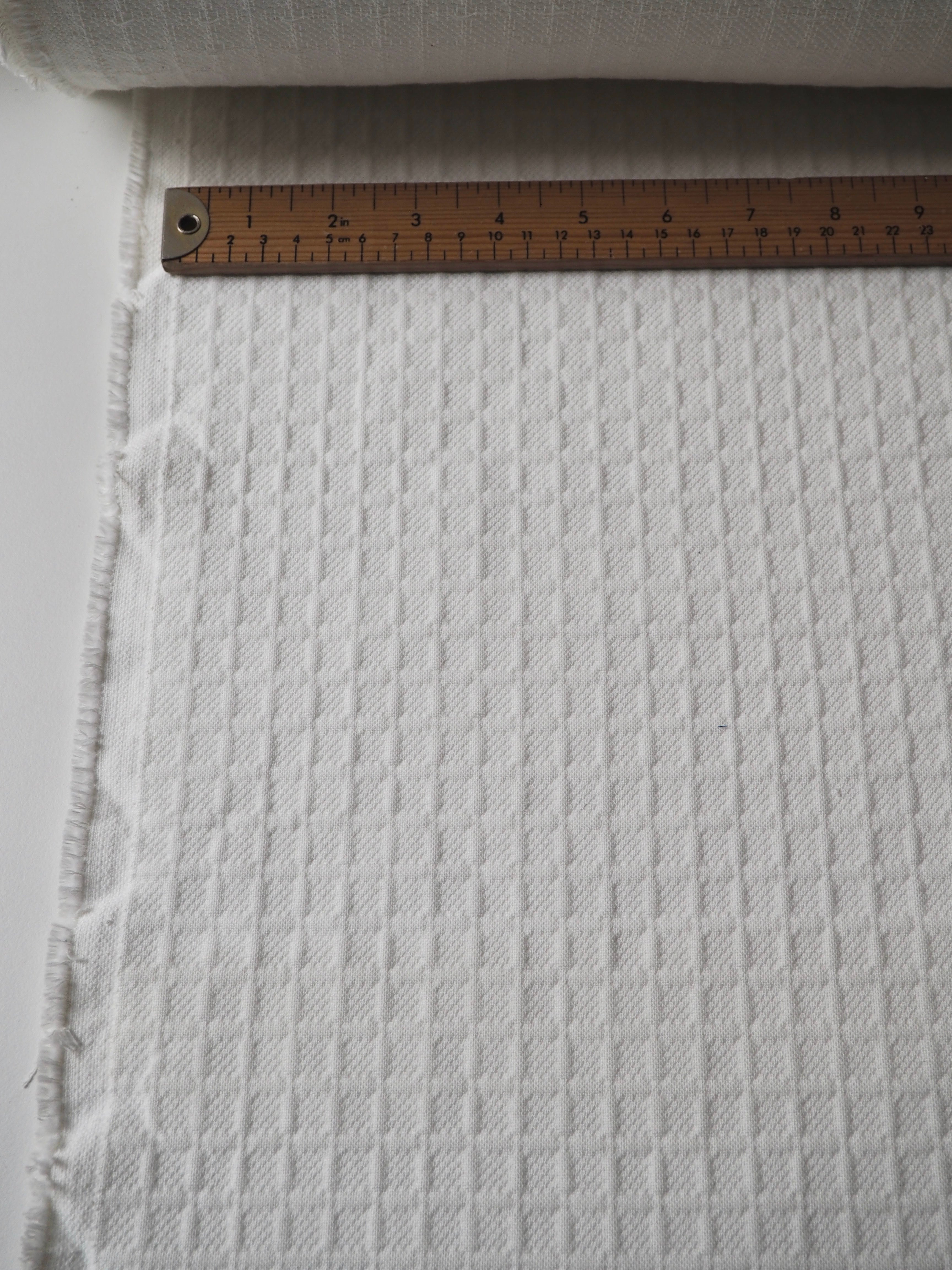 This ex-designer fabric is a cloqué. It's a white, slightly ivory, colour, in a subtle gridded cloqué weave. It has a bouncy, soft handle. It's light to medium weight and opaque, with a beautiful gentle structure. Would love to see a dress or top!