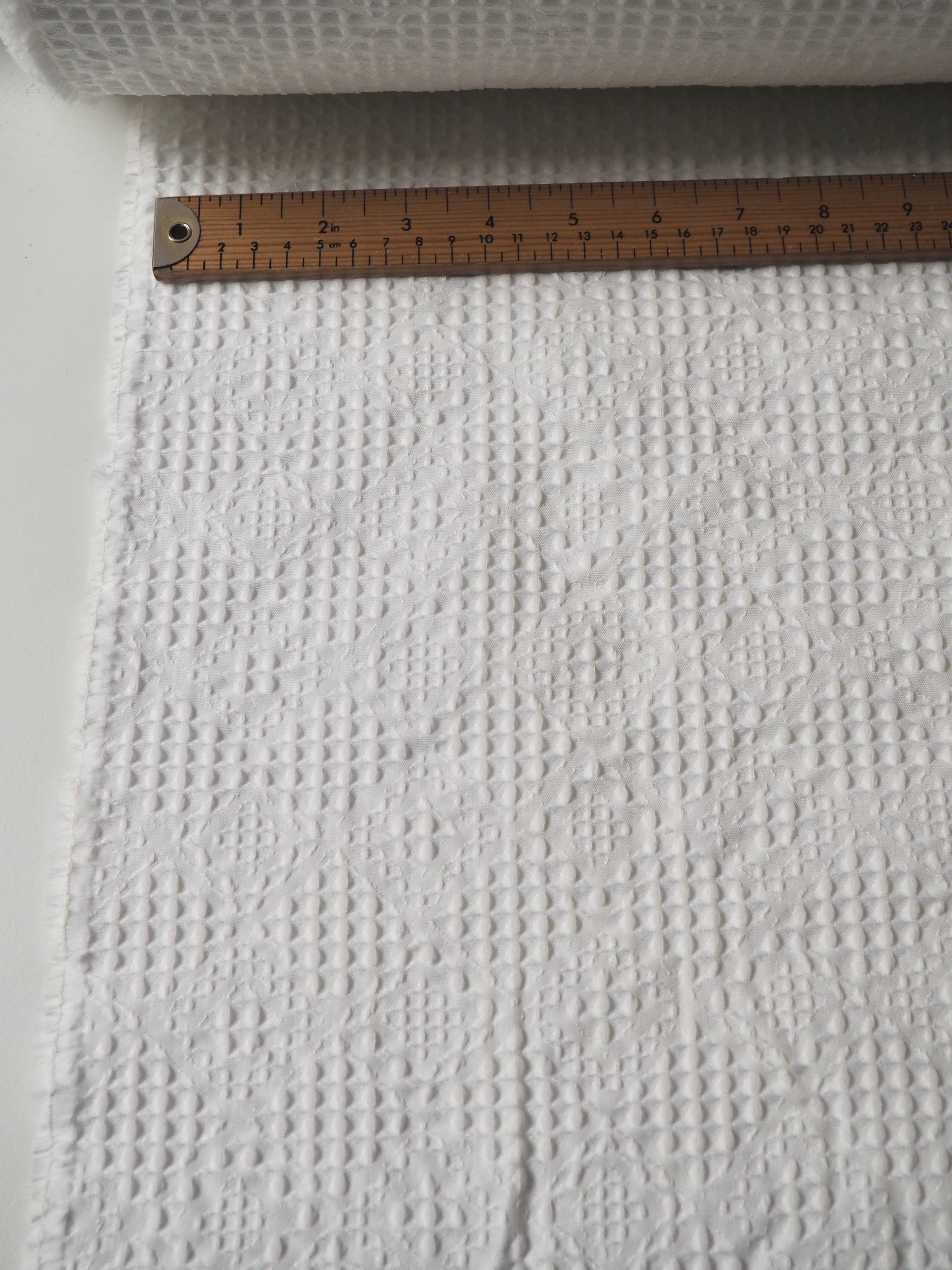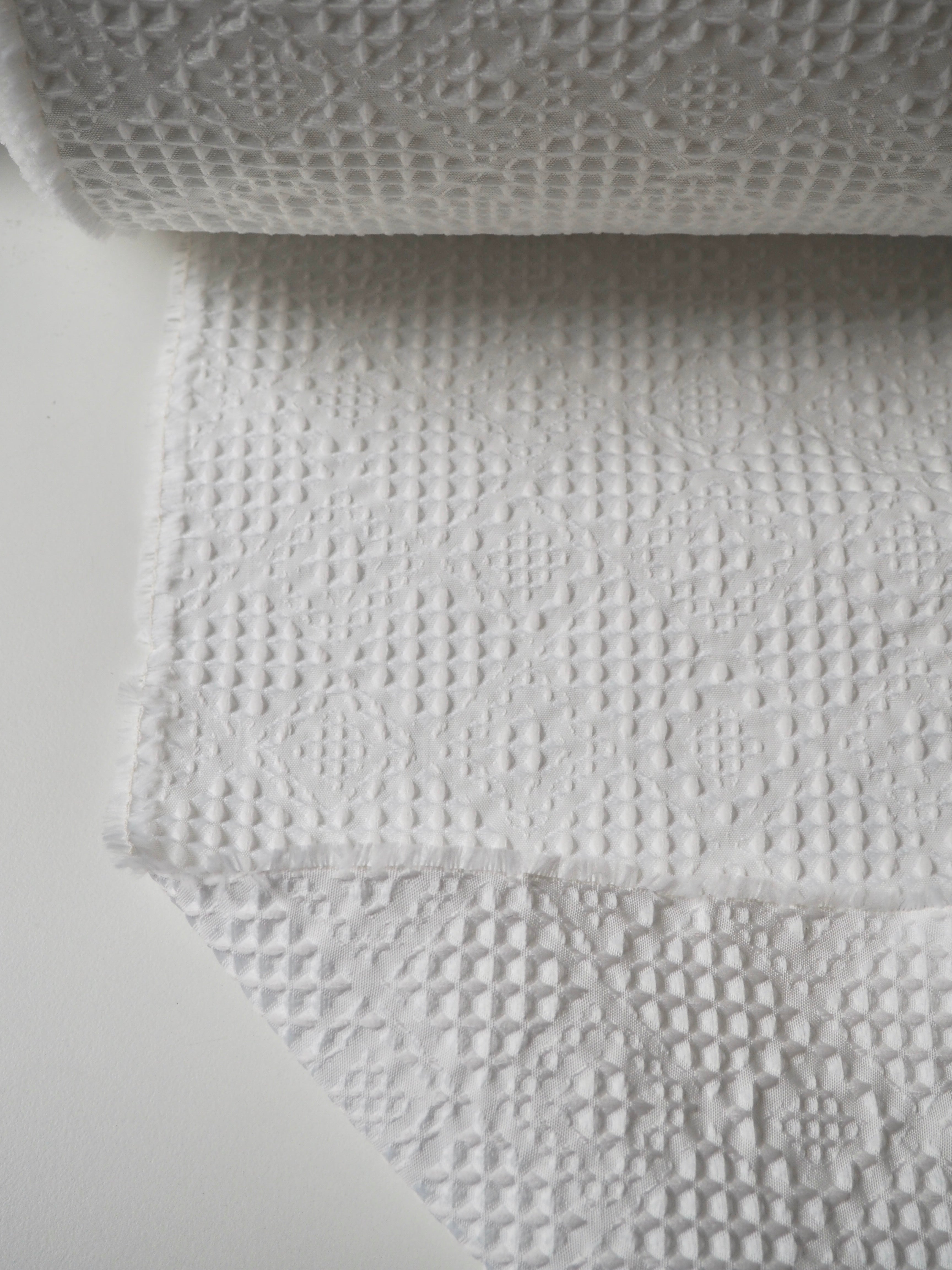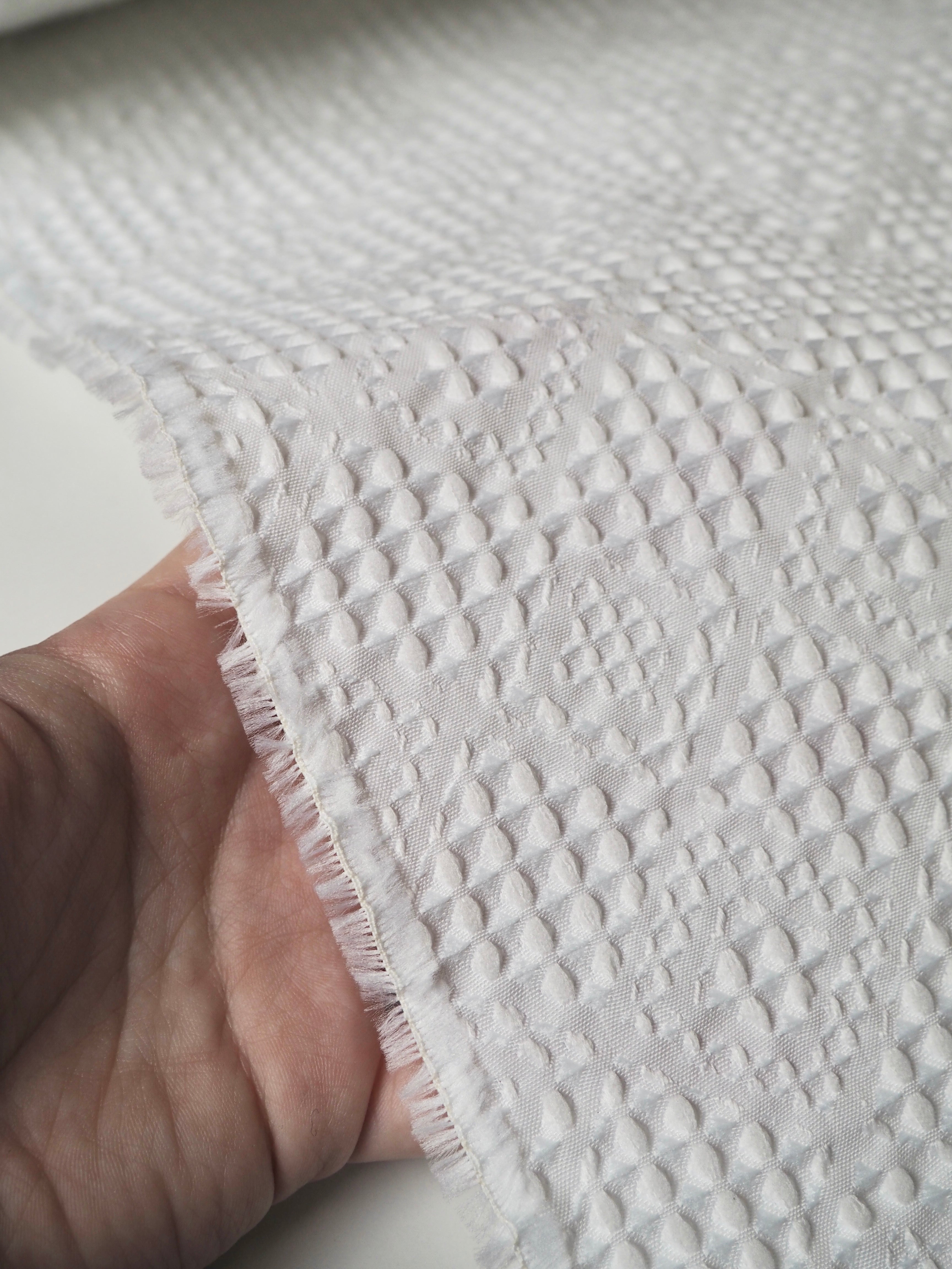This ex-designer fabric is a cloqué. It's a gentle white colour, in a cottage-core inspired quilted weave. It has a lattice looking design with a bouncy, soft handle. It's lightweight and opaque, with a beautiful gentle structure. Would love to see a dress or top!