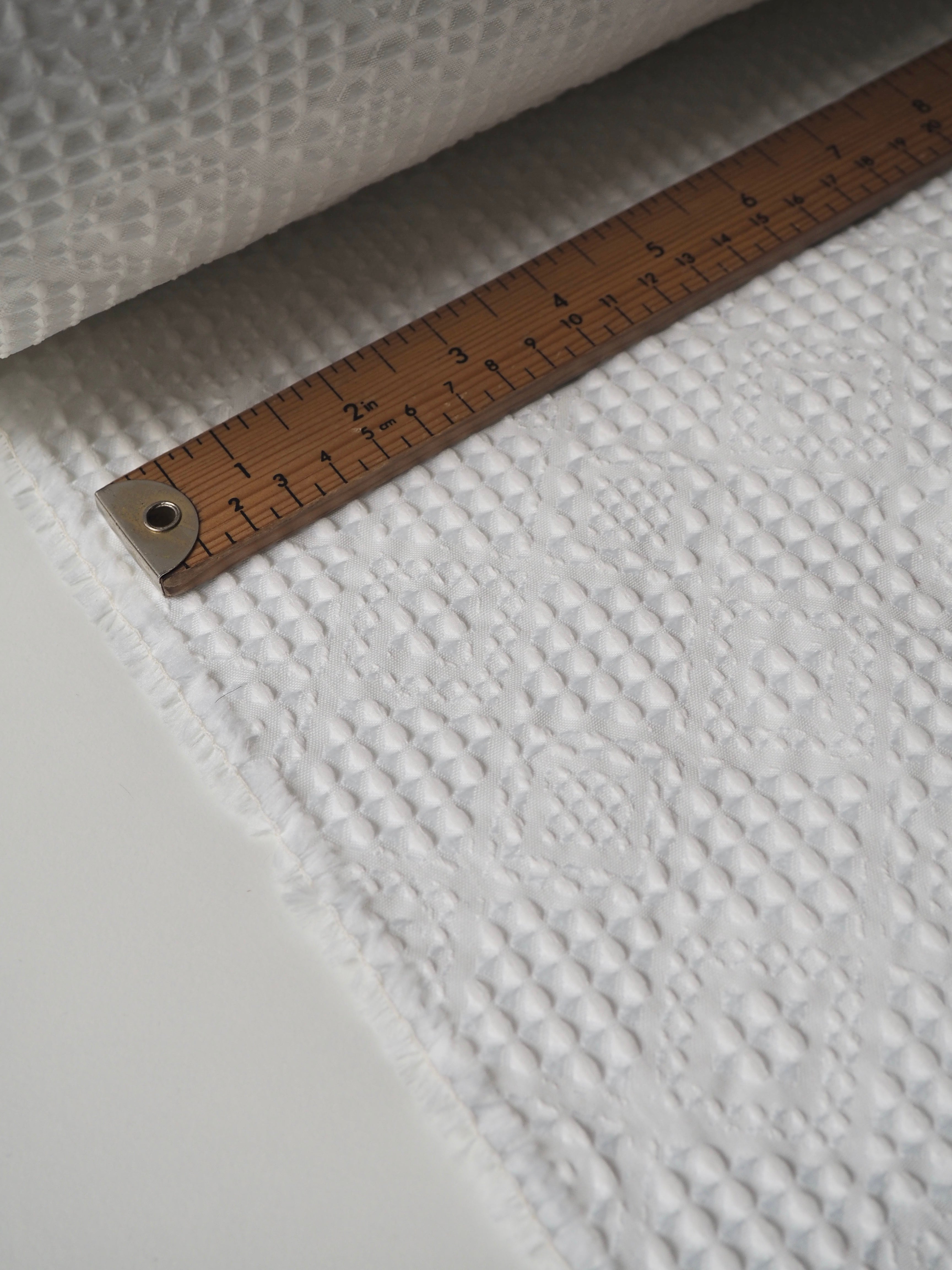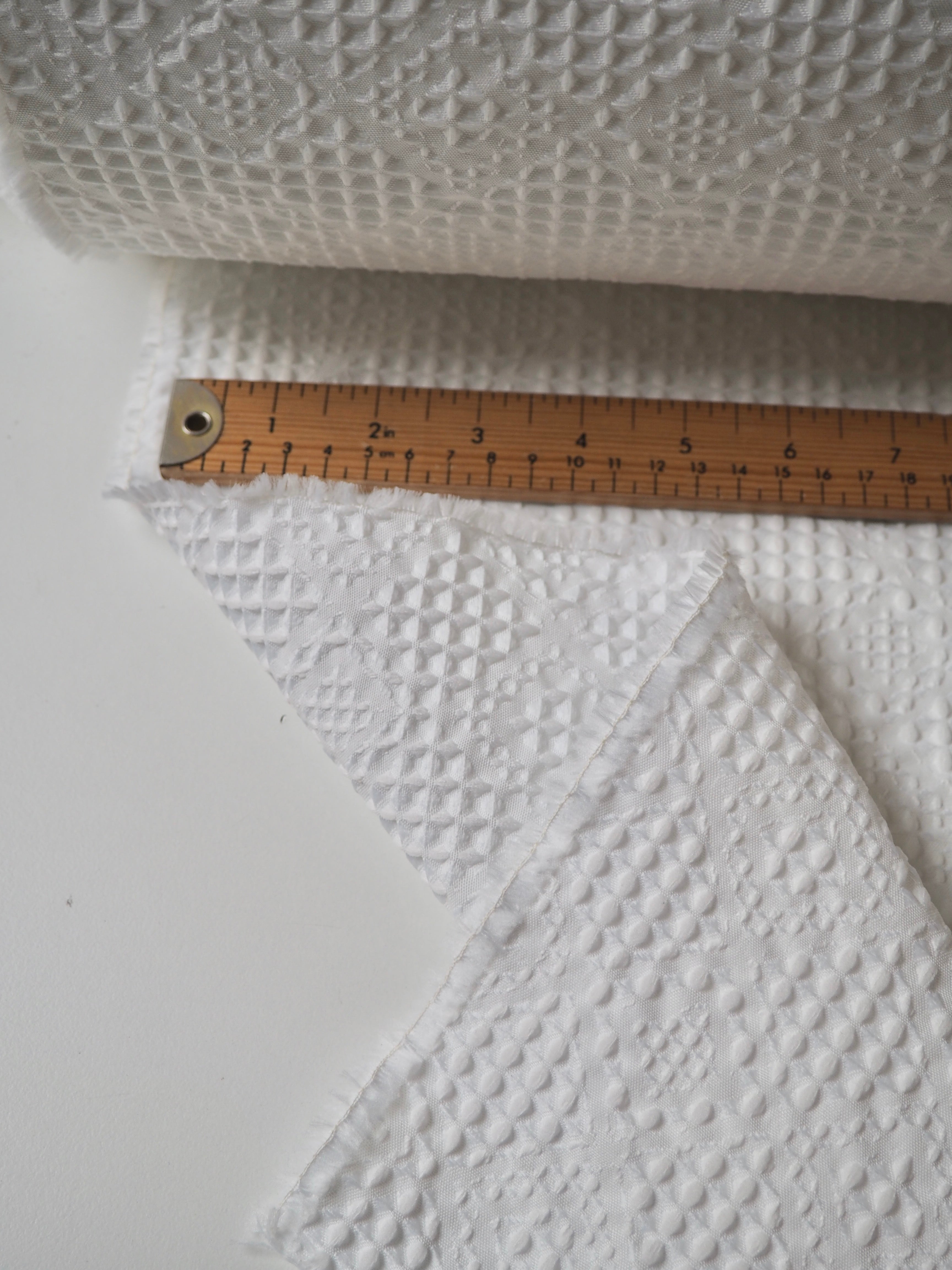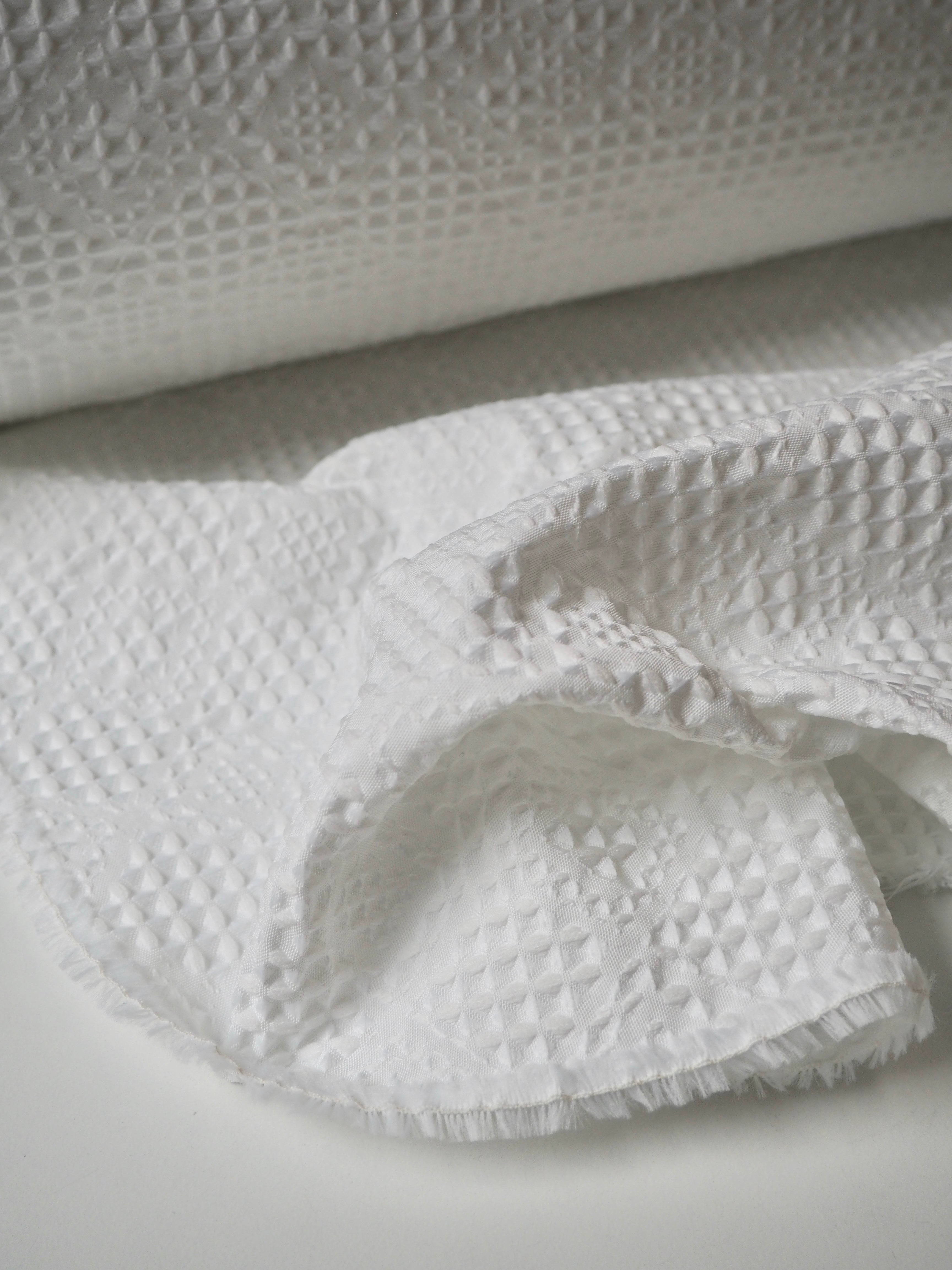 This ex-designer fabric is a cloqué. It's a gentle white colour, in a cottage-core inspired quilted weave. It has a lattice looking design with a bouncy, soft handle. It's lightweight and opaque, with a beautiful gentle structure. Would love to see a dress or top!