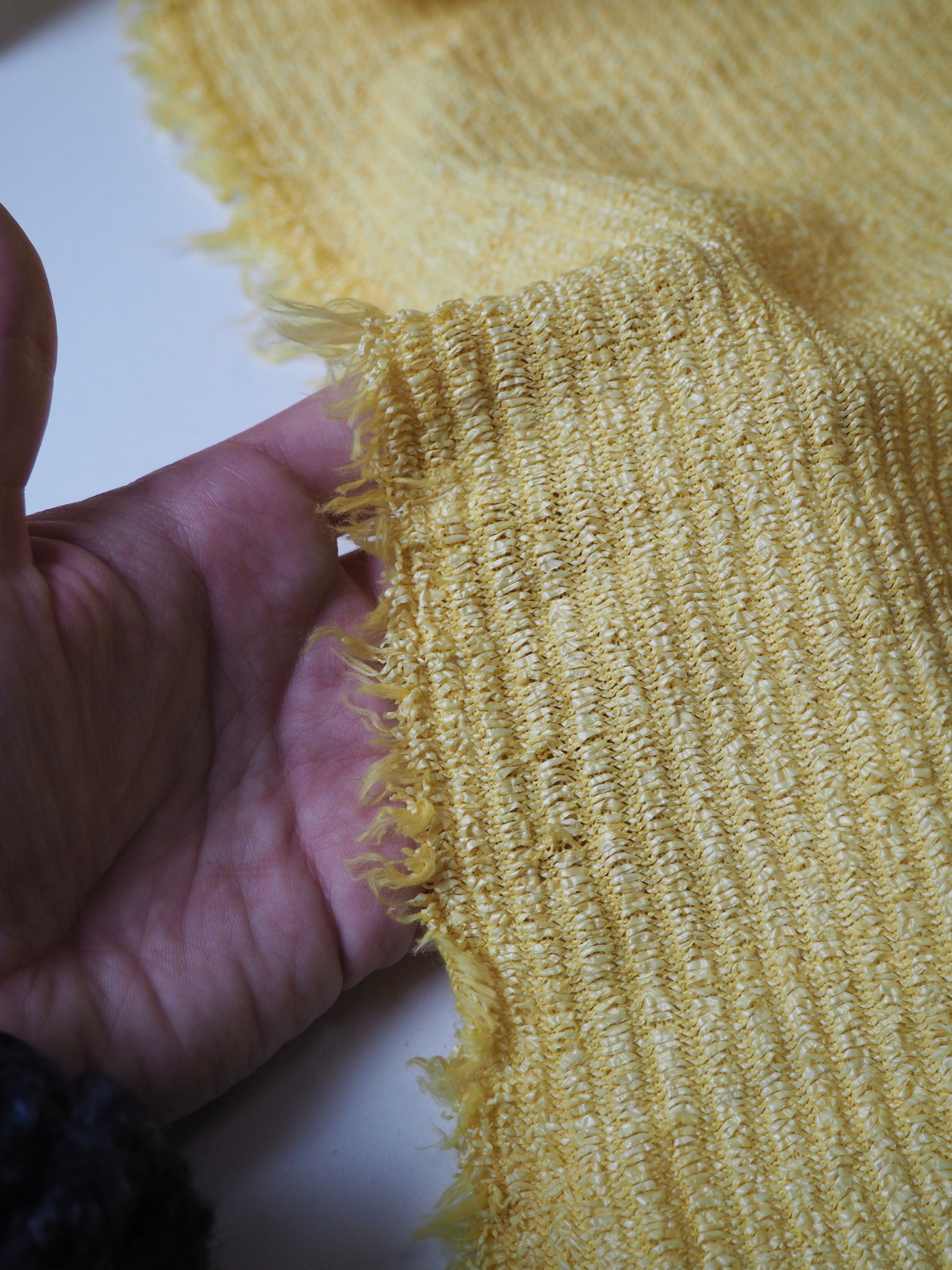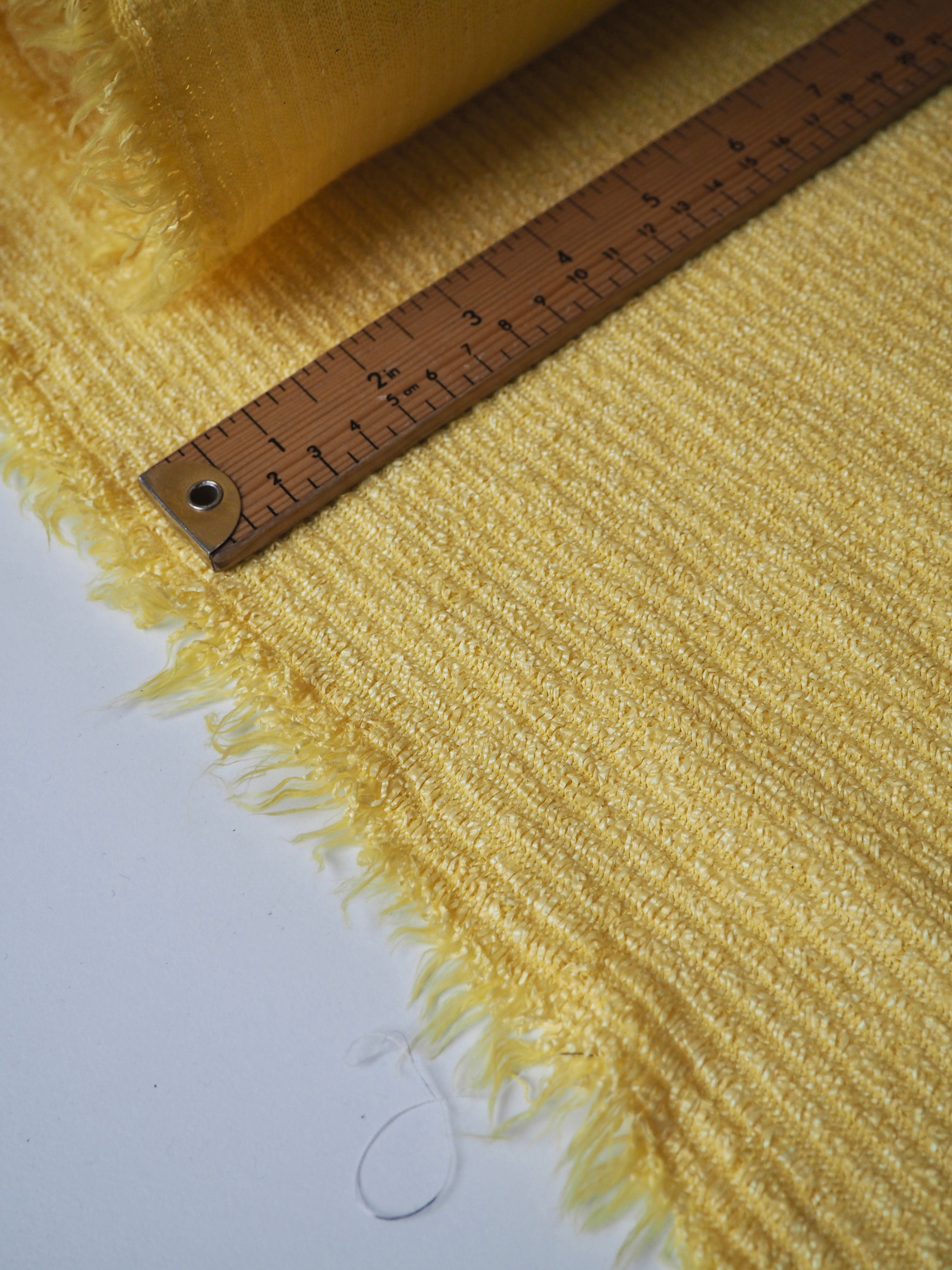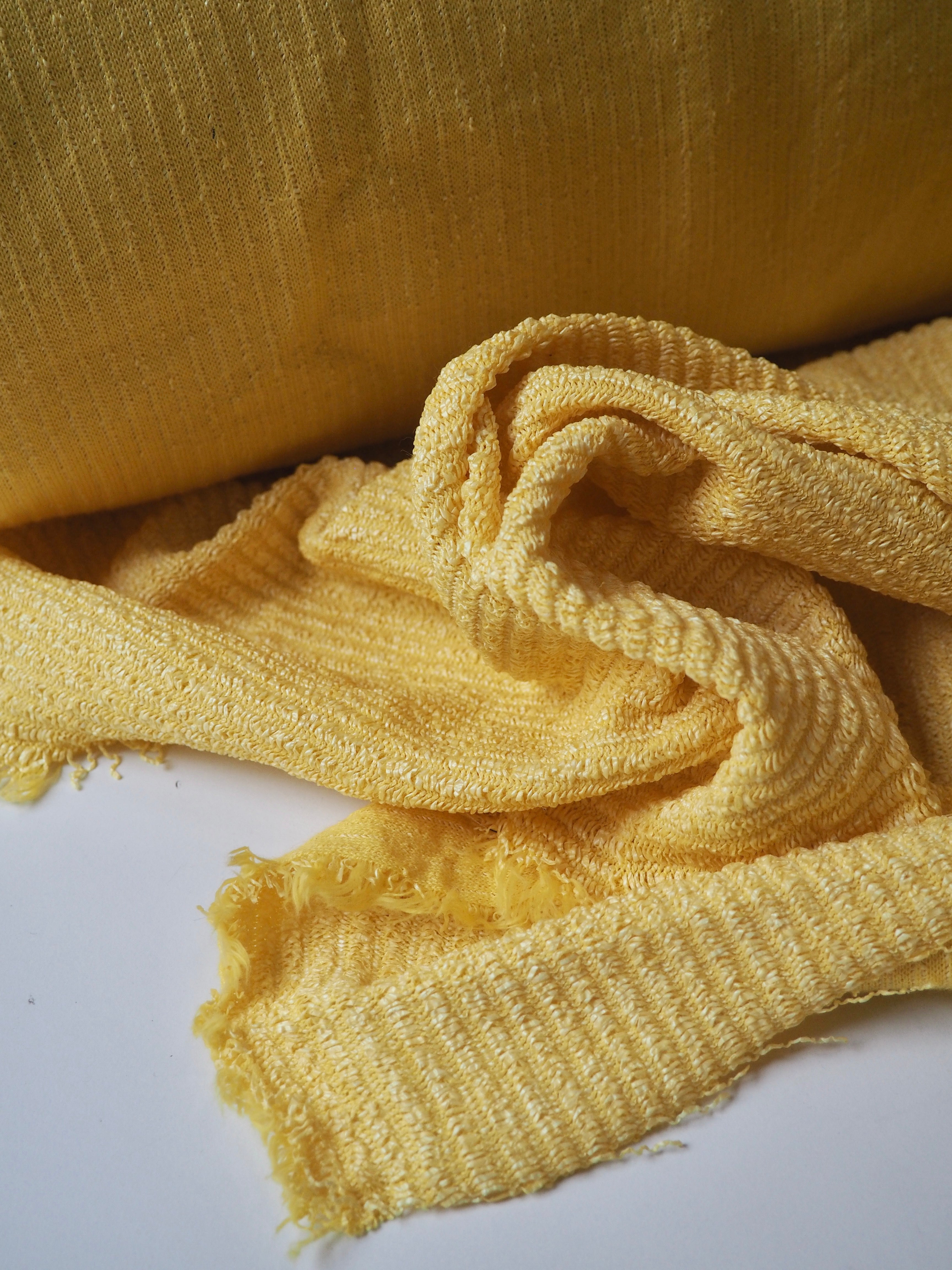 This ex-designer fabric is a unique jersey. It's a bright yellow shade, with a ribbed-looking stripe structure and raffia-like fibres woven in. It gives it a vibrant but unique colour and textured combination. Has a nice textured handle. Medium weight with approximately 20% stretch both ways and a lovely bouncy drape. Slightly sheer due to the mesh weave. Would make the perfect holiday dress or top!