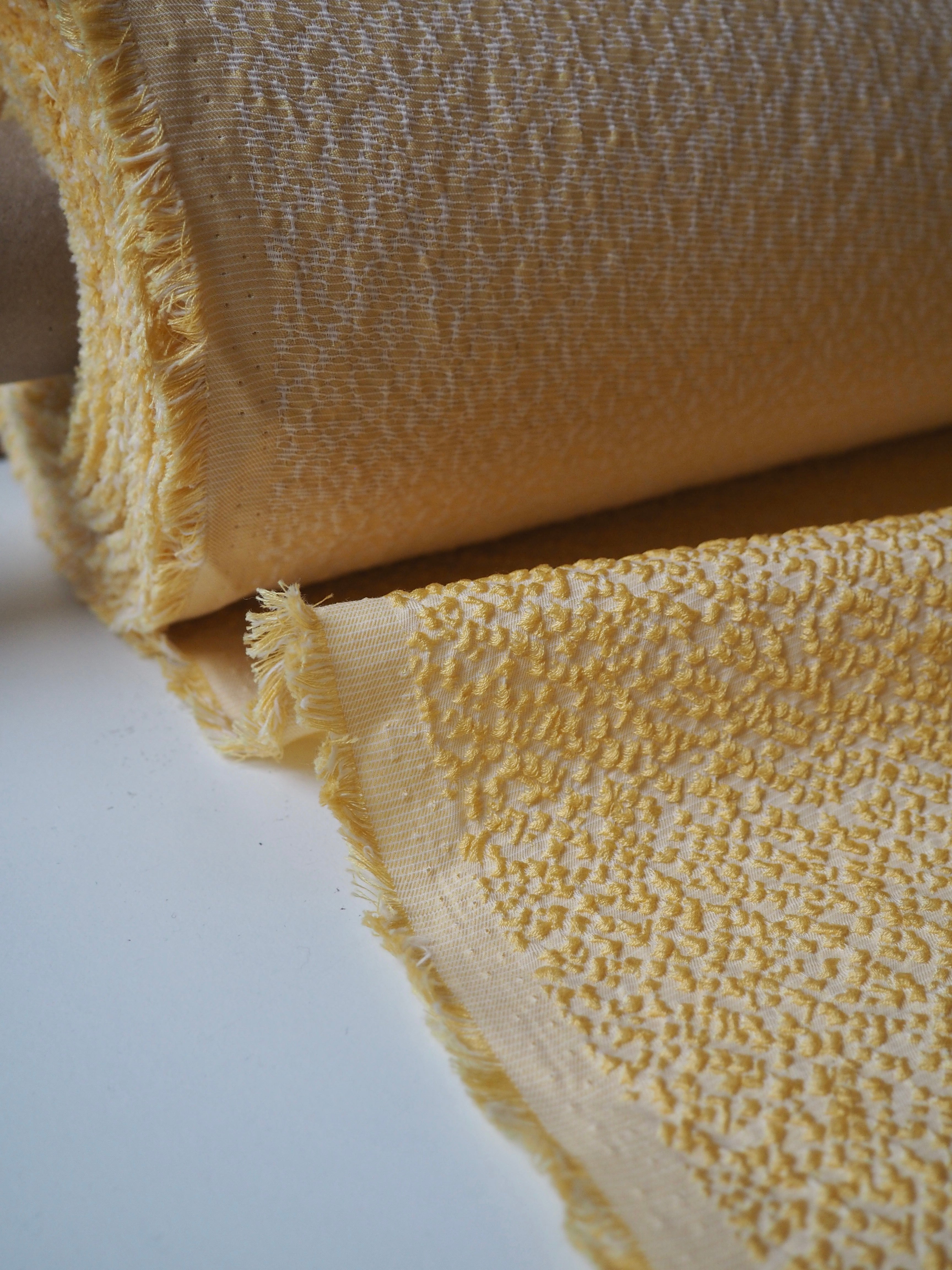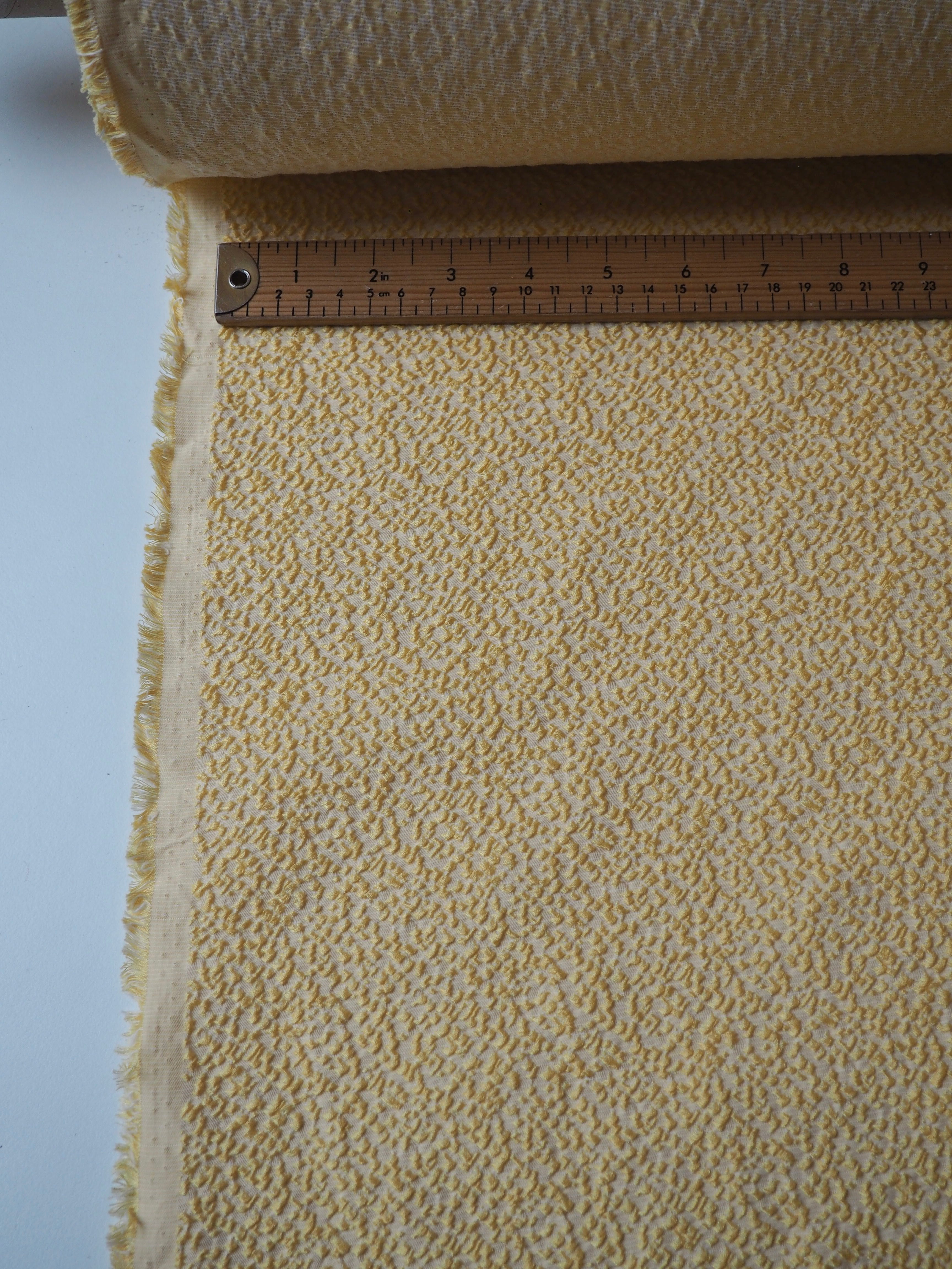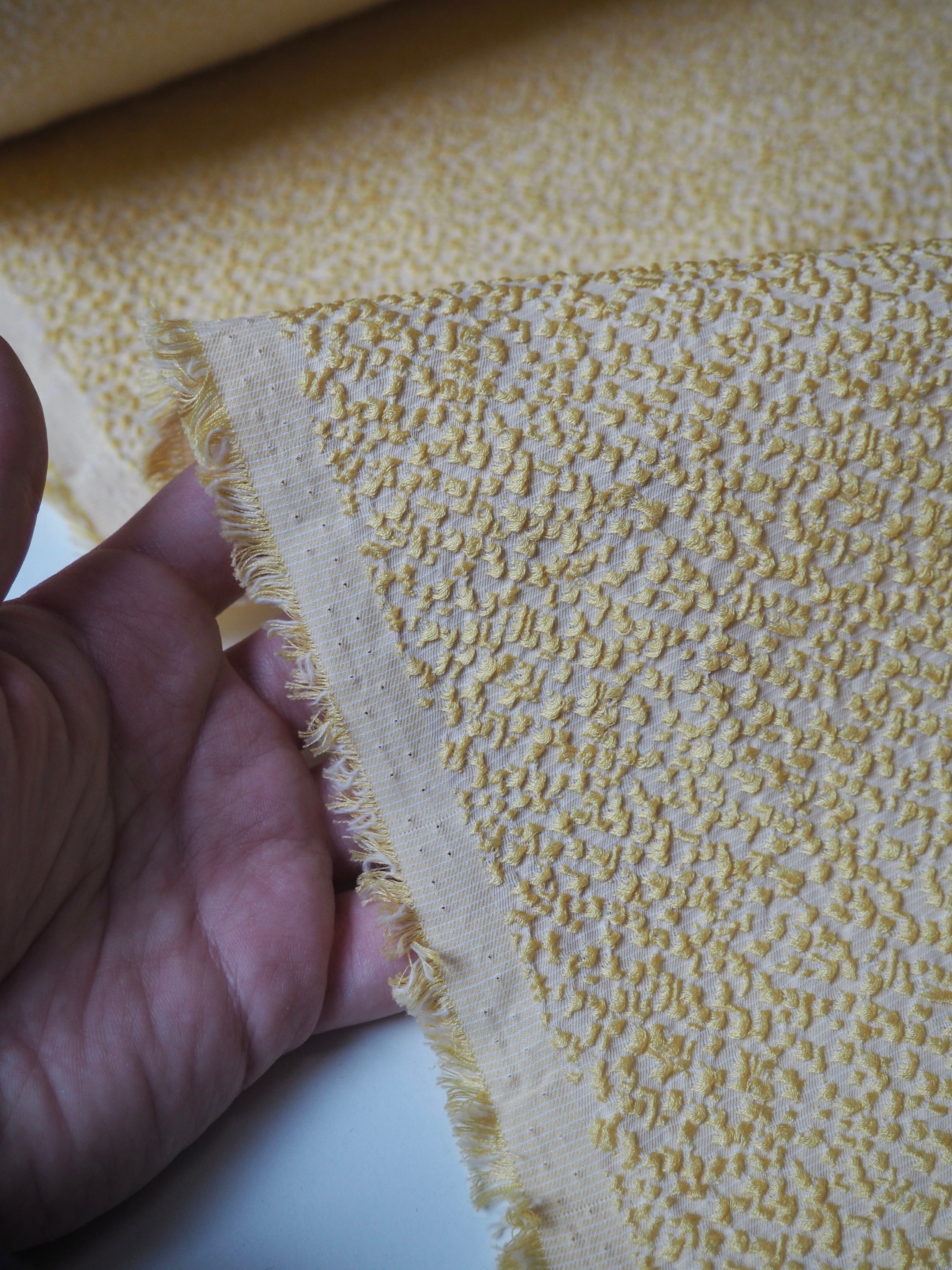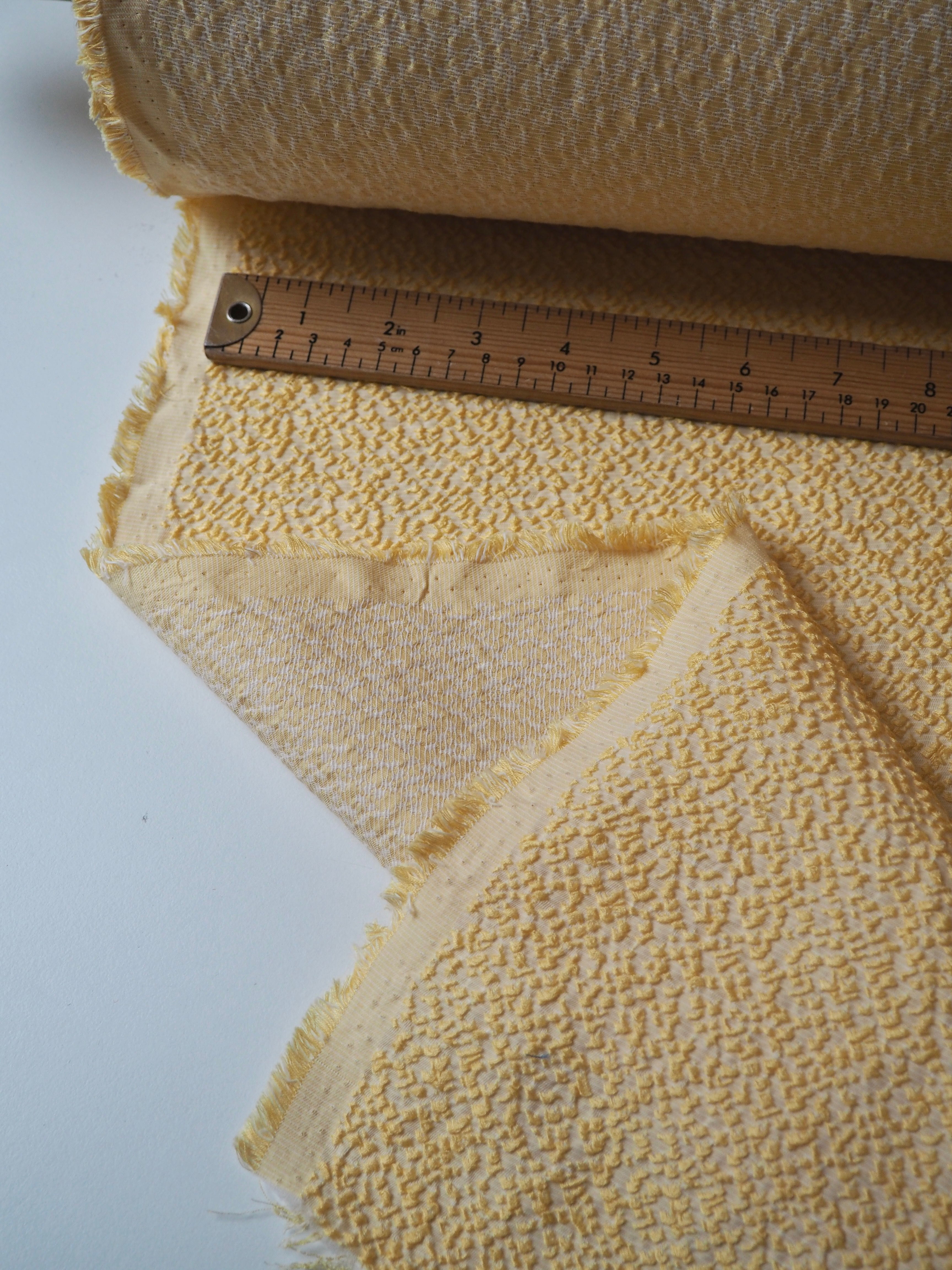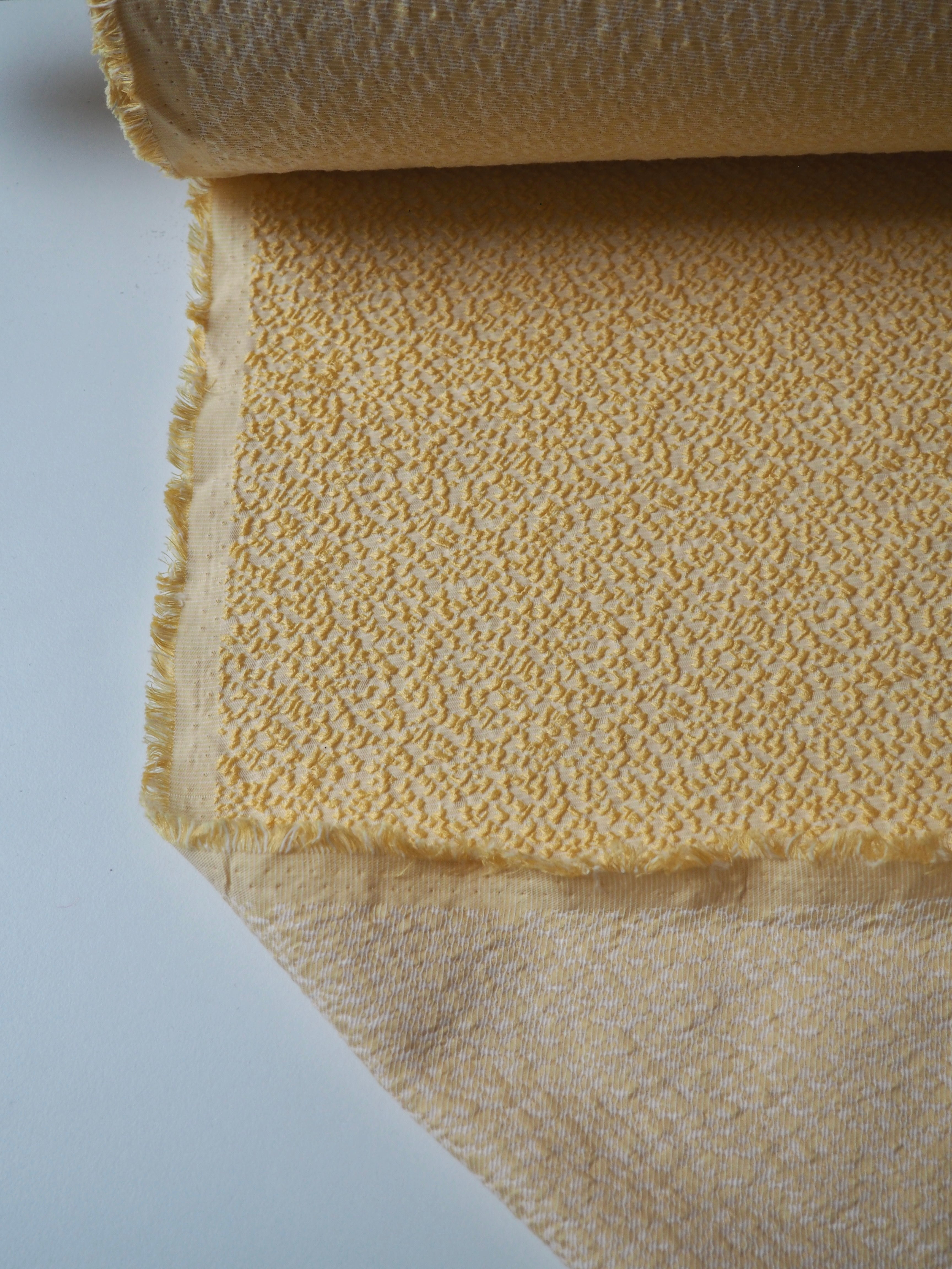 This ex-designer fabric is a jacquard. It has a textured, bumpy, raised topside that's quite interesting, in a cream and yellow mix. Gives it an interesting depth! It's medium weight with a soft and luxurious handle. Has a gentle 10% stretch. Opaque with a good structure to play with. Has a sheen finish as well. Would be great as a top or dress!